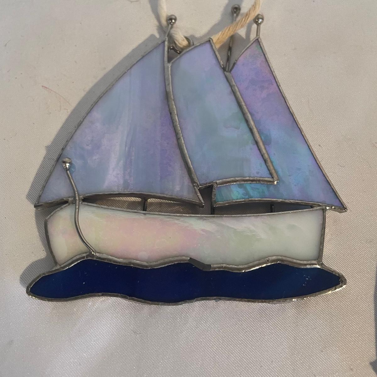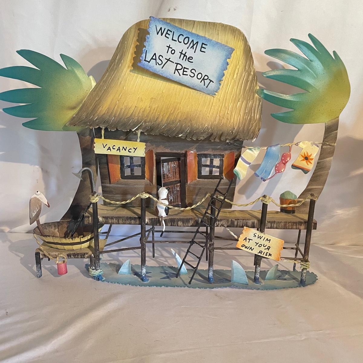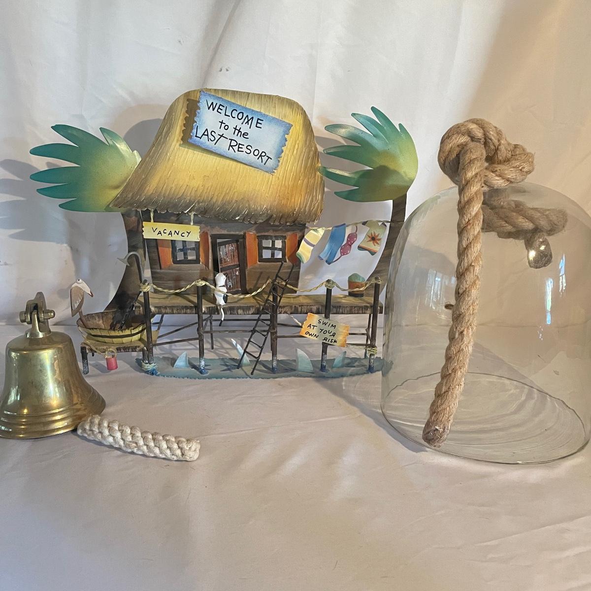 This salty assortment of home decor has a seafarer’s theme! The adorable metal “˜Welcome to the last resort’ can stand or be hung. The large glass cloche has a rope handle. The bell with synthetic rope handle is solid brass. Lot also includes a set of coasters and two small stained glass ships.