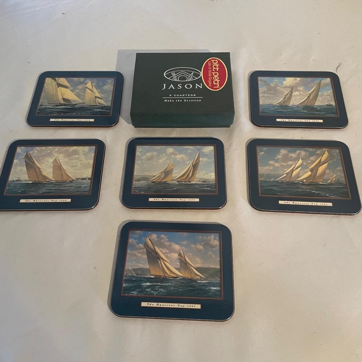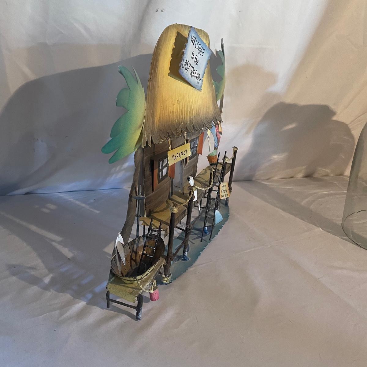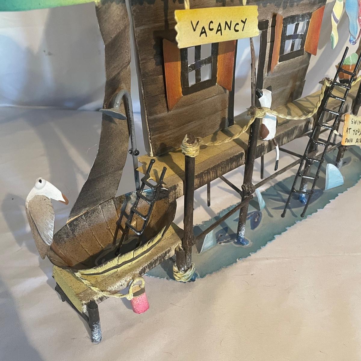 This salty assortment of home decor has a seafarer’s theme! The adorable metal “˜Welcome to the last resort’ can stand or be hung. The large glass cloche has a rope handle. The bell with synthetic rope handle is solid brass. Lot also includes a set of coasters and two small stained glass ships.