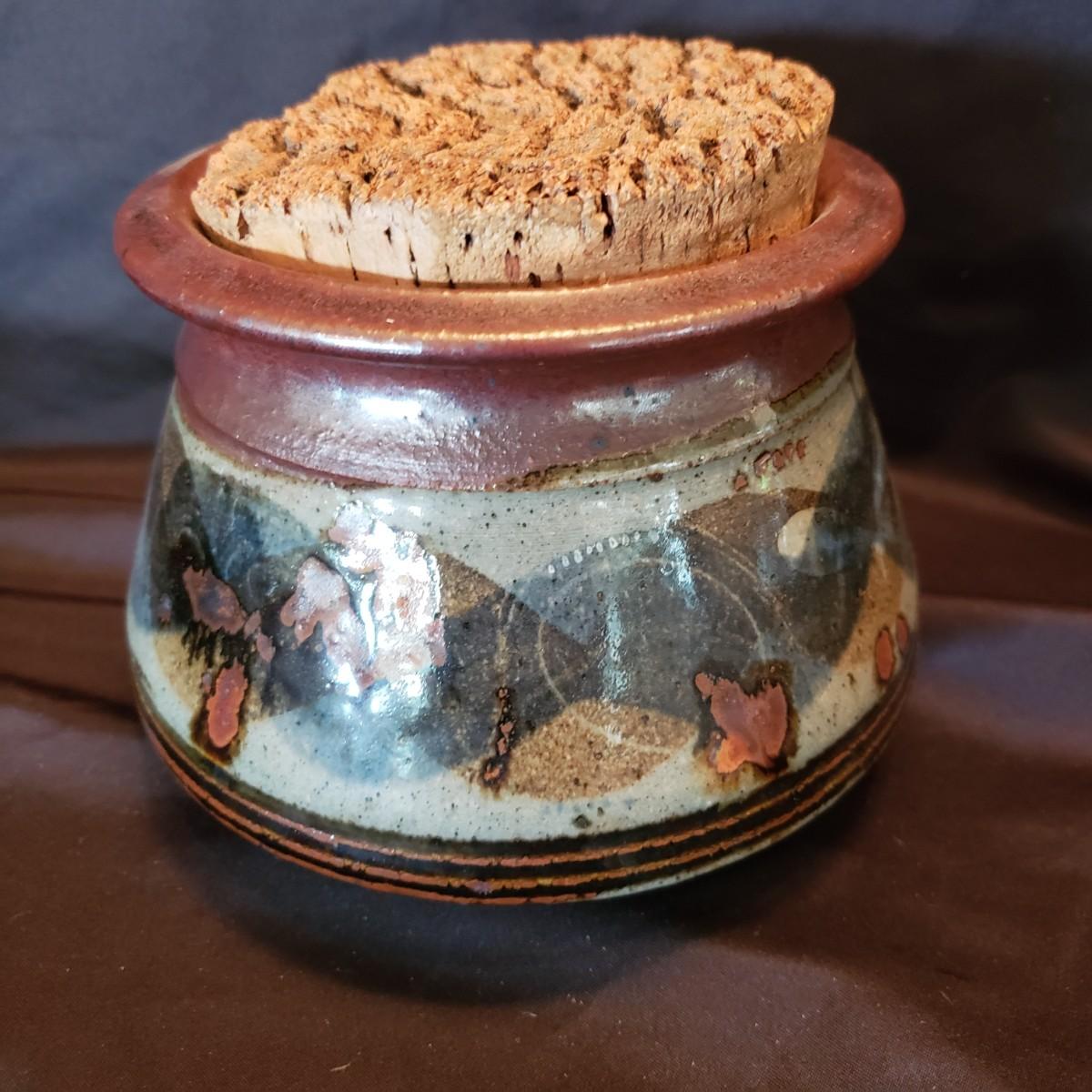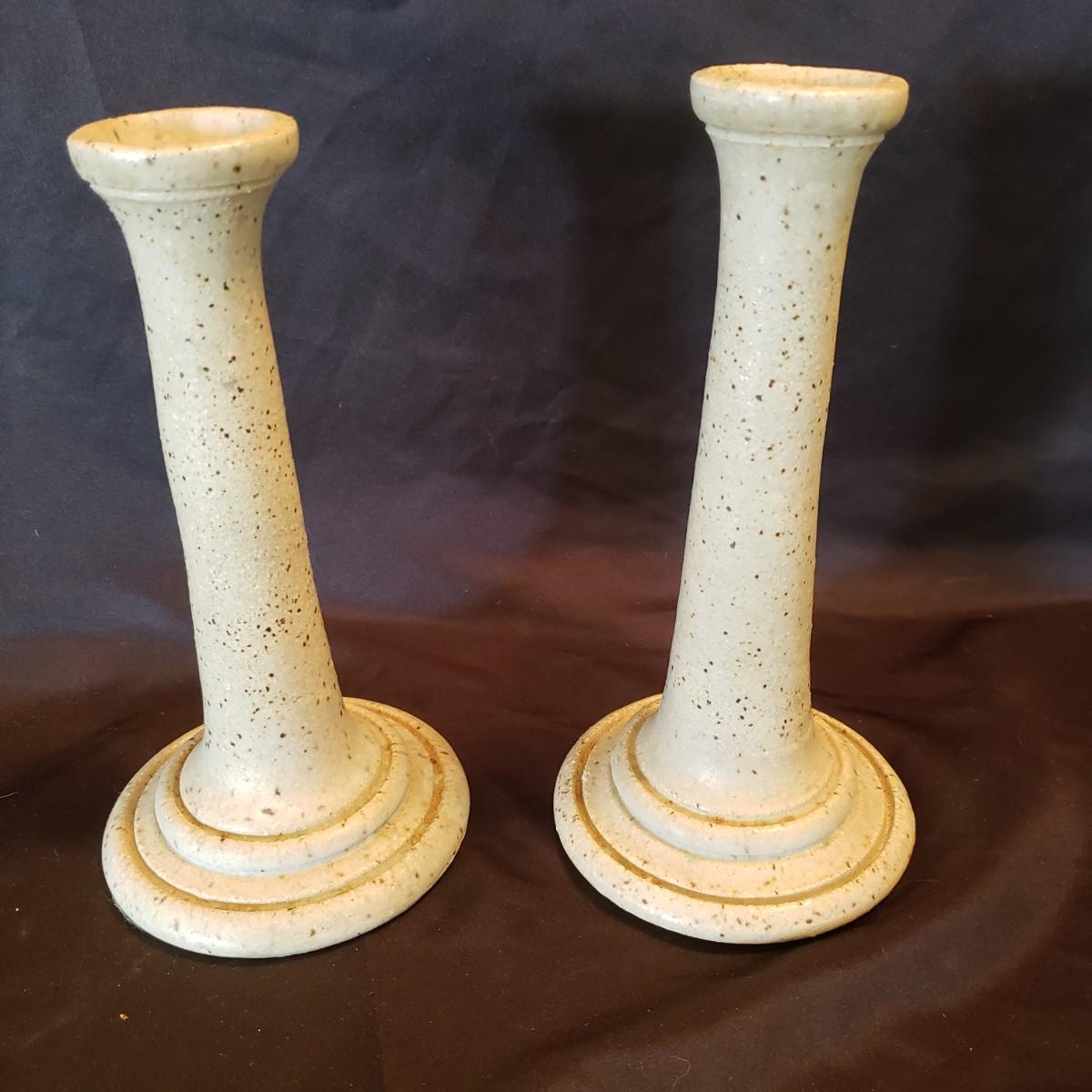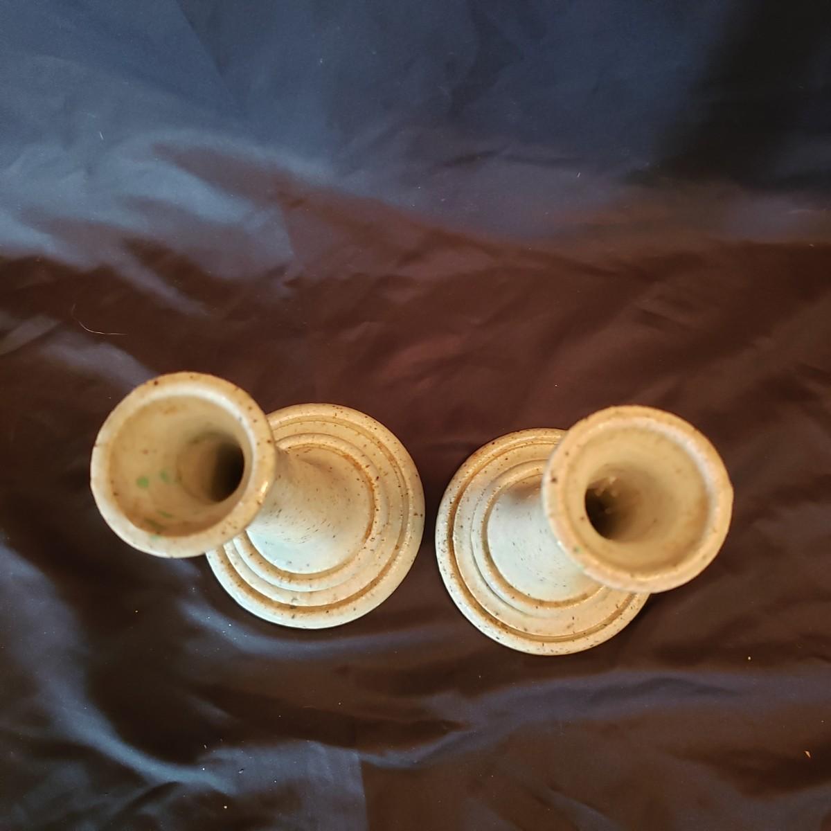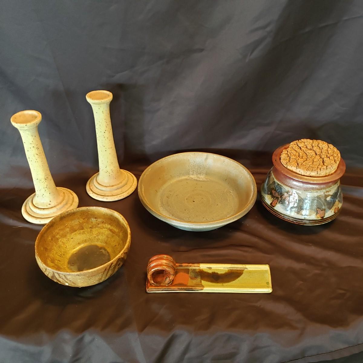 This lot contains five pottery pieces. The corked bowl has a cut out the rim for a spoon or ladle and measures 6" x 5" and is signed David '77. The Seagrove bowl measures 9" x 2" H. The butter server is stamped with an "S" on the back and measures 8" x 2". The two matching candlestick holders measure 4" x 8" and the artists name is cover by the green felt.