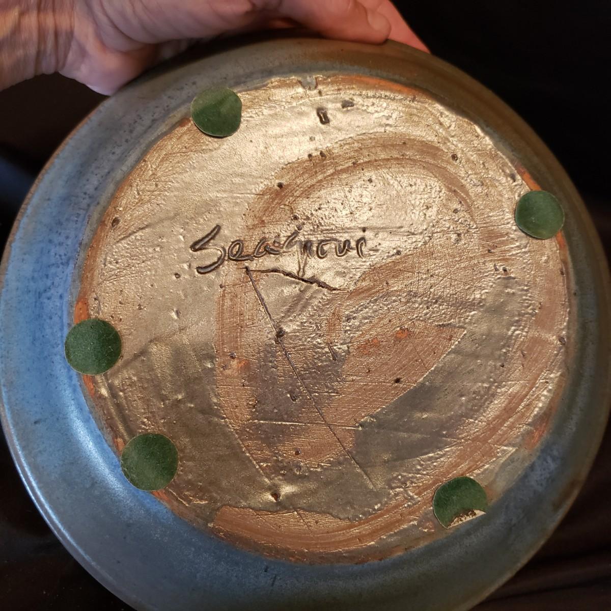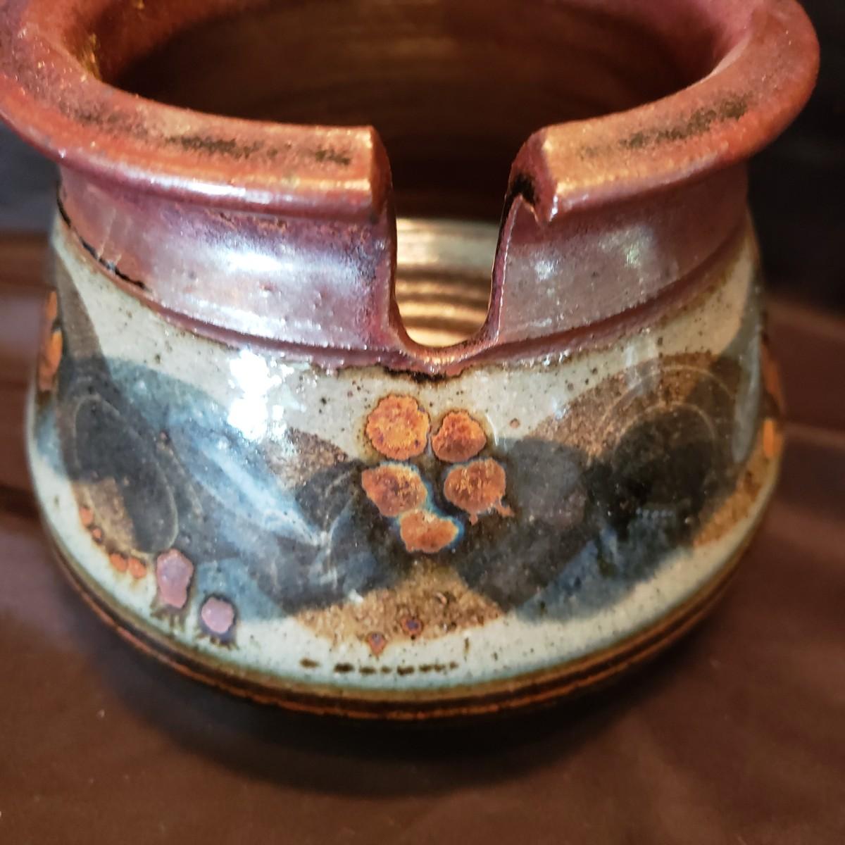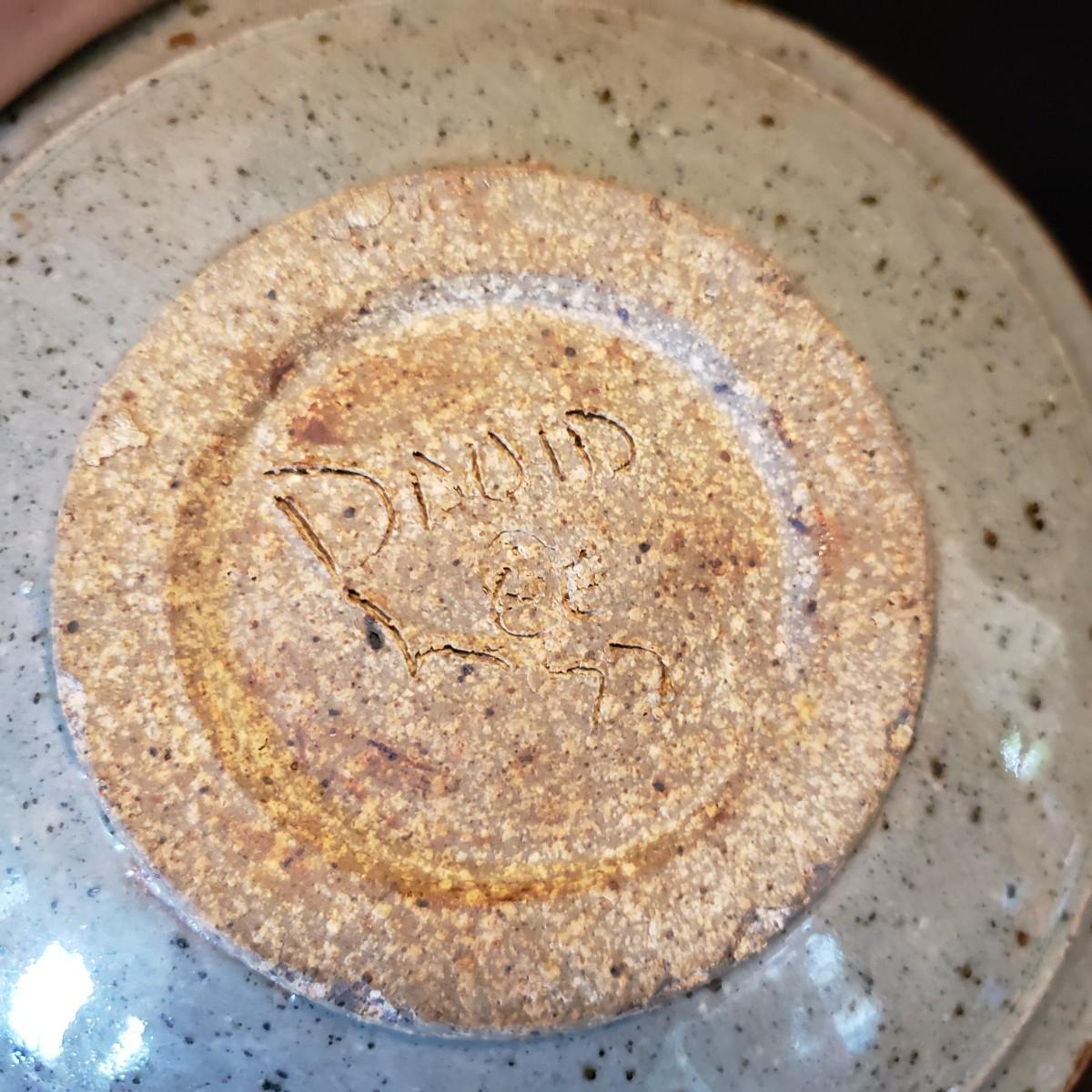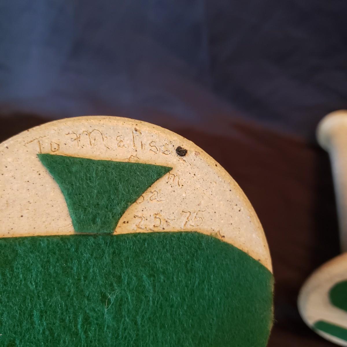 This lot contains five pottery pieces. The corked bowl has a cut out the rim for a spoon or ladle and measures 6" x 5" and is signed David '77. The Seagrove bowl measures 9" x 2" H. The butter server is stamped with an "S" on the back and measures 8" x 2". The two matching candlestick holders measure 4" x 8" and the artists name is cover by the green felt.