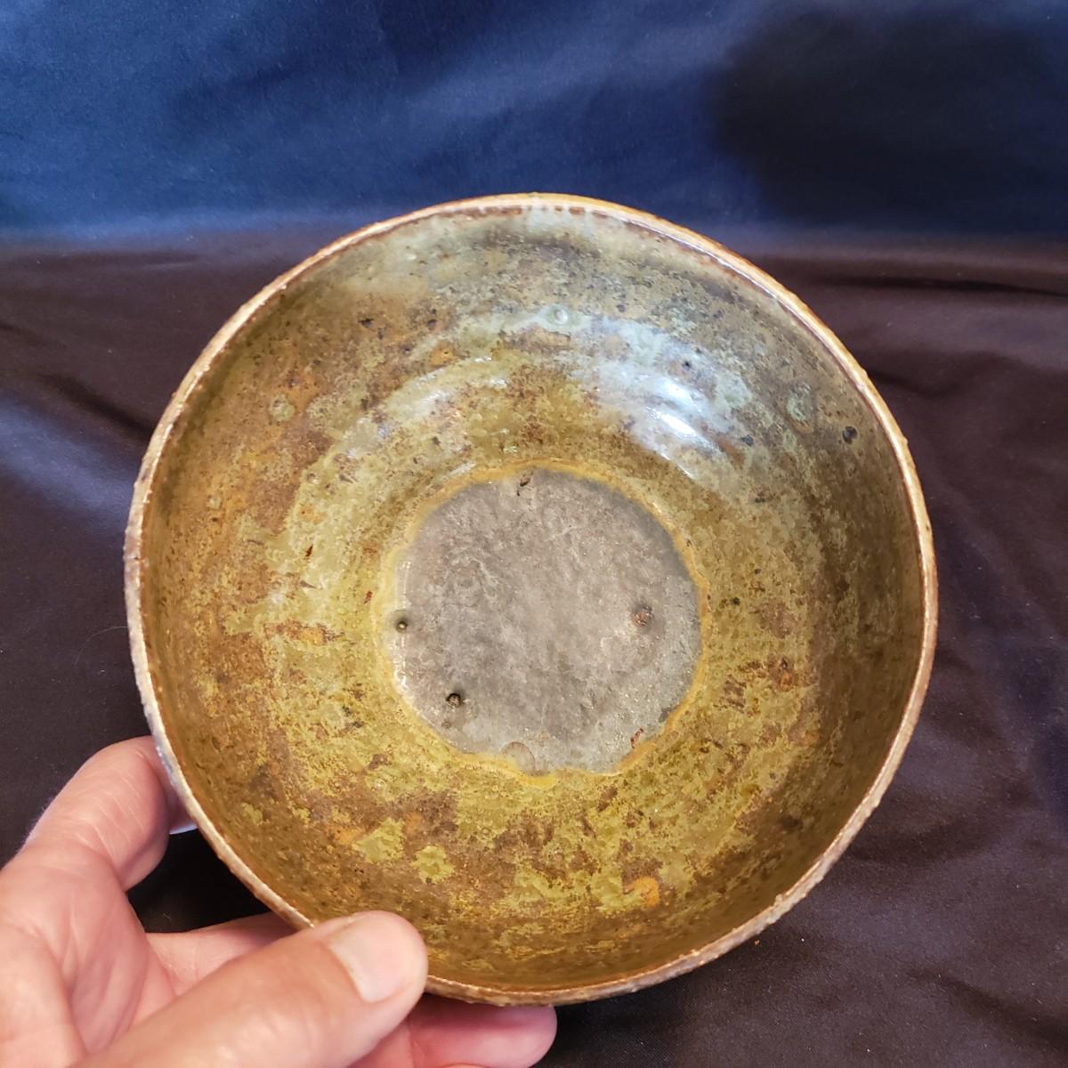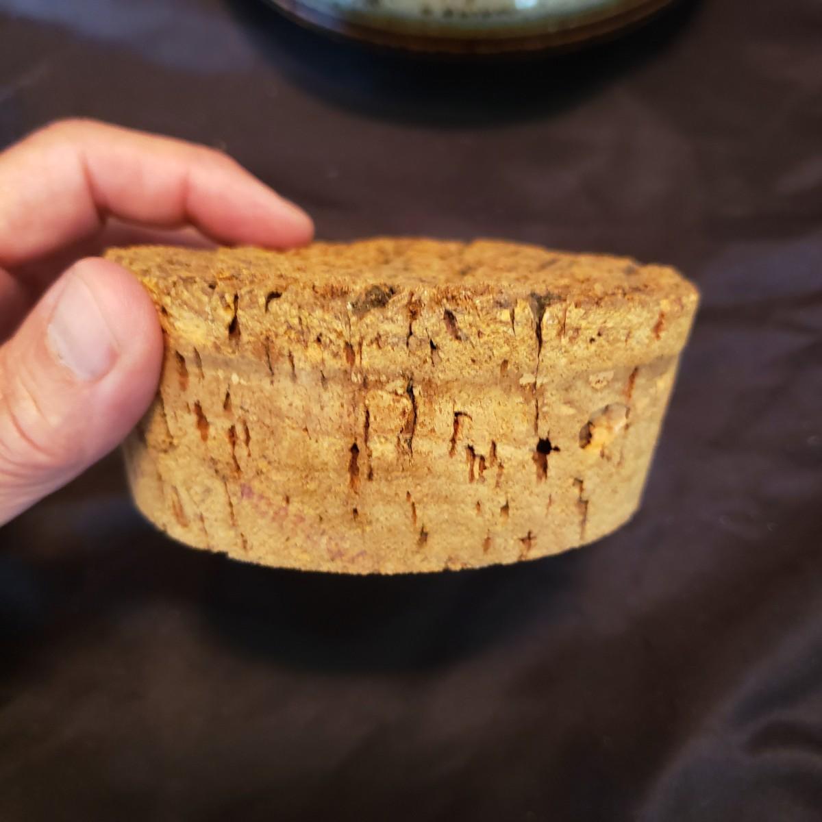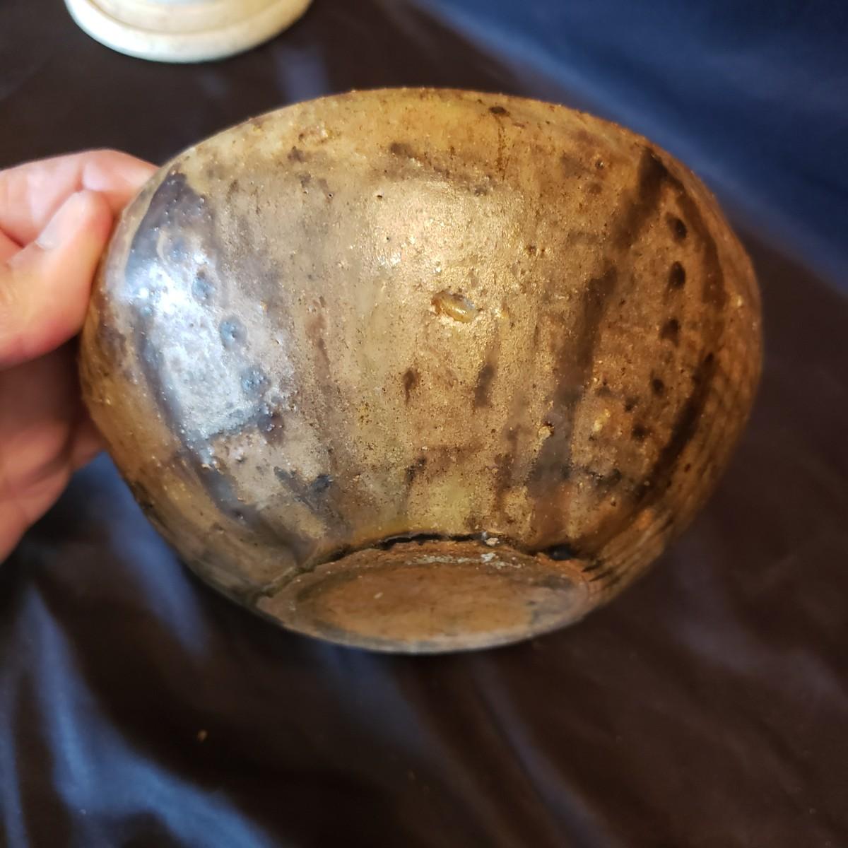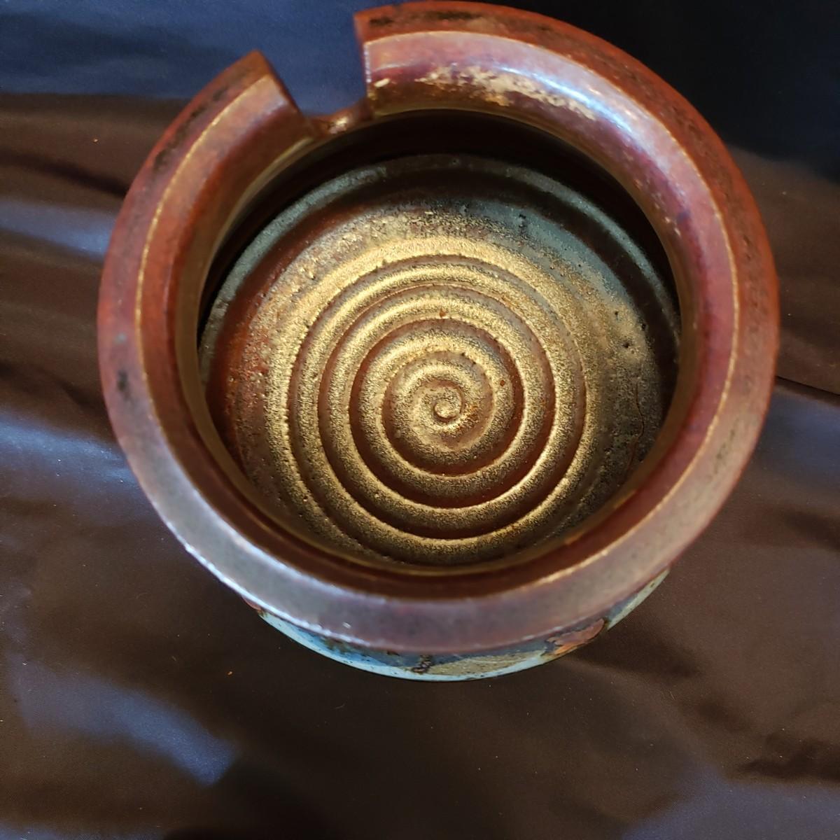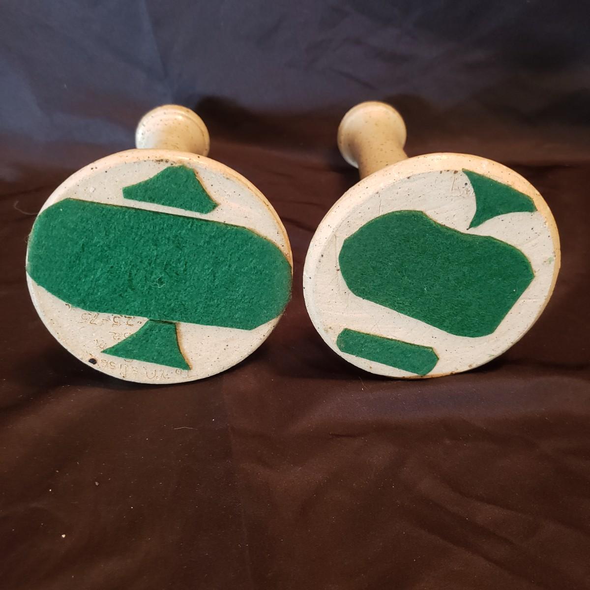 This lot contains five pottery pieces. The corked bowl has a cut out the rim for a spoon or ladle and measures 6" x 5" and is signed David '77. The Seagrove bowl measures 9" x 2" H. The butter server is stamped with an "S" on the back and measures 8" x 2". The two matching candlestick holders measure 4" x 8" and the artists name is cover by the green felt.