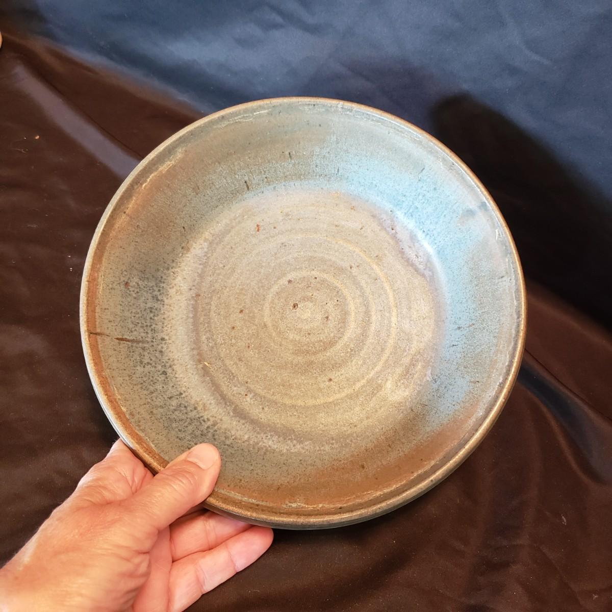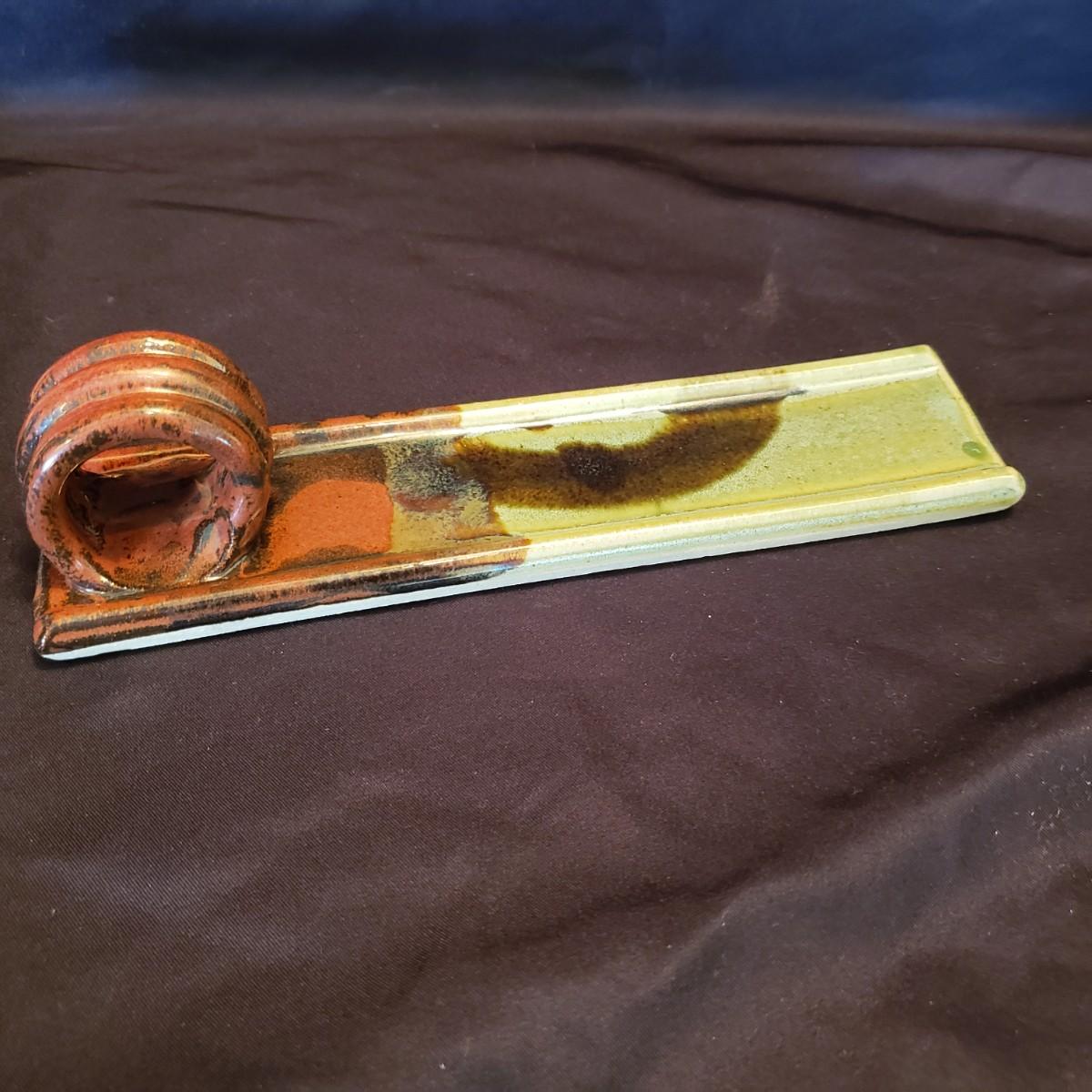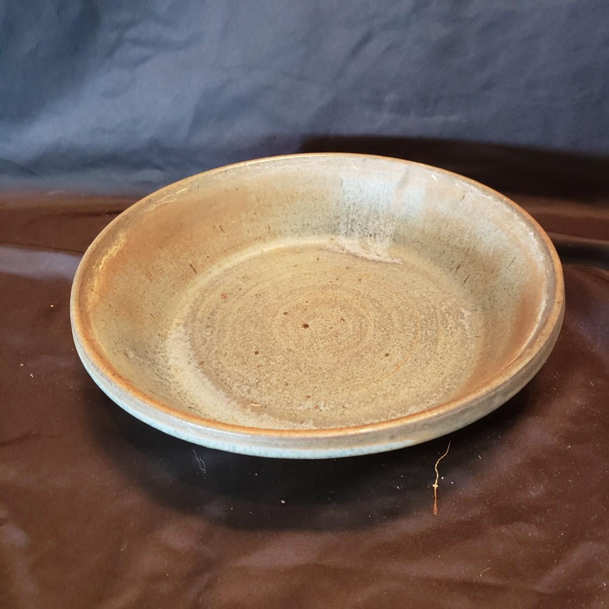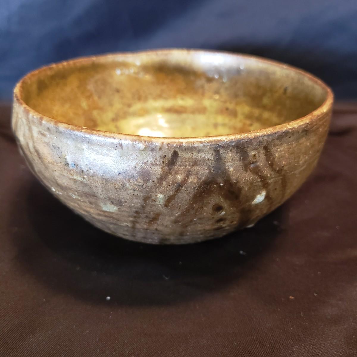 This lot contains five pottery pieces. The corked bowl has a cut out the rim for a spoon or ladle and measures 6" x 5" and is signed David '77. The Seagrove bowl measures 9" x 2" H. The butter server is stamped with an "S" on the back and measures 8" x 2". The two matching candlestick holders measure 4" x 8" and the artists name is cover by the green felt.