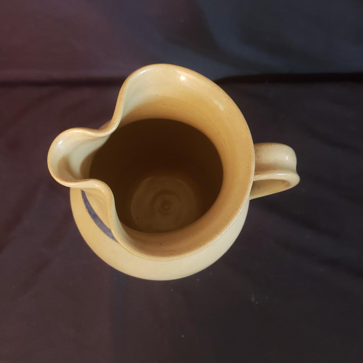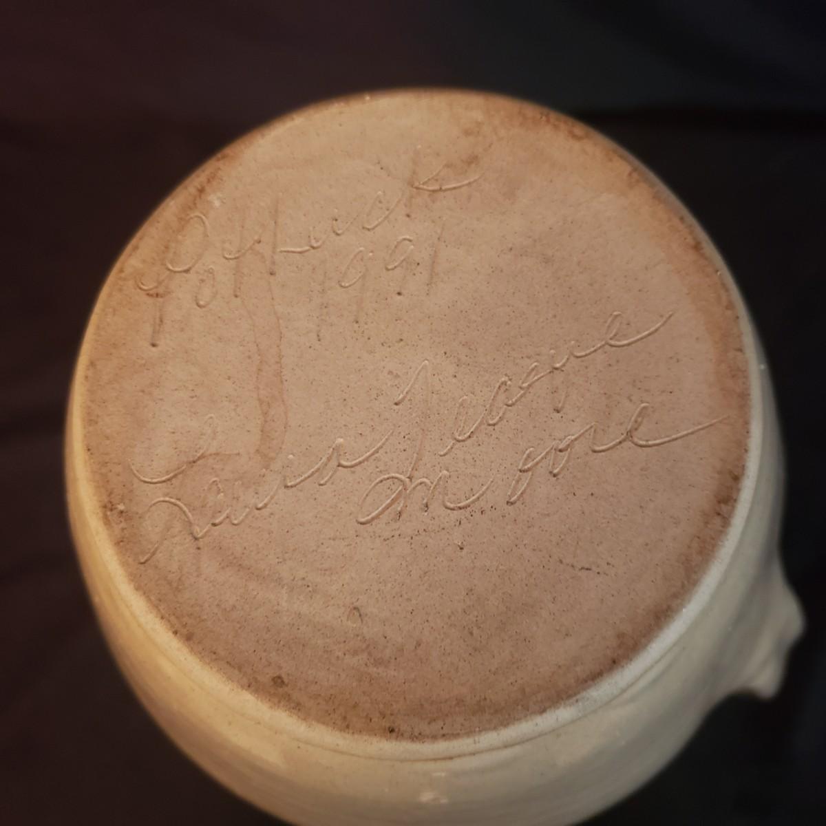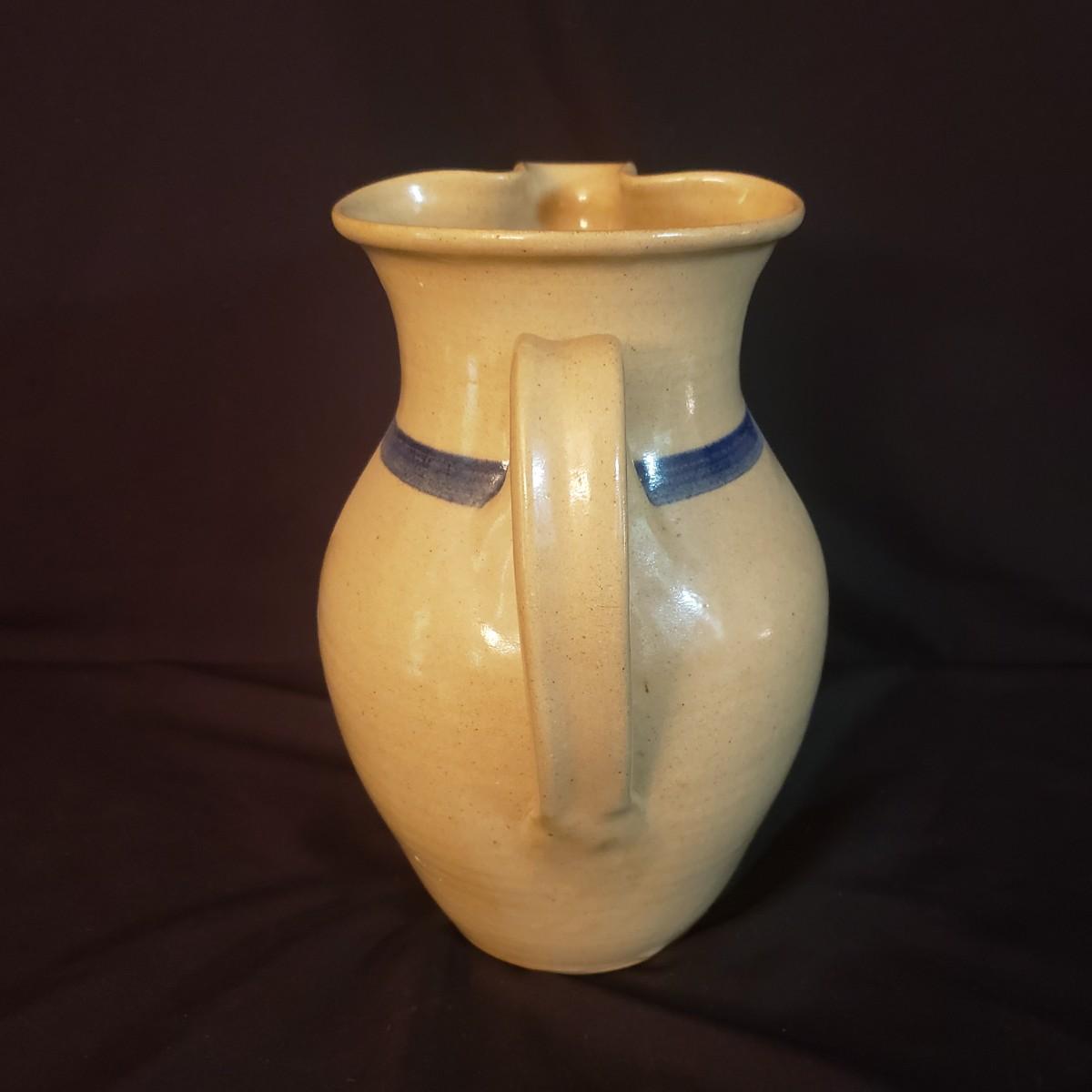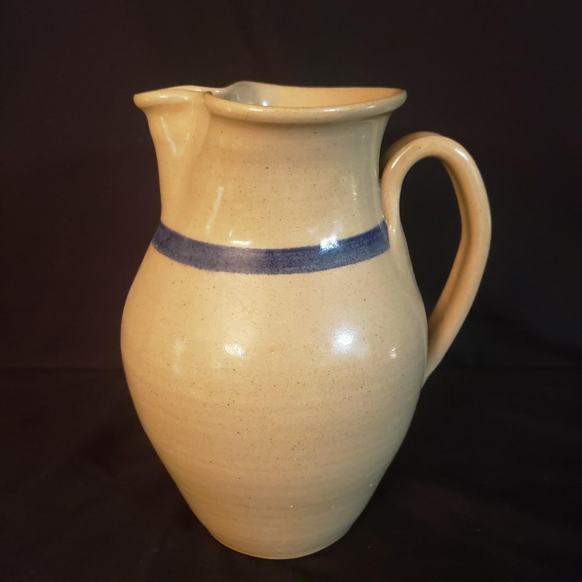 This Seagrove pitcher called 1991 Potluck series signed by artist Laura Teague Moore is a sandy color with a blue stripe. The pitcher measures approximately 8" x 6" x 10"H.