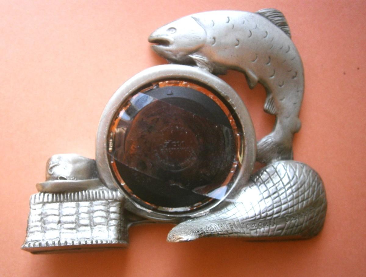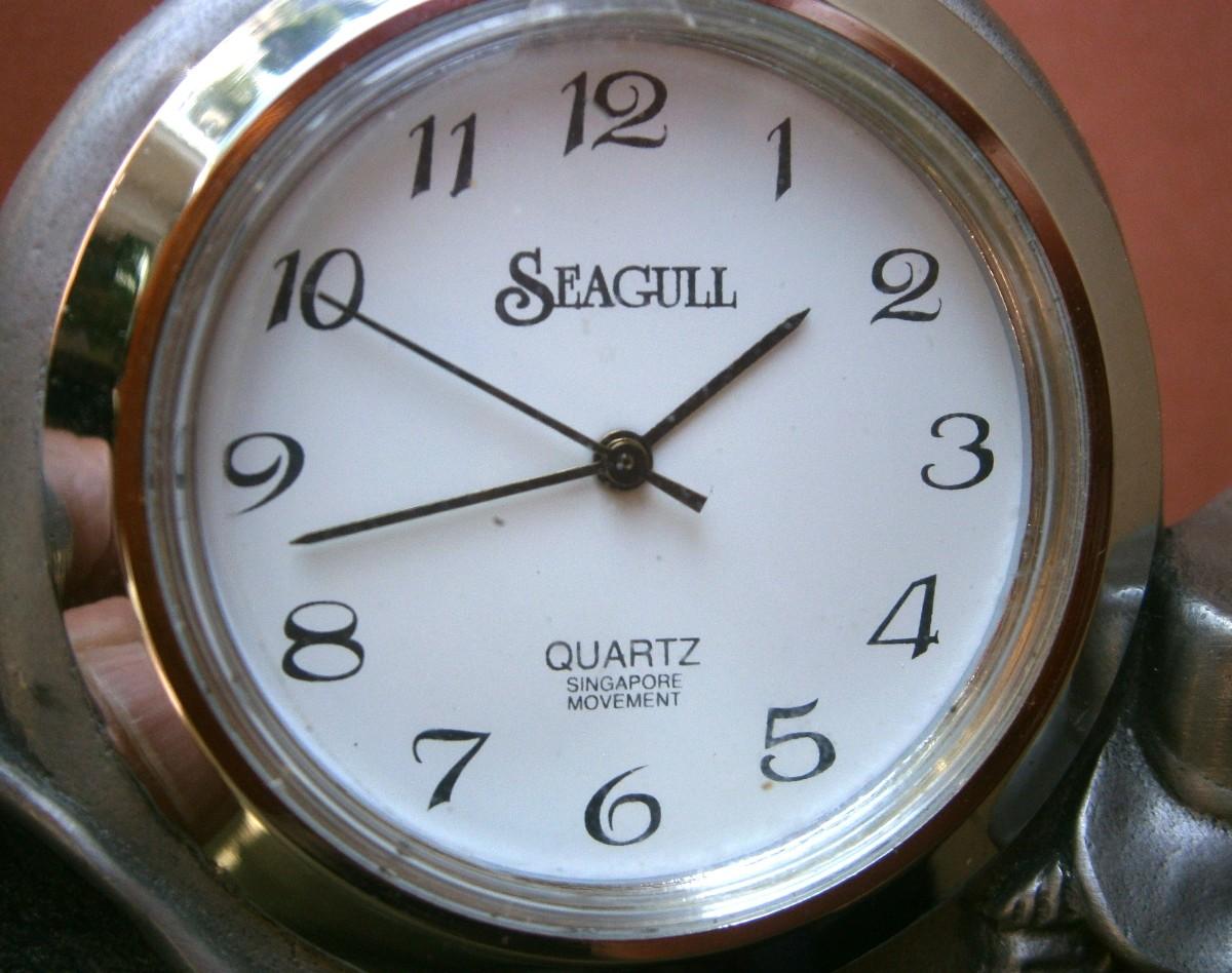 SEAGULL Pewter Desk Clock with Fishing Motif, 2 1/2 in. tall, quartz movement (not working - probably just needs a new battery), movement is loose.