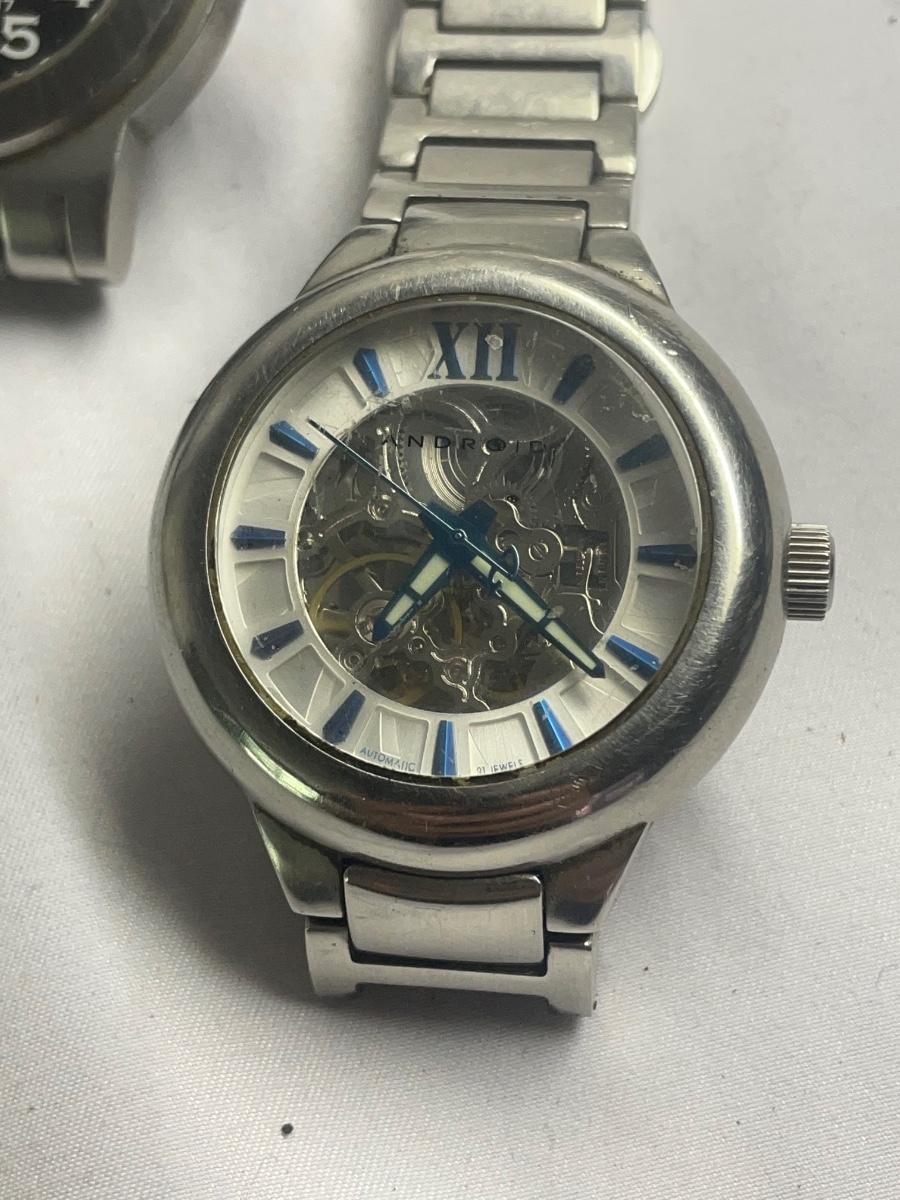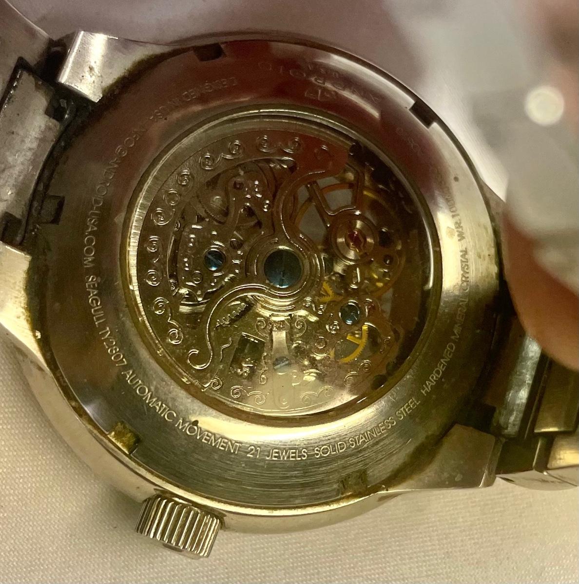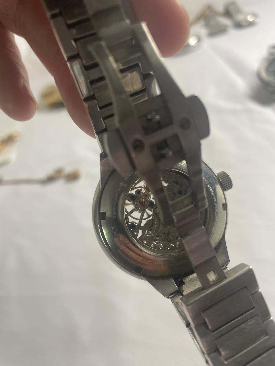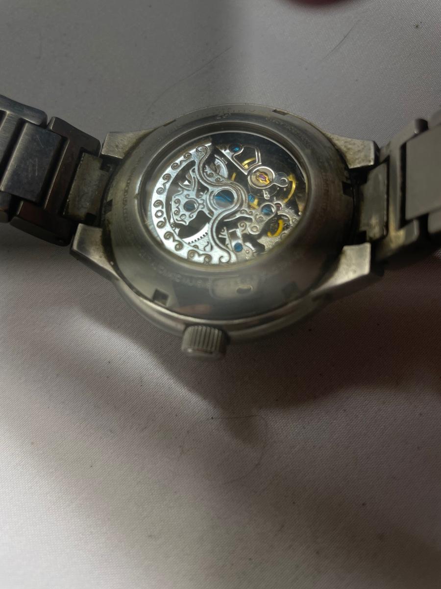 Two quality automatic watches both in good and working condition (a little dirty and typical minor light scratches that are to be expected in a pre owned watch). The Seagull Android TY 2807 is a nice heavy watch that shows the gears and inner workings on the watch face. The other watch shows the gears etc on the back.