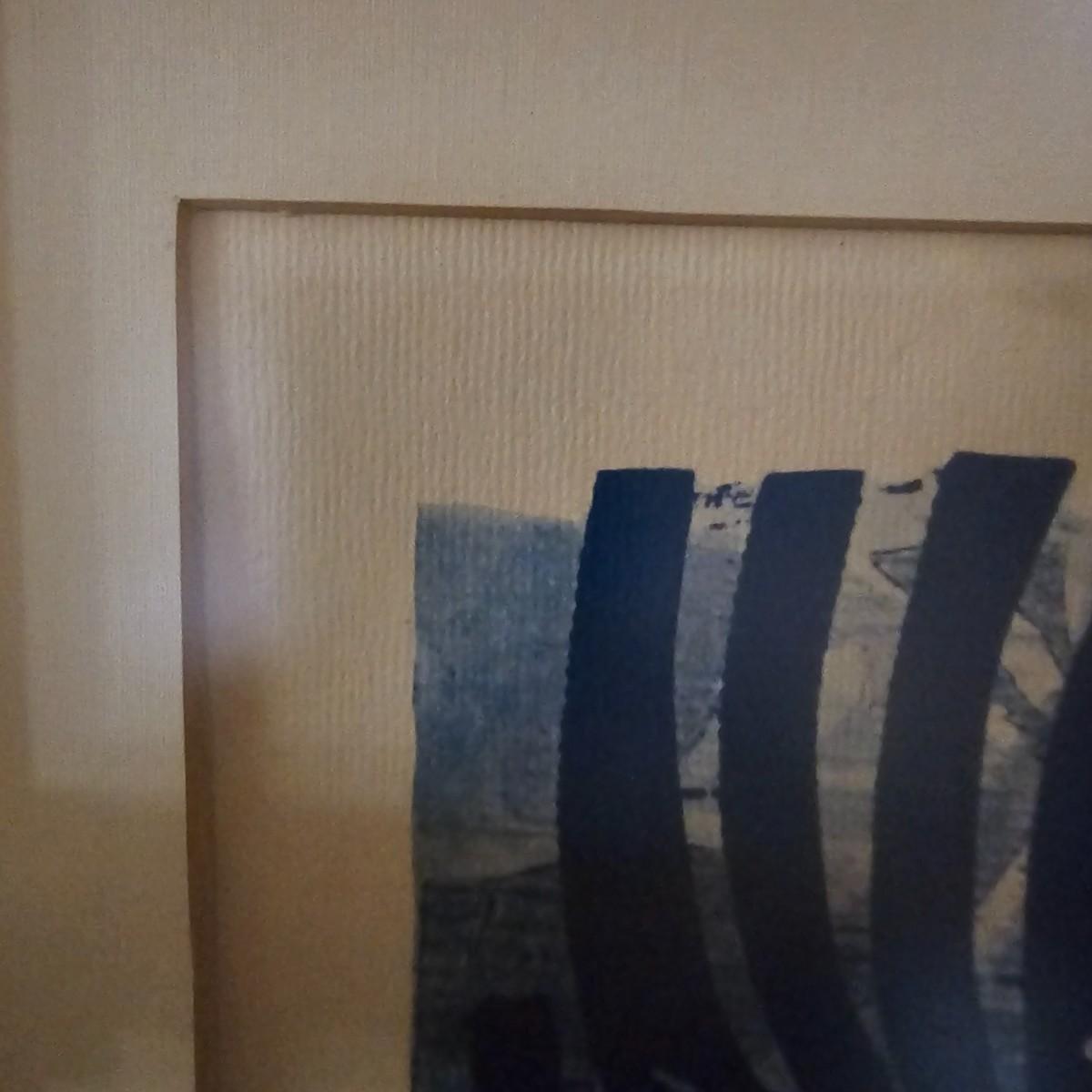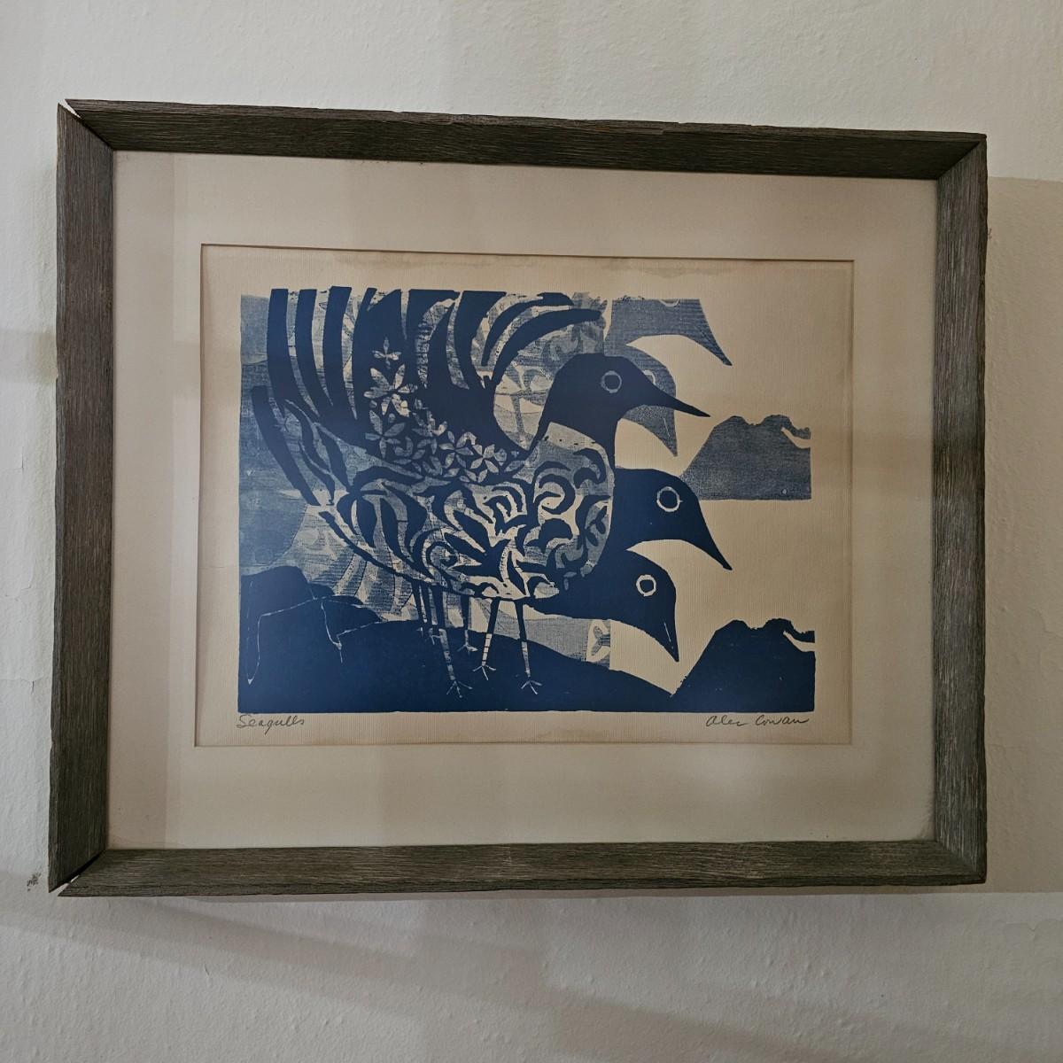 Blue wood block print of seagulls by artist Alec Cowan. Art is matted and framed under glass, is pencil signed by artist. Frame measures 24" x 20", has small spread on two corners. See photos for details. Shipping available. Shipping can be costly. We suggest contacting our preferred local shipping provider, Postage Express, with dimensions and getting an estimate before bidding: (828) 255-9250 or shipping@postageexpressnc.com.