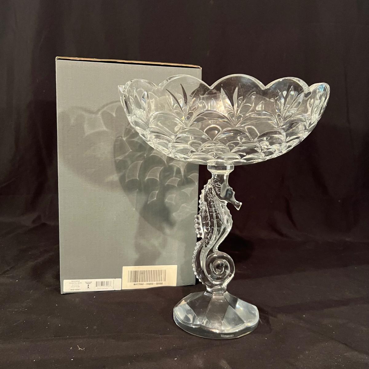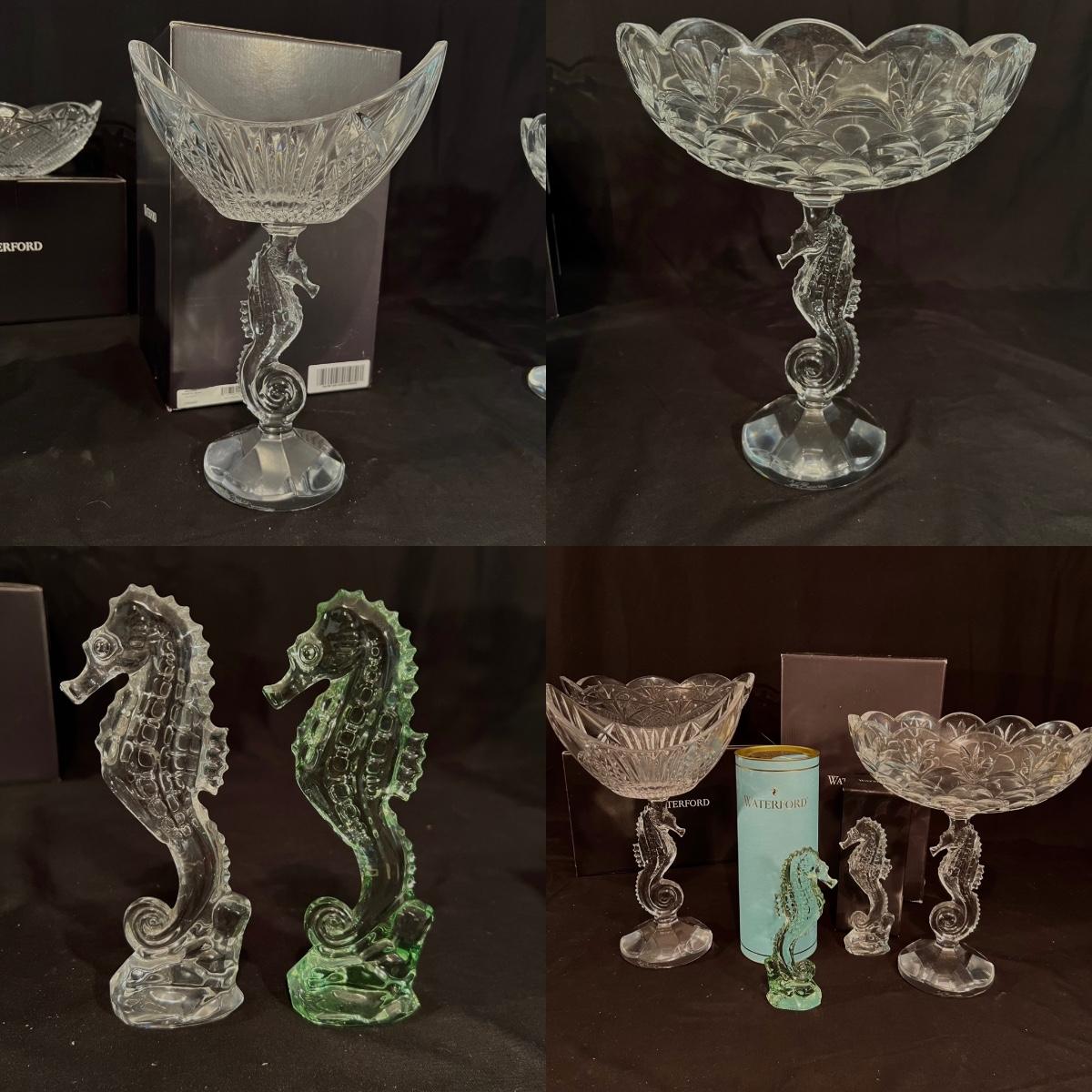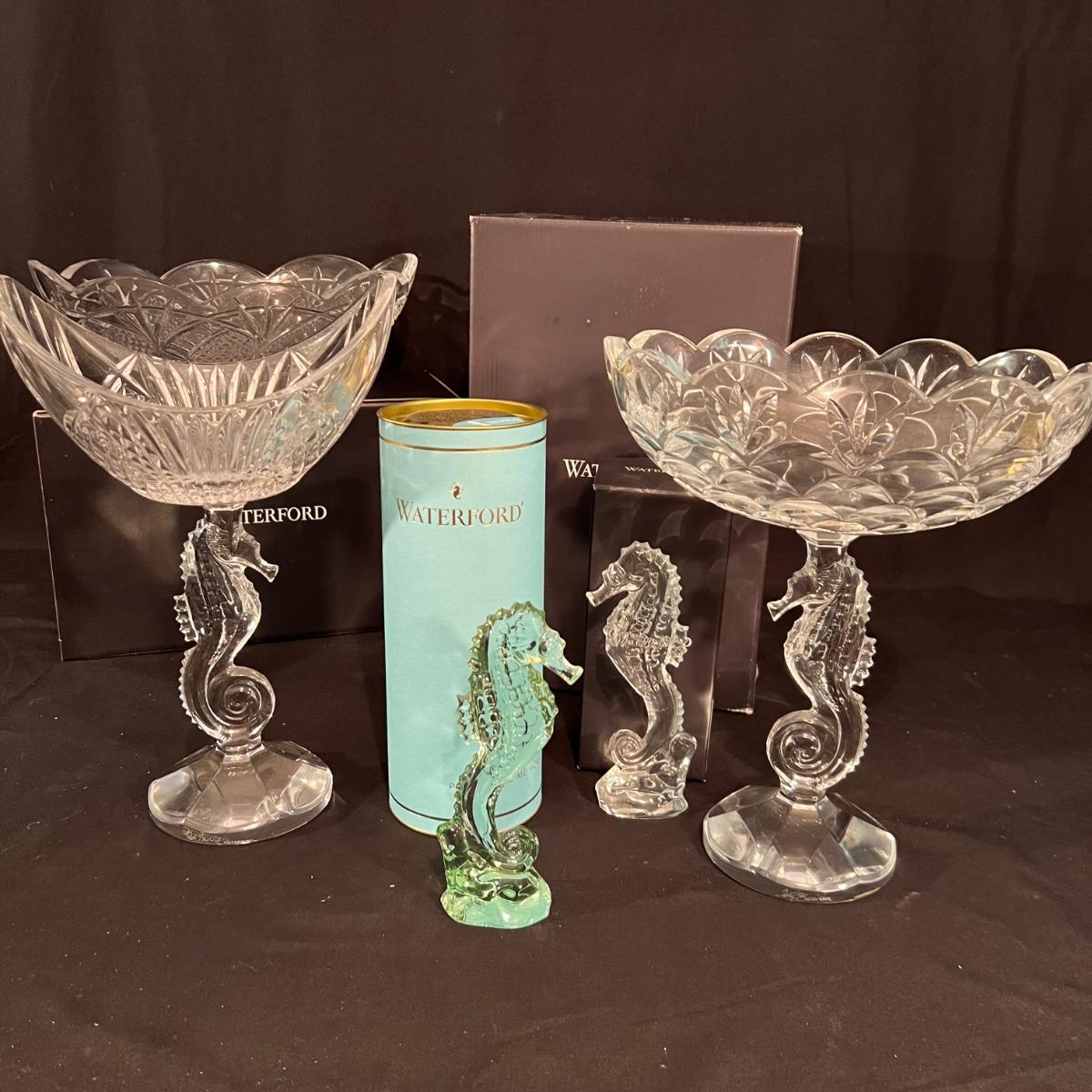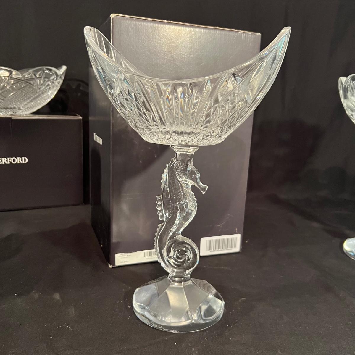 These five Waterford crystal pieces are from their Seahorse collection and all items comes with box. All appear to have been kept out of their boxes on display. The seahorse pedestal bowl that is ambassador signed by Tom Brennan measures approximately 9”D x 13”H. The other pedestal bowl is also signed.