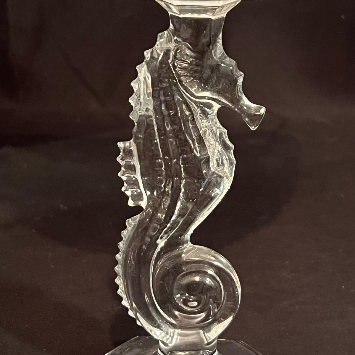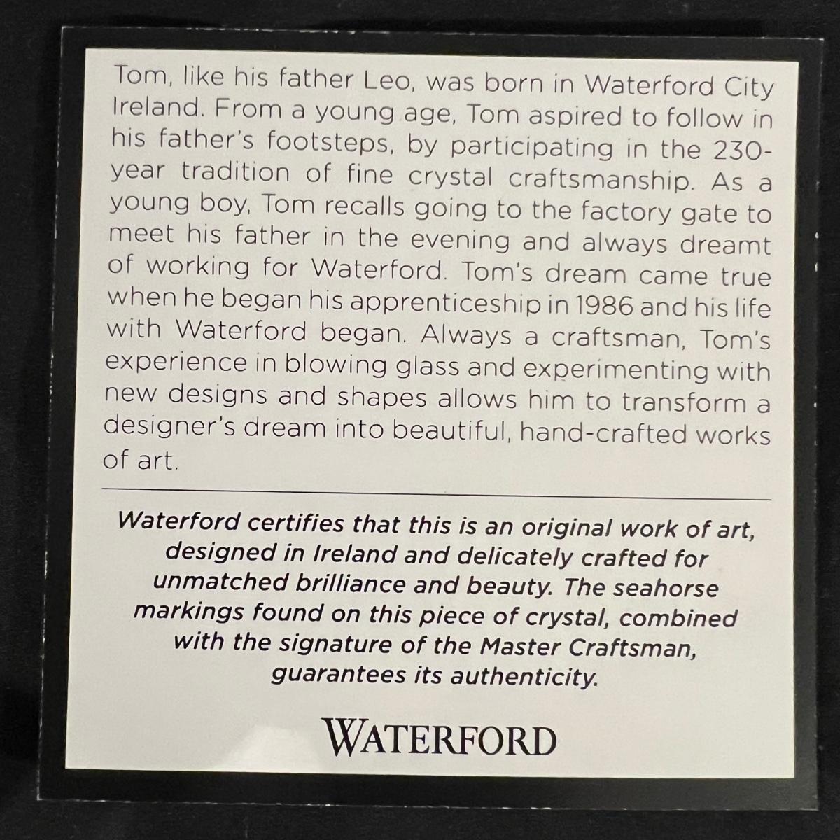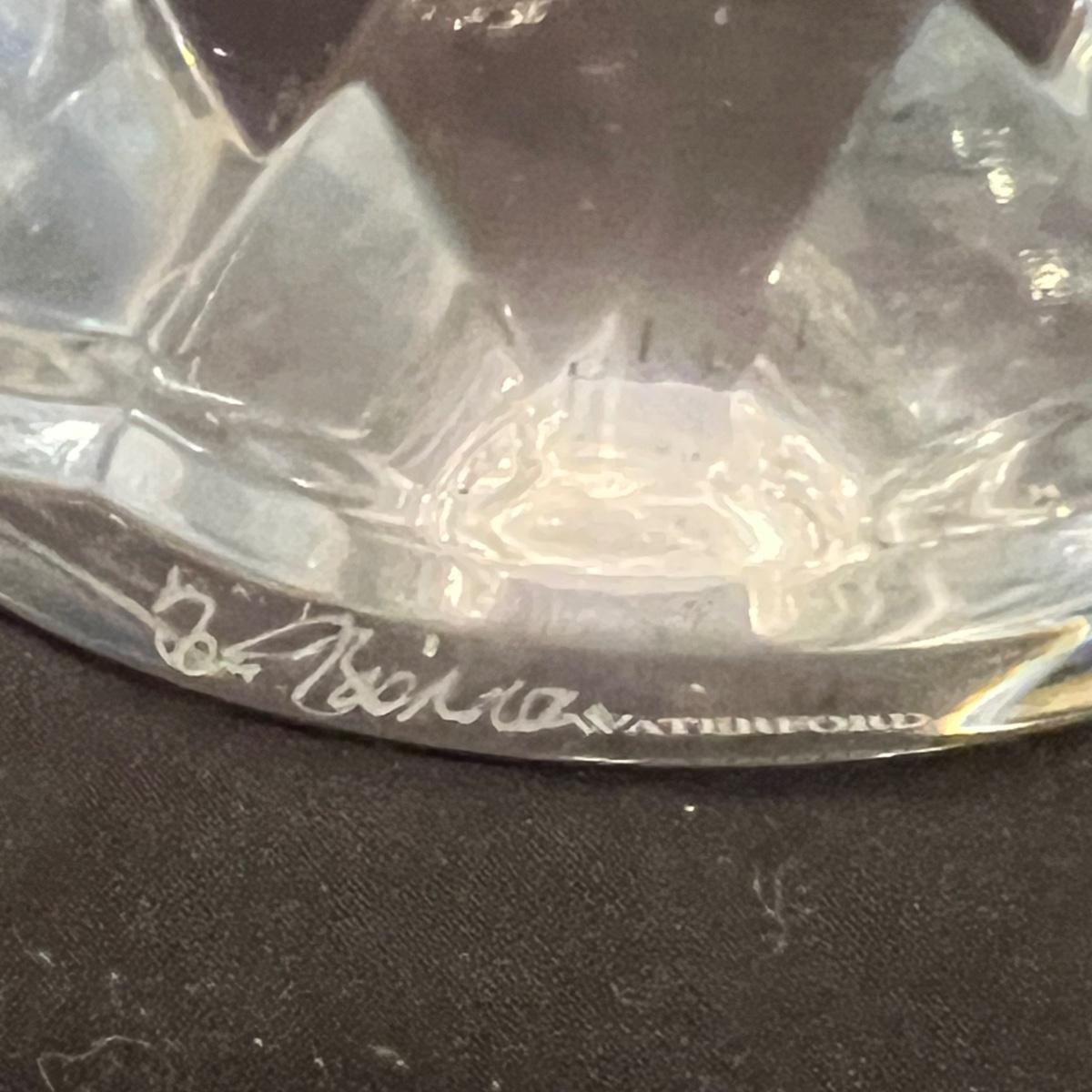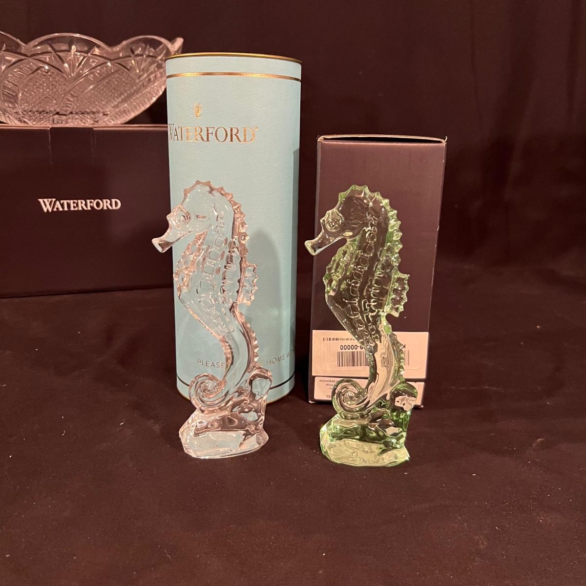 These five Waterford crystal pieces are from their Seahorse collection and all items comes with box. All appear to have been kept out of their boxes on display. The seahorse pedestal bowl that is ambassador signed by Tom Brennan measures approximately 9”D x 13”H. The other pedestal bowl is also signed.