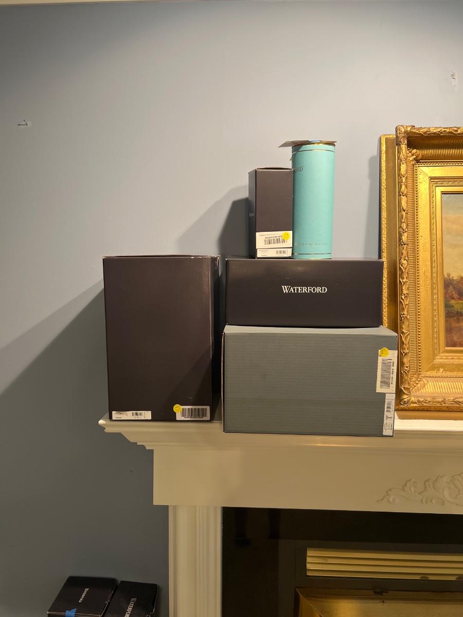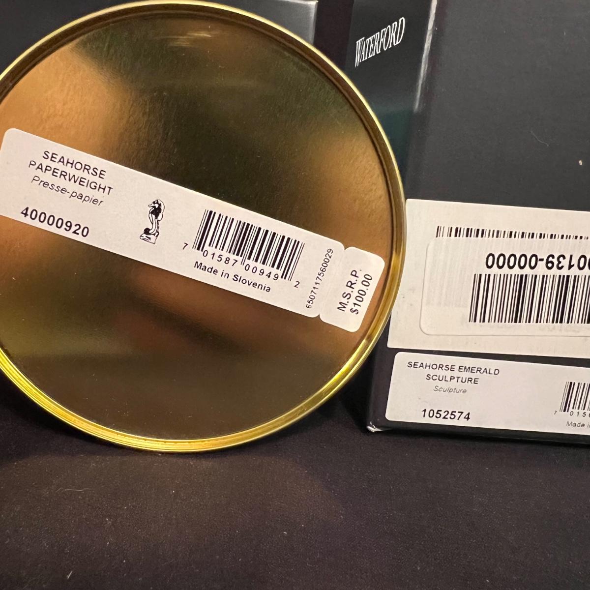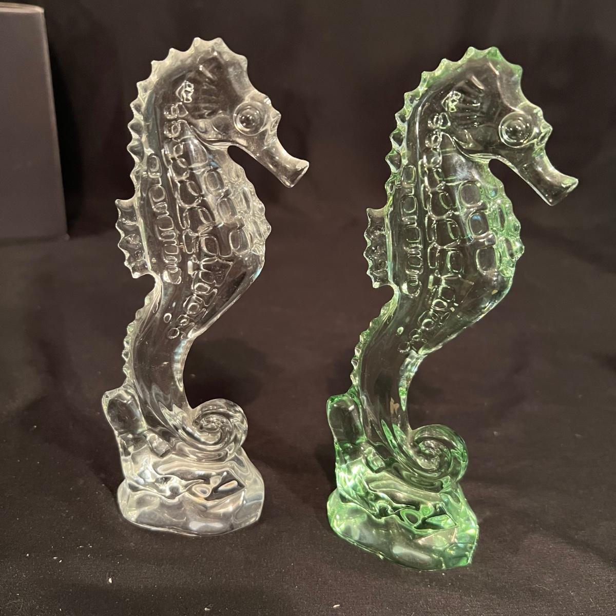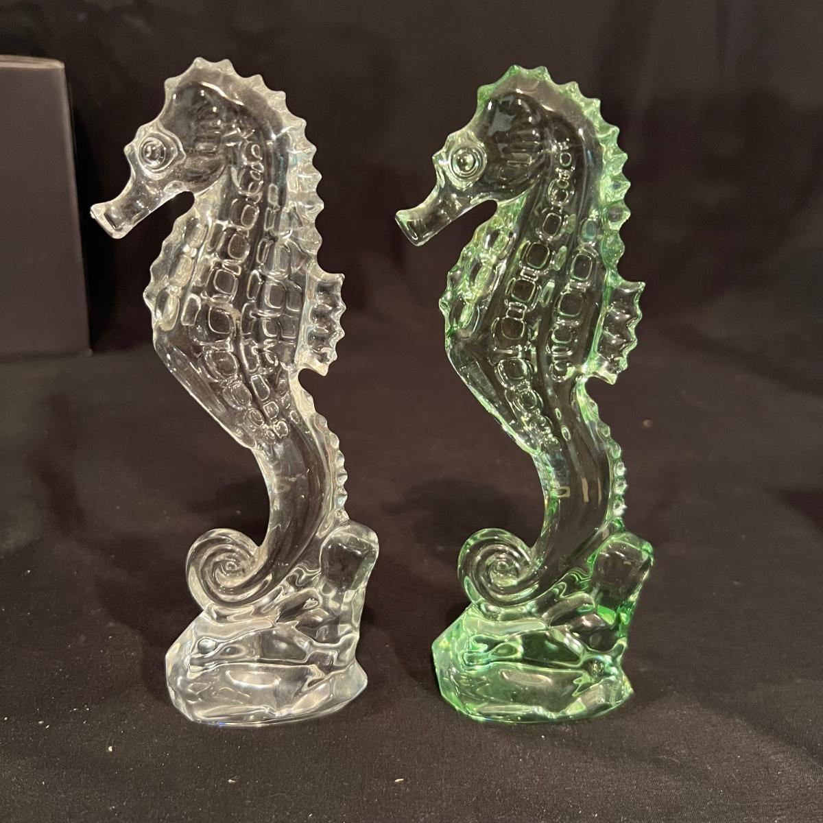 These five Waterford crystal pieces are from their Seahorse collection and all items comes with box. All appear to have been kept out of their boxes on display. The seahorse pedestal bowl that is ambassador signed by Tom Brennan measures approximately 9”D x 13”H. The other pedestal bowl is also signed.
