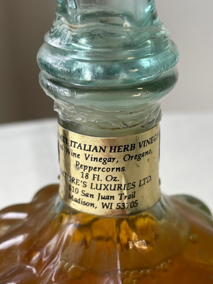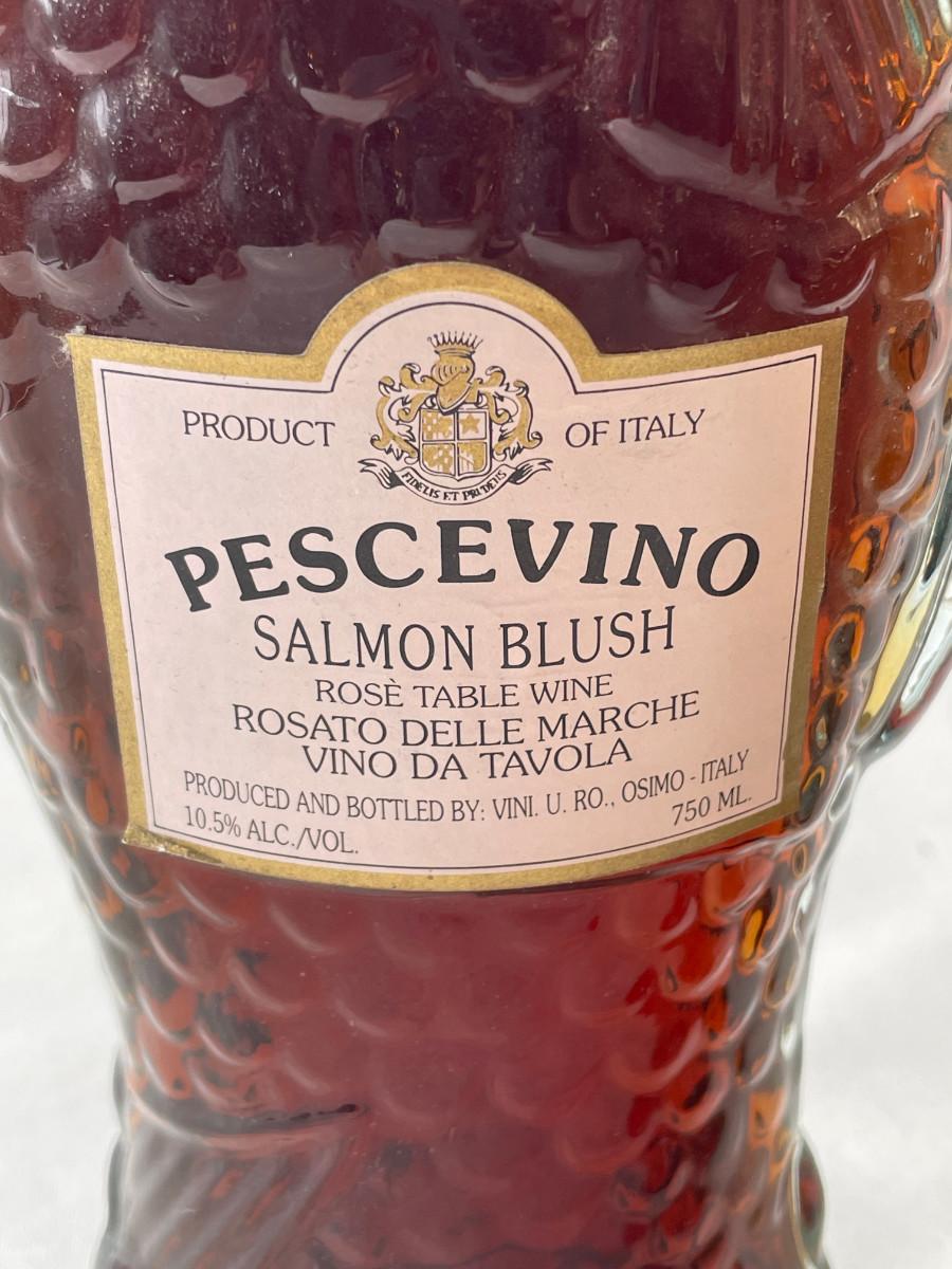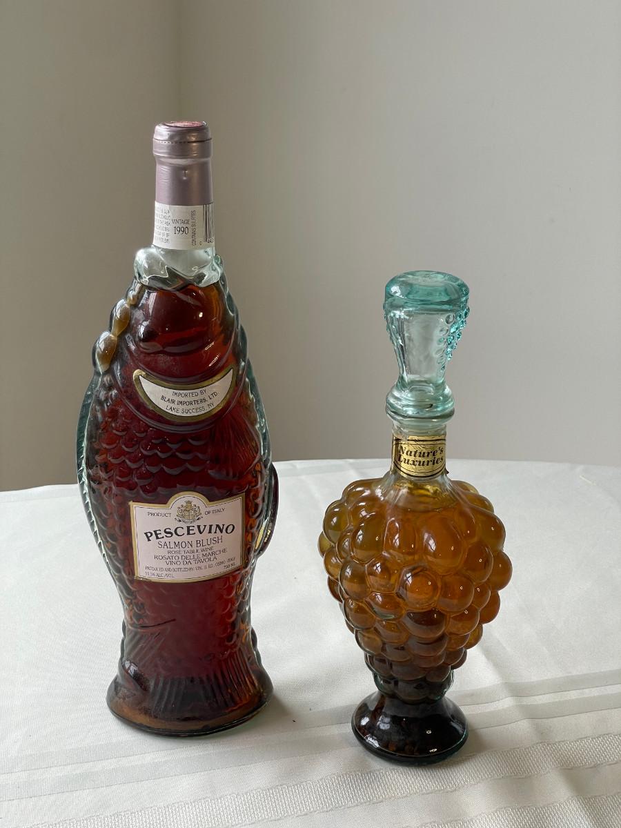 Sealed bottles. Unknown useable condition of wine and vinegar. One is Nature’s Luxuries Gourmet Italian Herb Vinegar. The other is Pescevino Salmon Blush Rose Table Wine (vintage 1990). Beautiful decorative bottles.