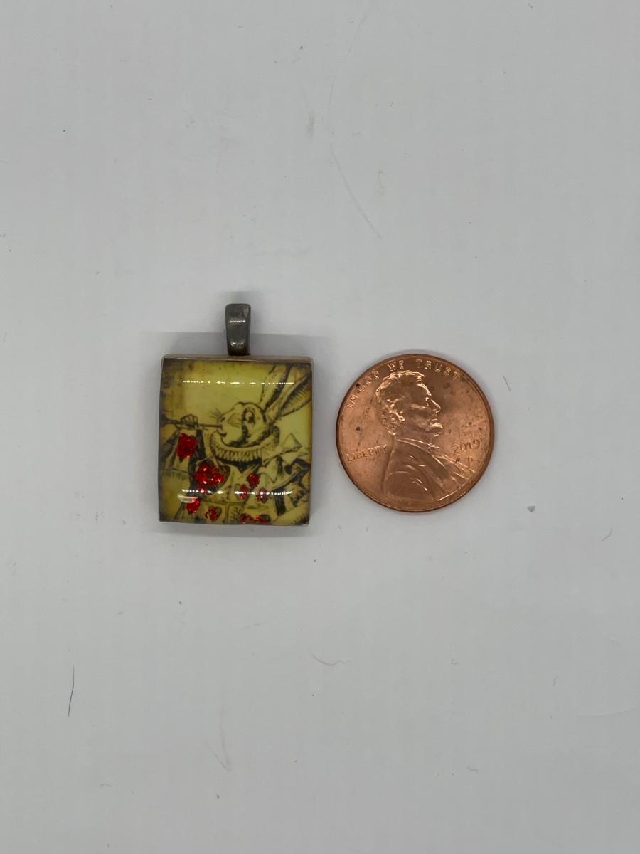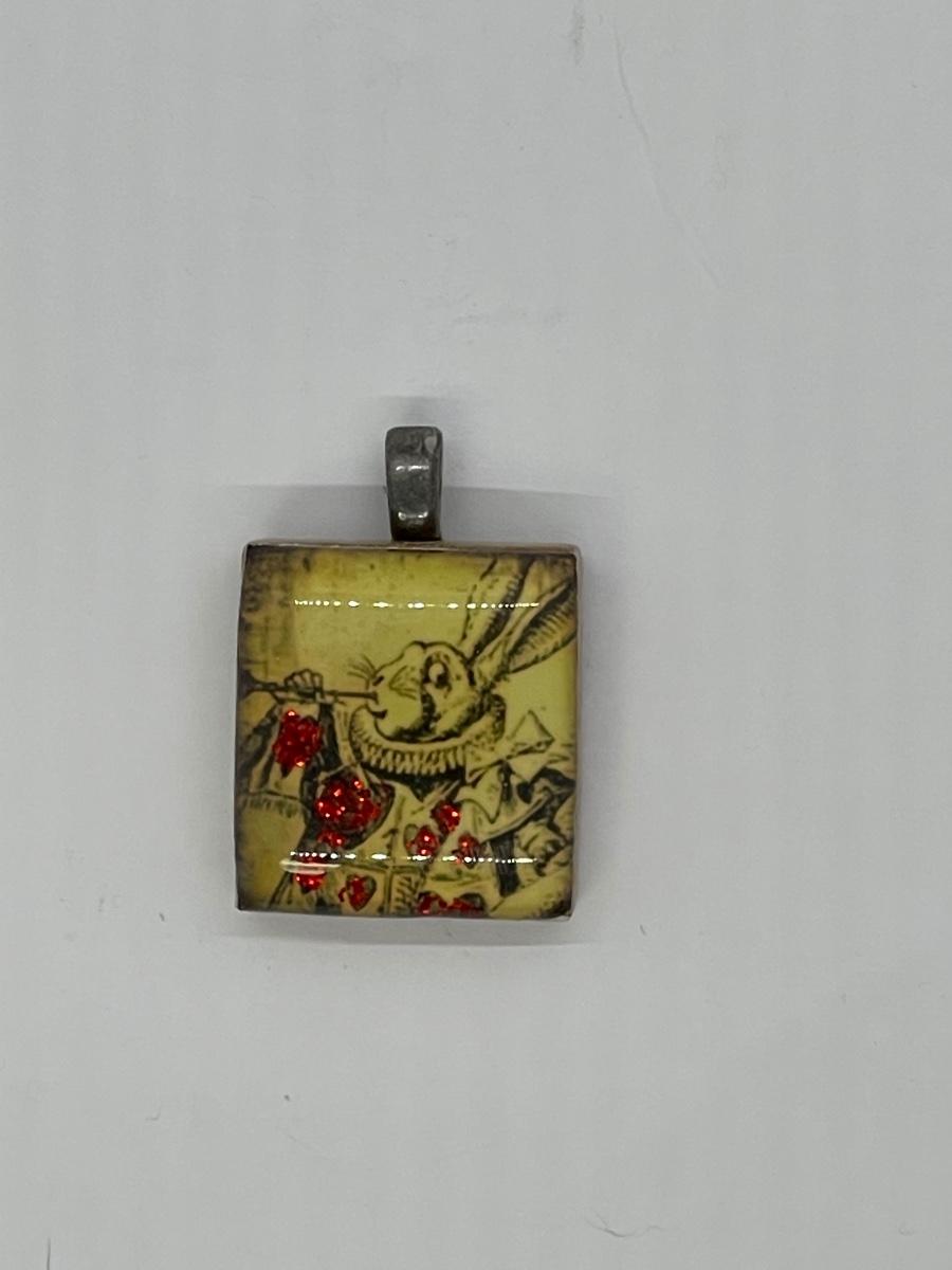 Sealed Decoupage Scrabble Tile White Rabbit Alice in Wonderland Pendant Charm. In good condition. The hearts are glittery under the enamel. Done on a Scrabble letter tile.