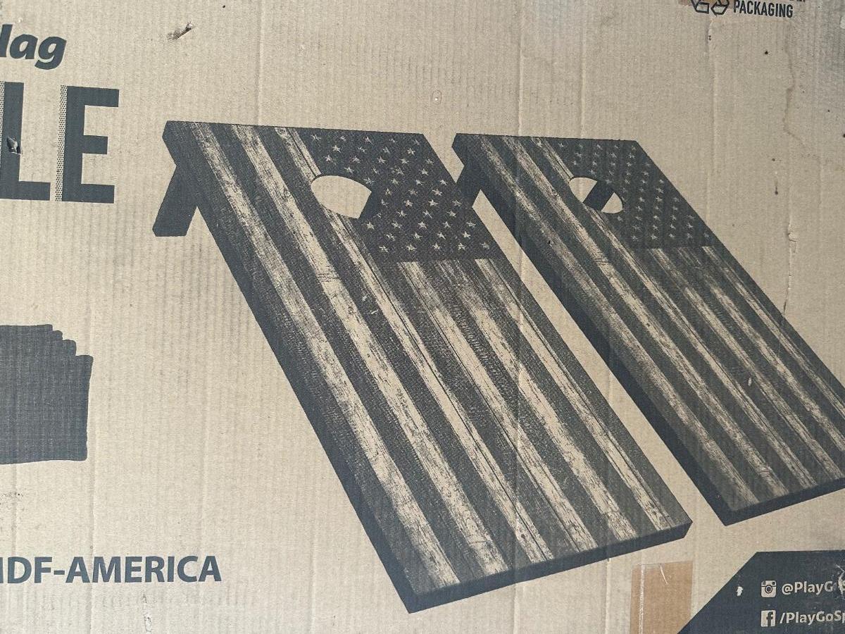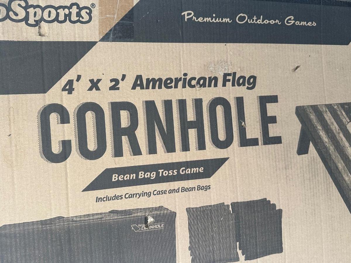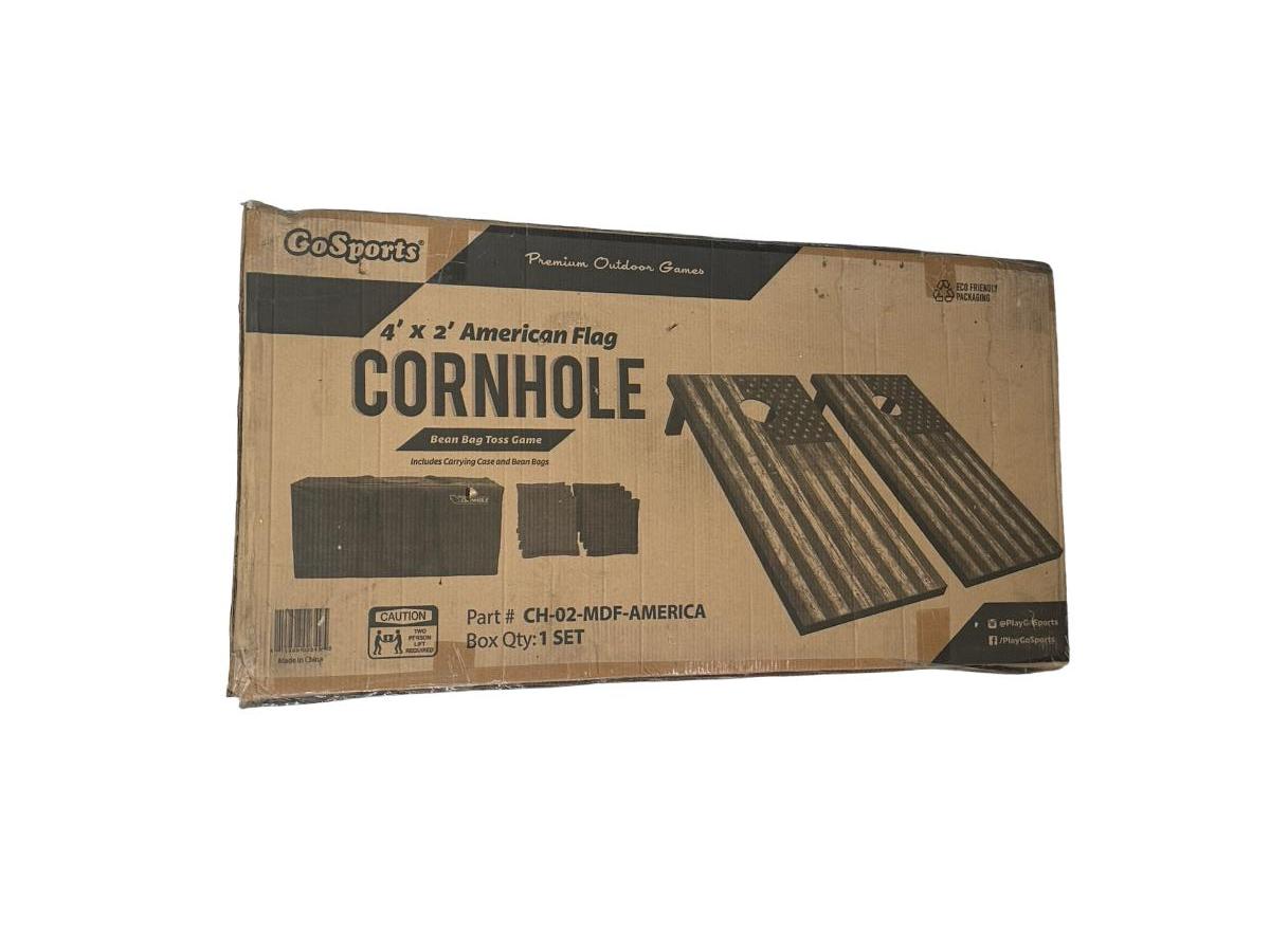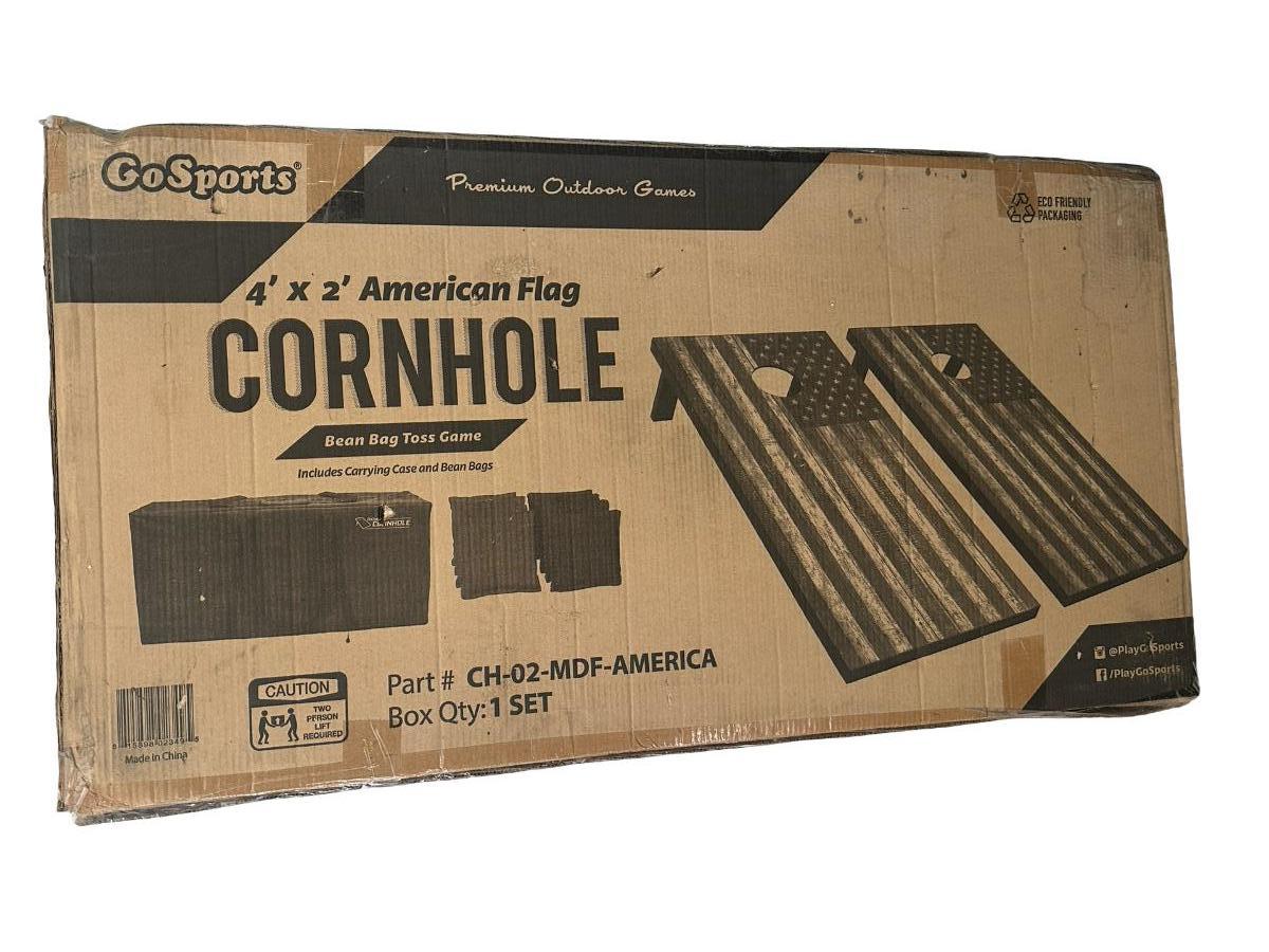 Sealed new GoSports cornhole / bean bag toss game set with regulation size 4 ft x 2 ft boards and American flag design.