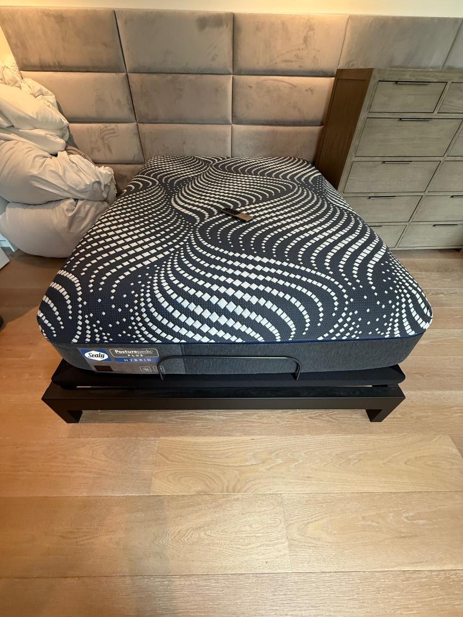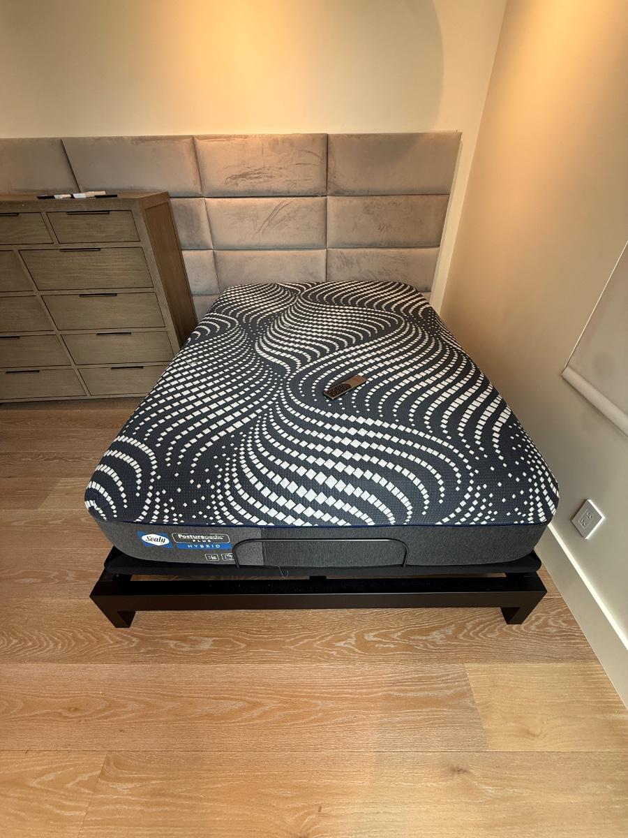 The Sealy Full Size Hybrid Mattress offers lumbar support and a plush pillow top for added comfort. Its contemporary style makes it a suitable addition to any bedroom. This mattress is pre-owned.