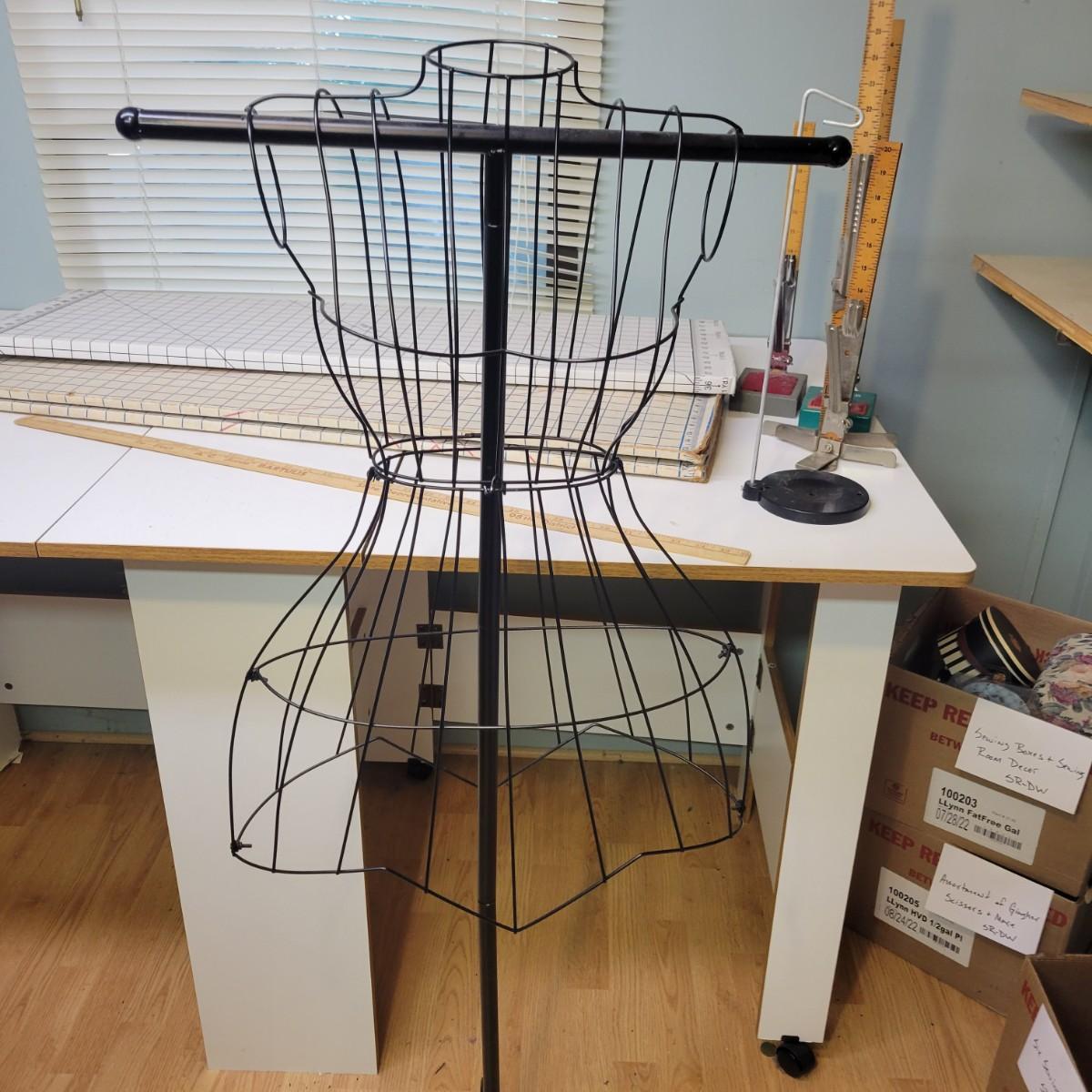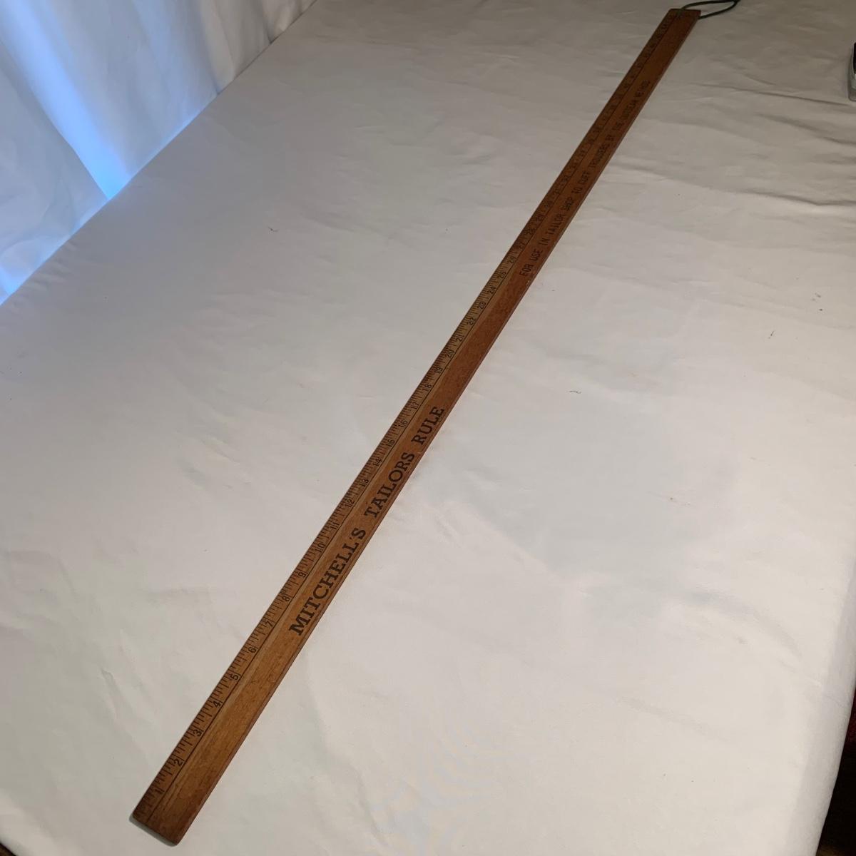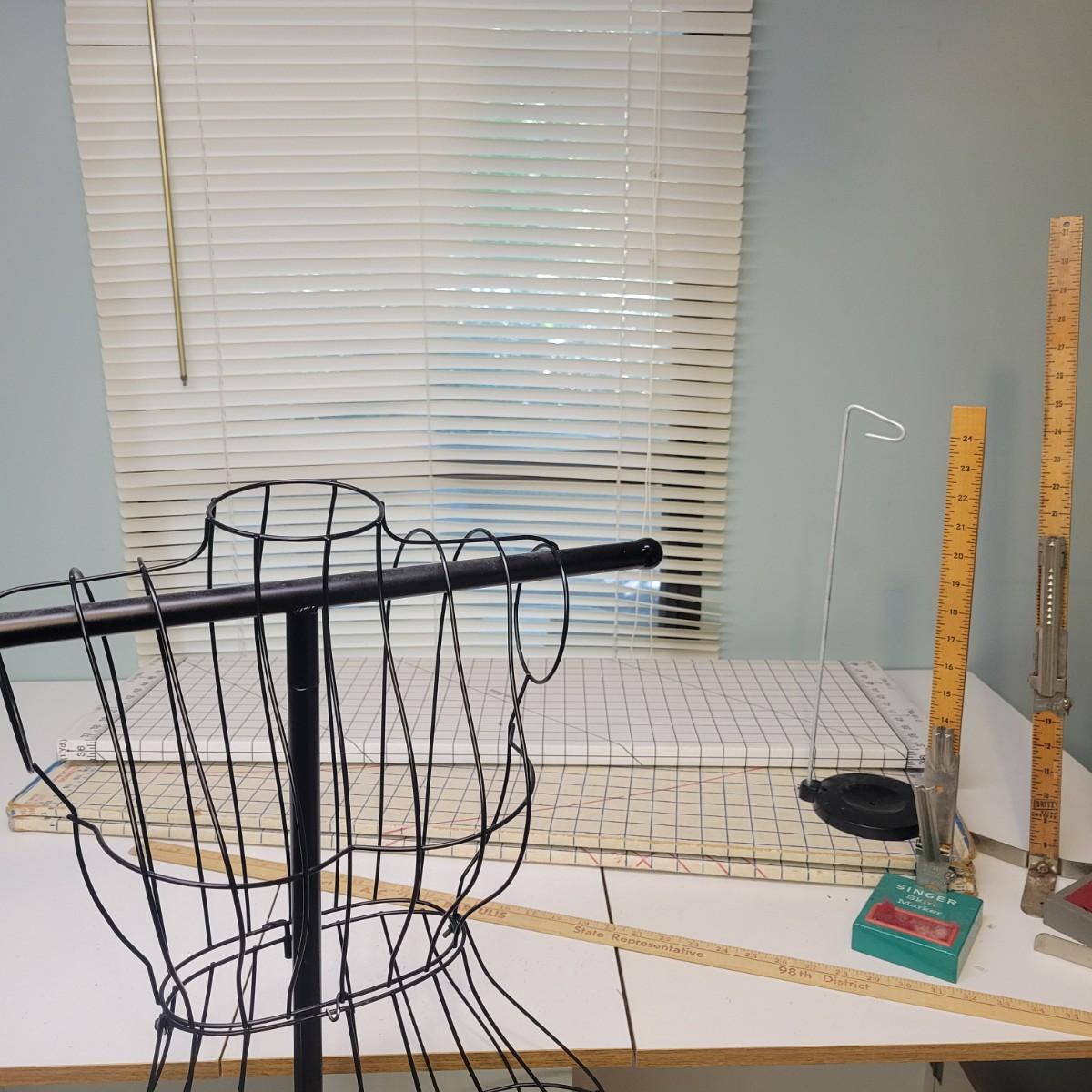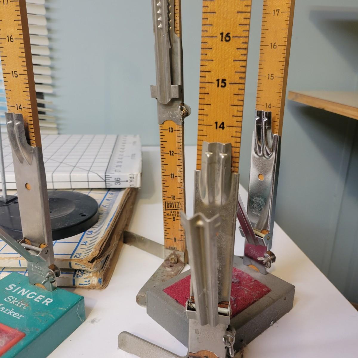 essentials for a sewist. This lot includes a black metal dress form in good condition that measures approximately 20" x 6" x 52". Also includes four skirt markers, two pattern boards, a yardstick, and a solid wood Mitchell’s Tailors Rule for use in a tailor shop to cuff trousers by the out seam method. Table in the pictures is not included. Local pickup only