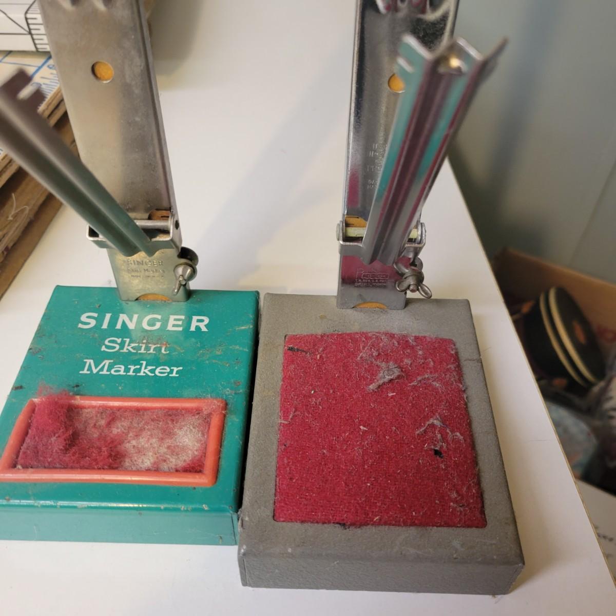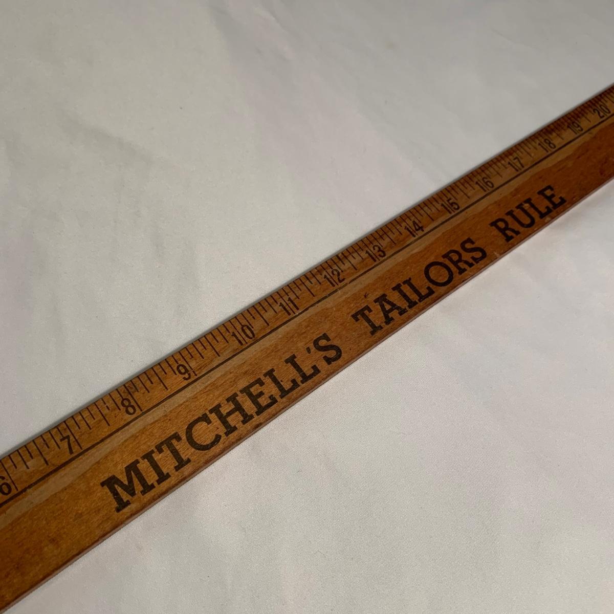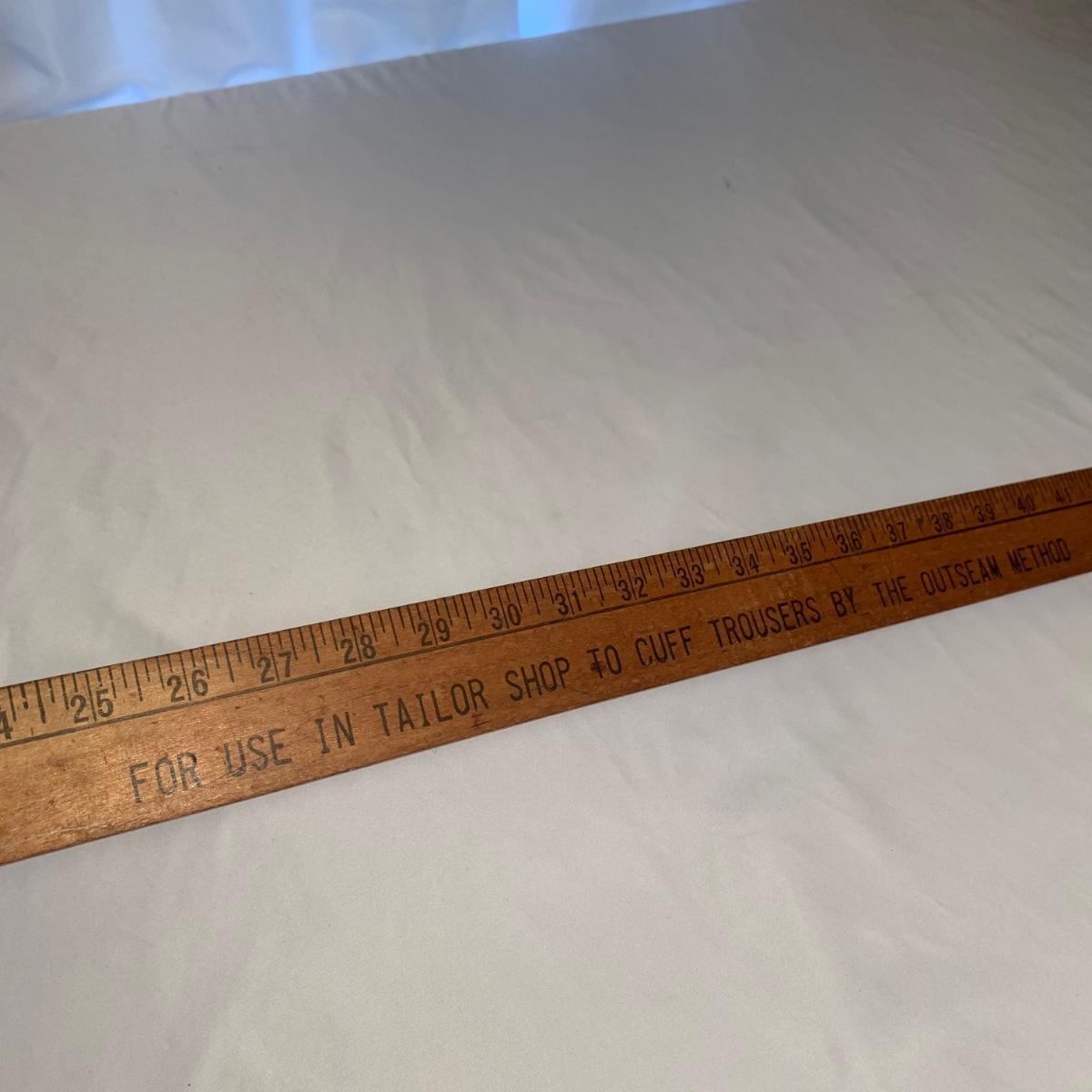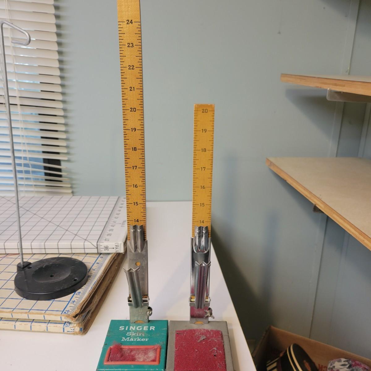 essentials for a sewist. This lot includes a black metal dress form in good condition that measures approximately 20" x 6" x 52". Also includes four skirt markers, two pattern boards, a yardstick, and a solid wood Mitchell’s Tailors Rule for use in a tailor shop to cuff trousers by the out seam method. Table in the pictures is not included. Local pickup only