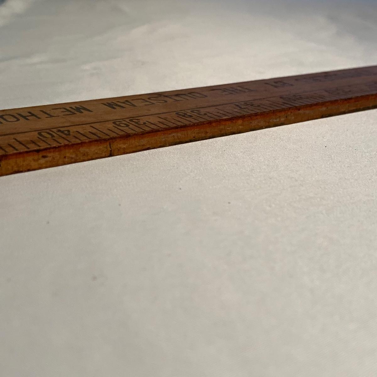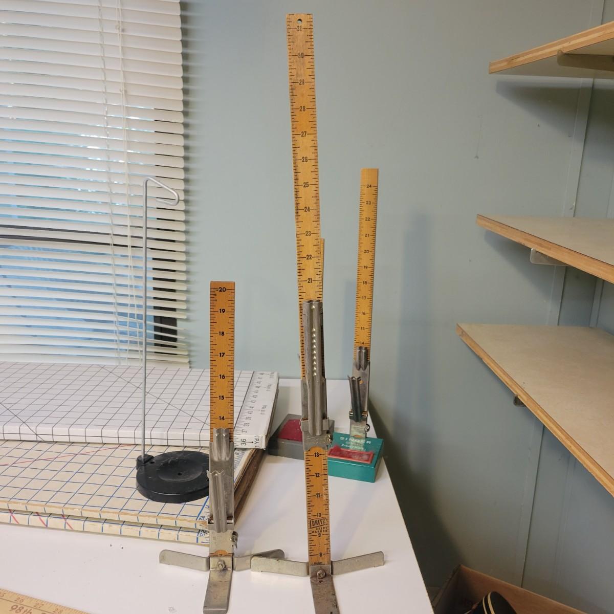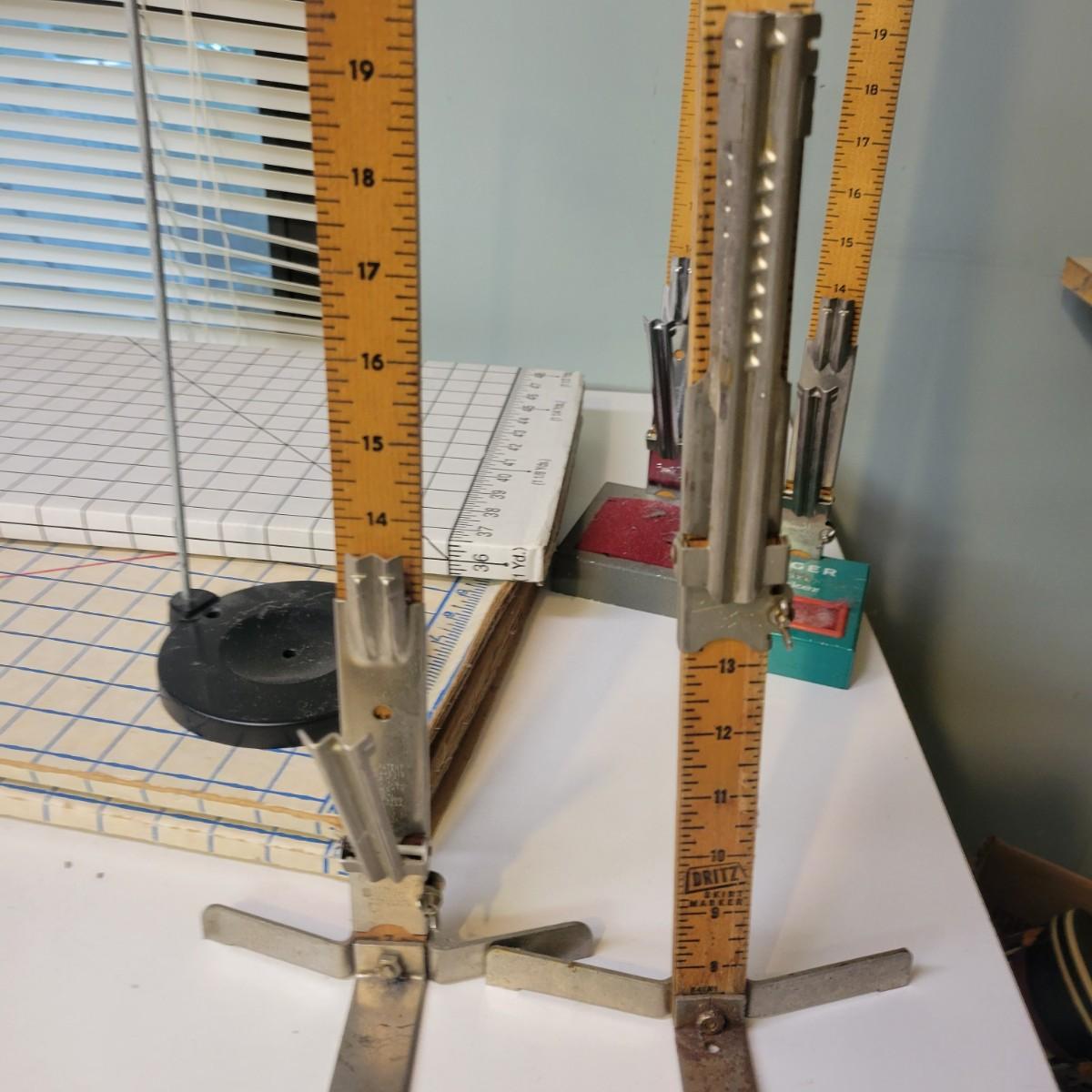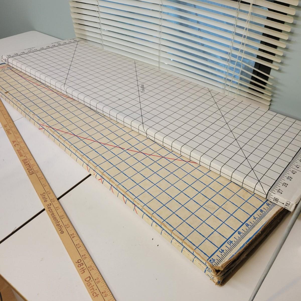 essentials for a sewist. This lot includes a black metal dress form in good condition that measures approximately 20" x 6" x 52". Also includes four skirt markers, two pattern boards, a yardstick, and a solid wood Mitchell’s Tailors Rule for use in a tailor shop to cuff trousers by the out seam method. Table in the pictures is not included. Local pickup only