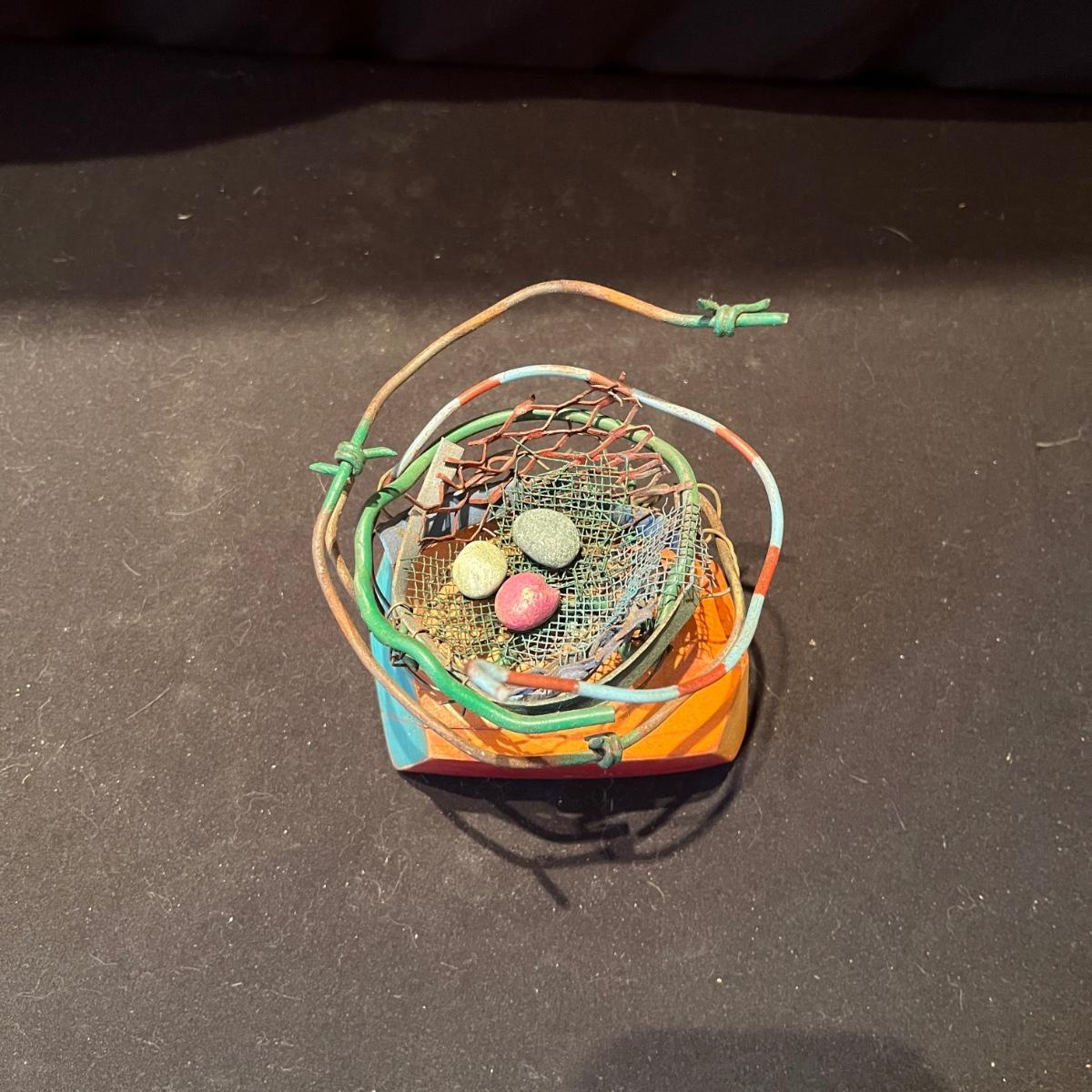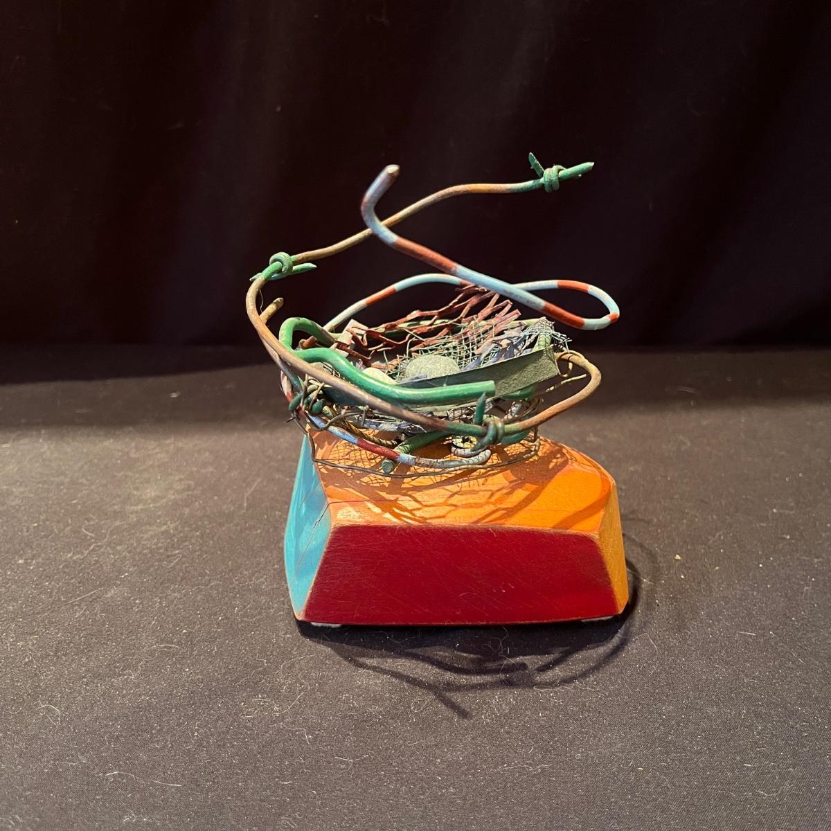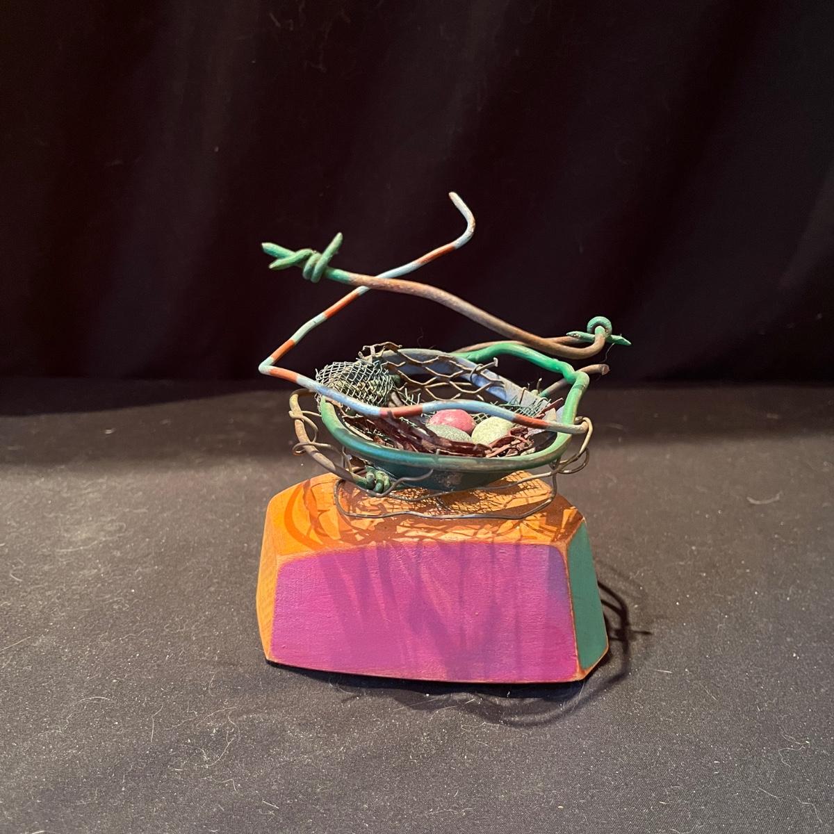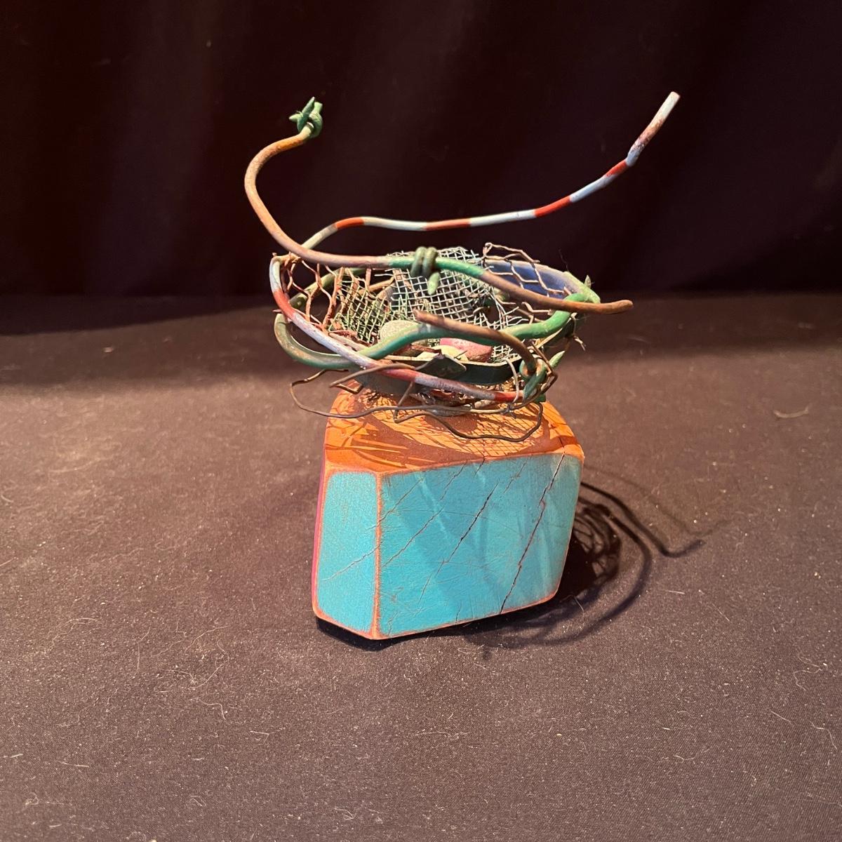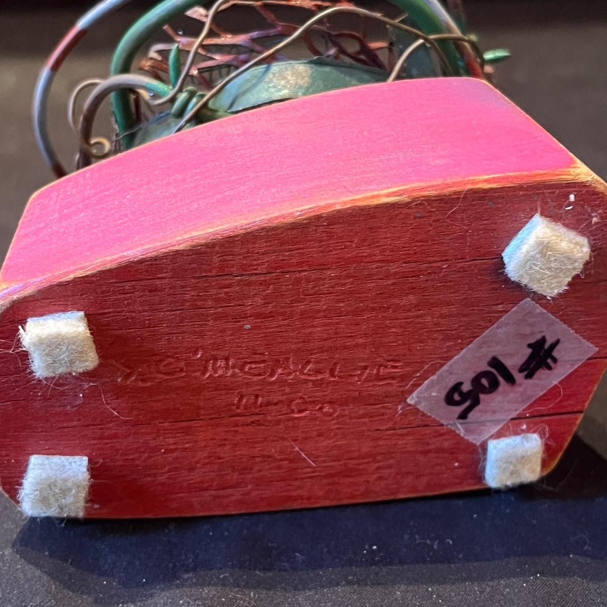 This mixed media signed art by Sean O’Meallie is made up of barbed wire, screen, pebbles and has a painted wooden base. Piece measures 4.5” x. 4.5” x 5”H.