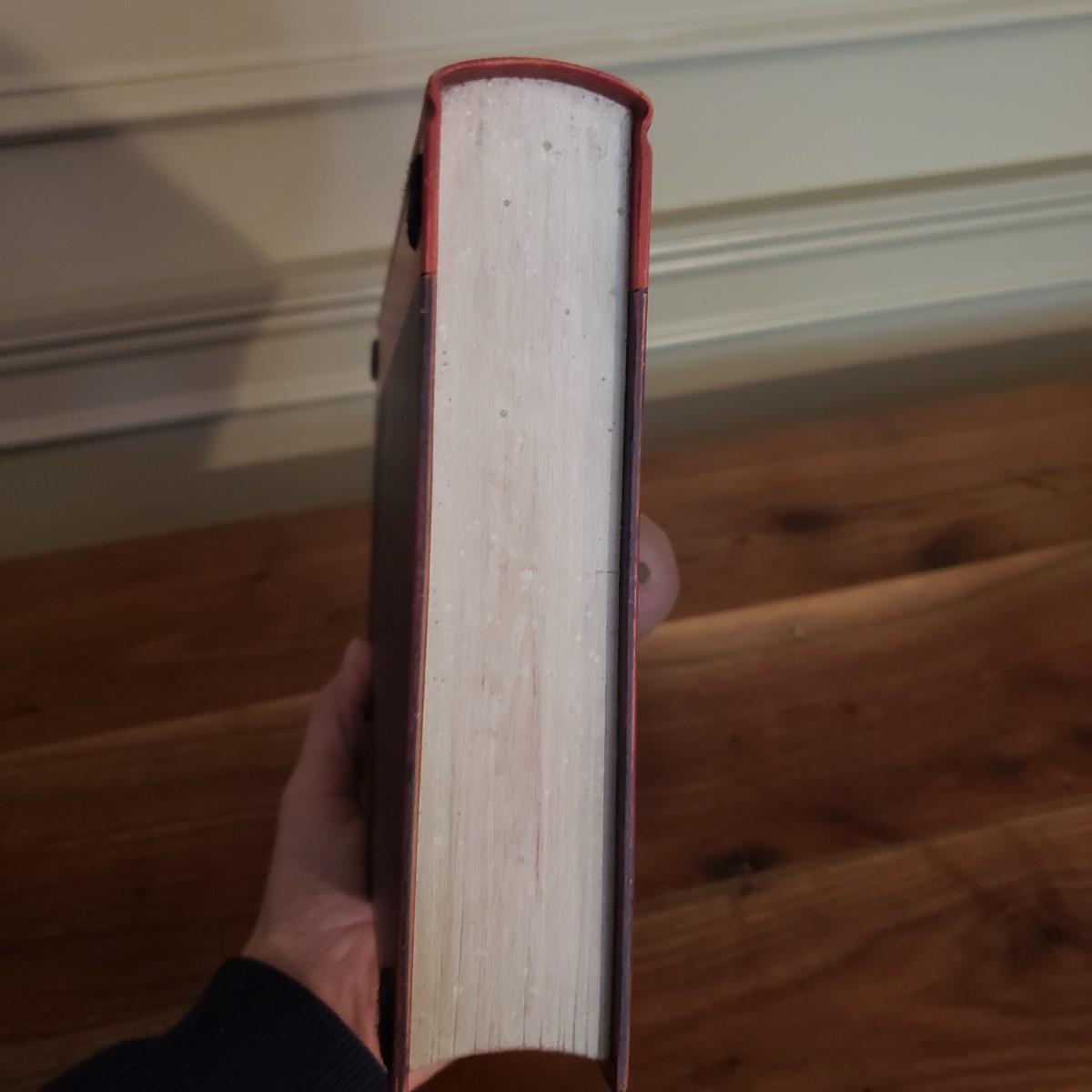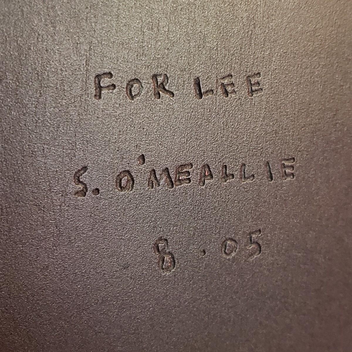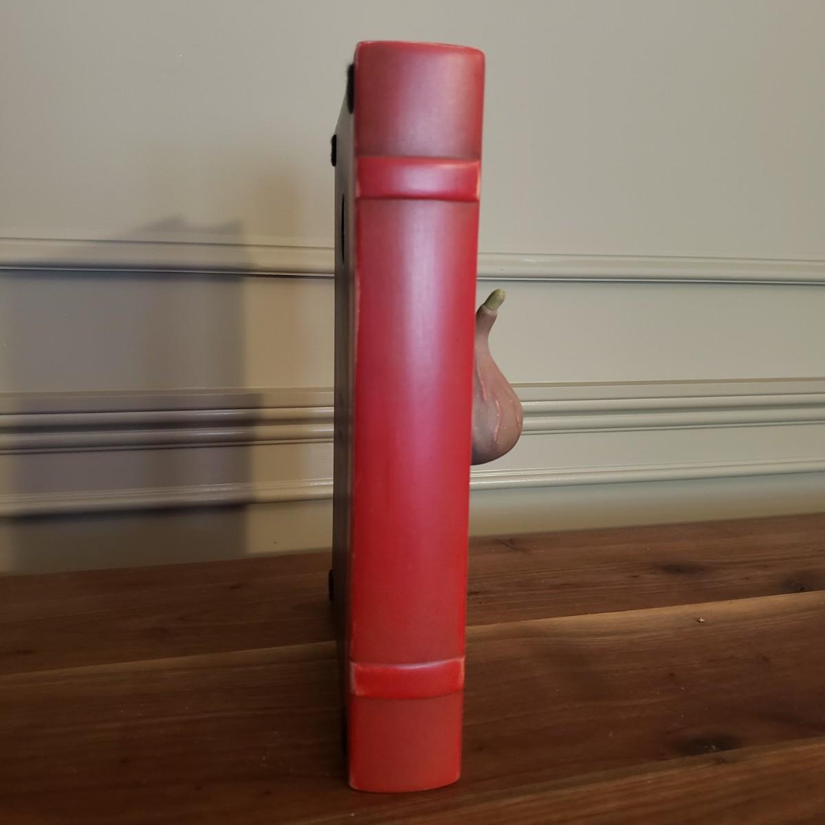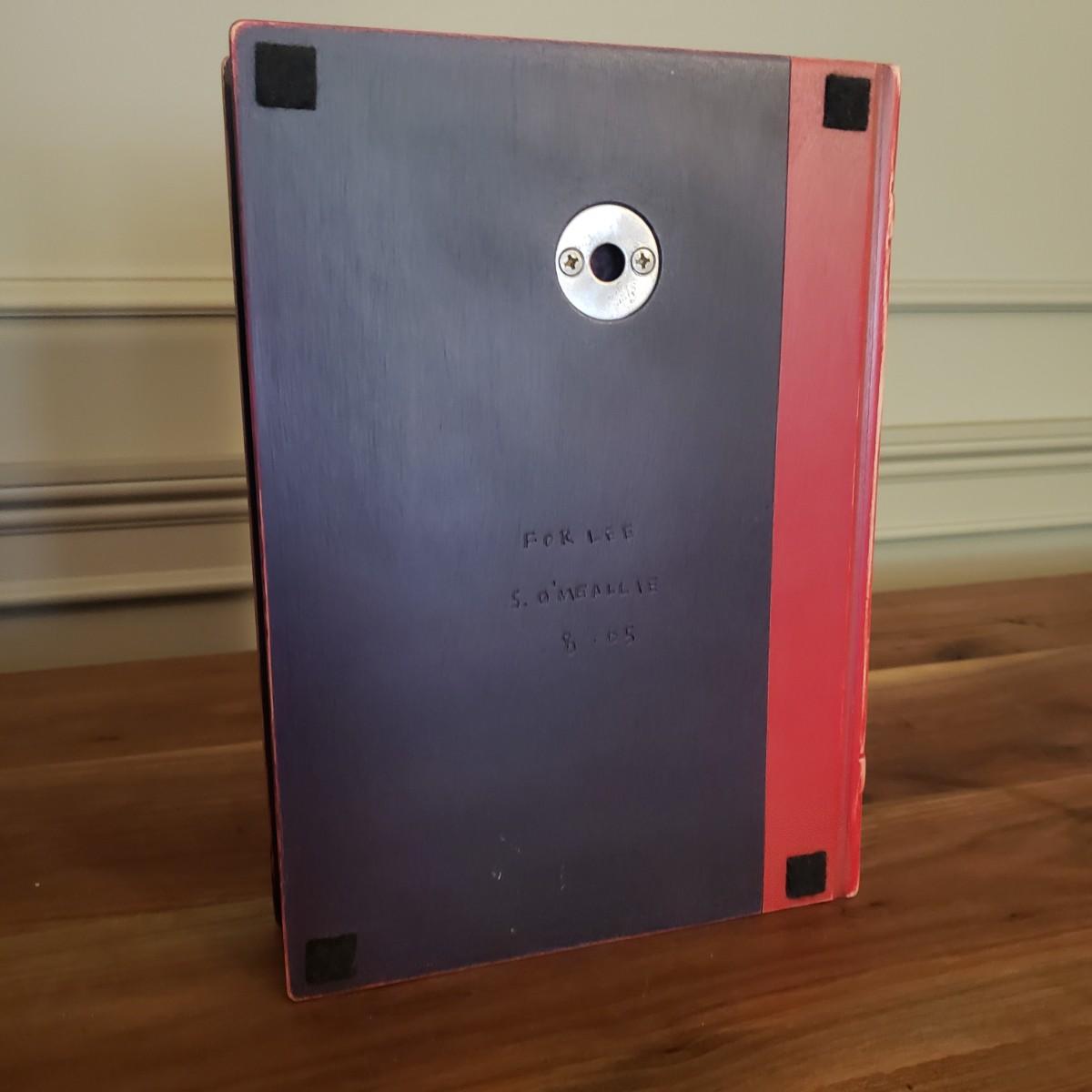 This signed Sean O'Meallie sculpture features a black book with a red binding with a three dimensional fig on the front. This piece measures 8" x 3" x 10"H. The back states "For Lee Sean O'Meallie 8-05". There is a metal hanger for easy wall hanging, along with four felt pieces in each corner.