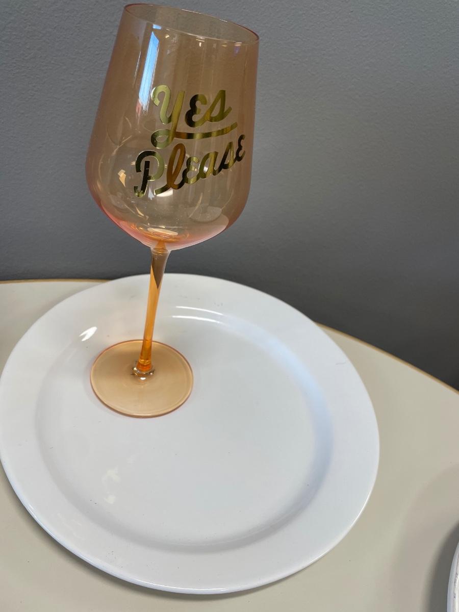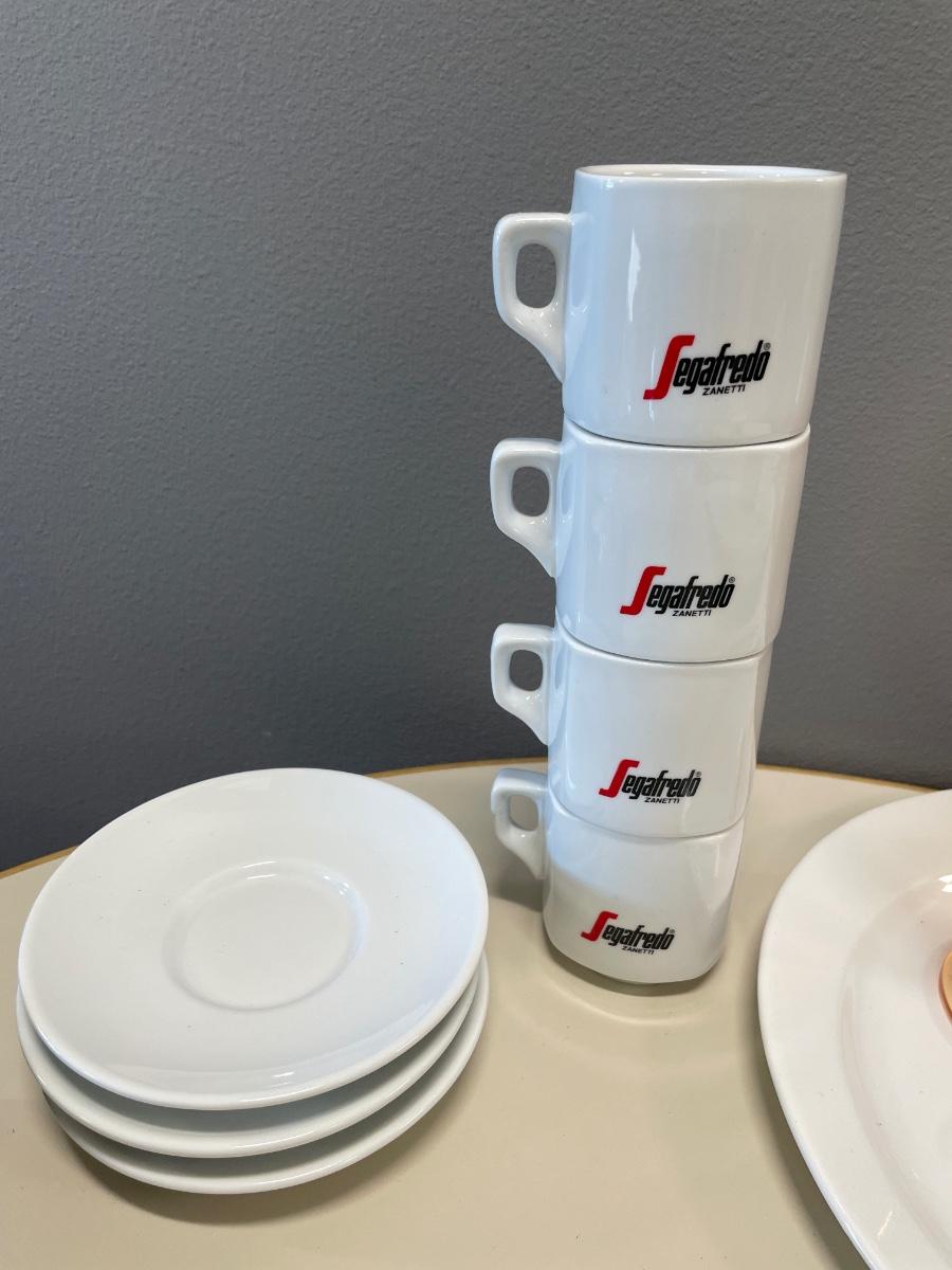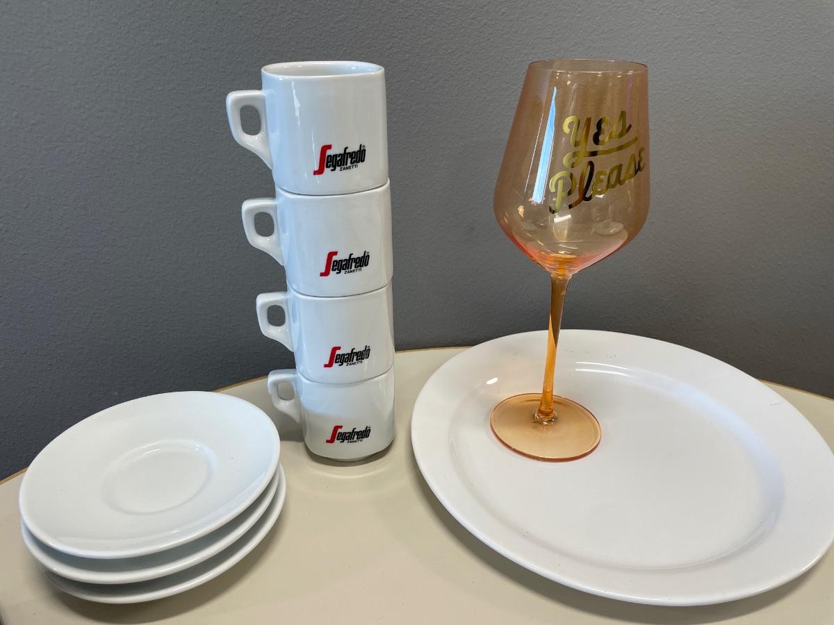Seared stacking cups with wine glass, plate and saucers