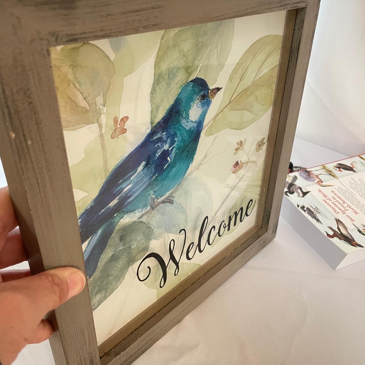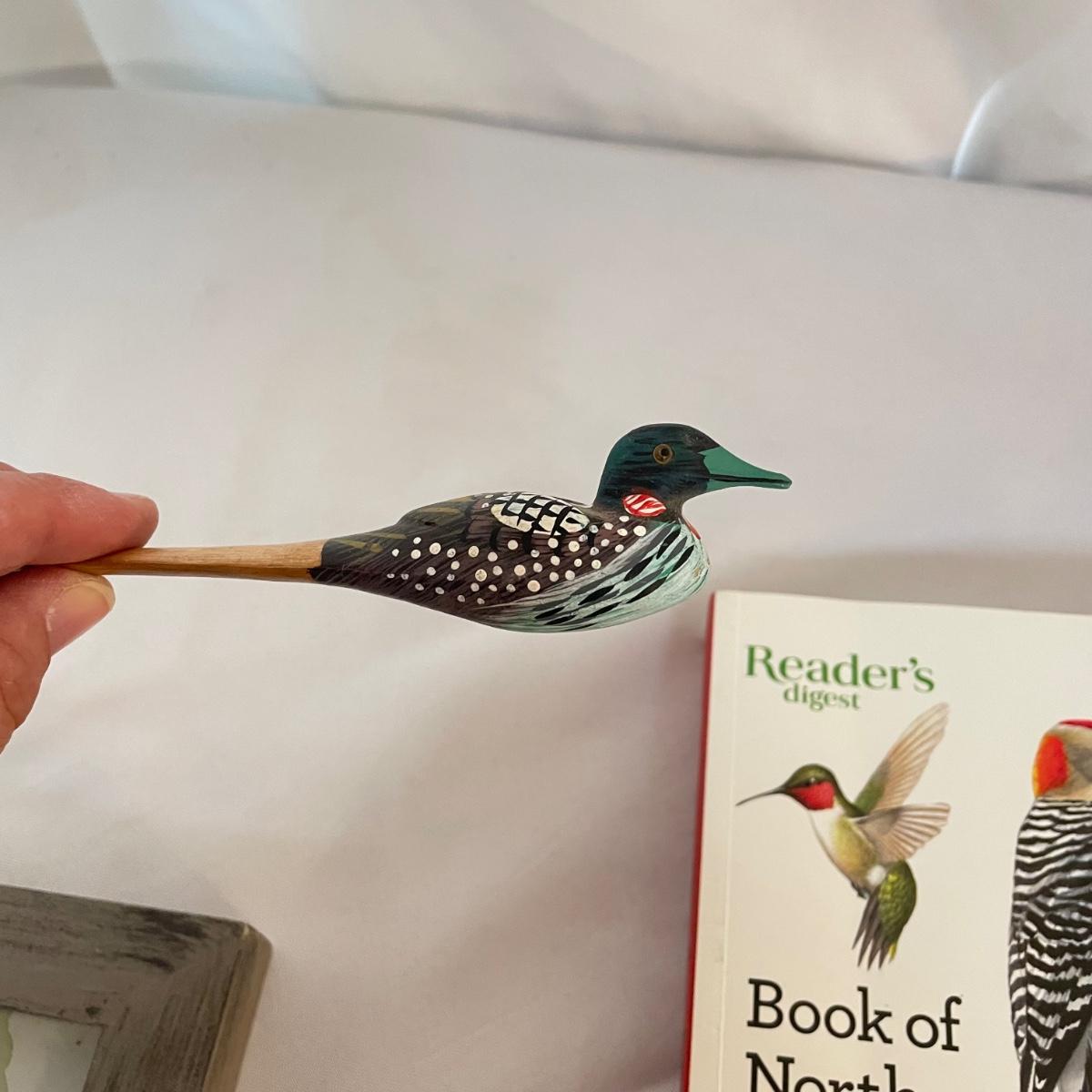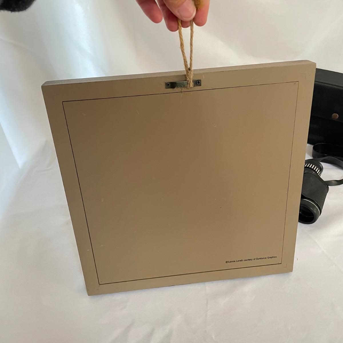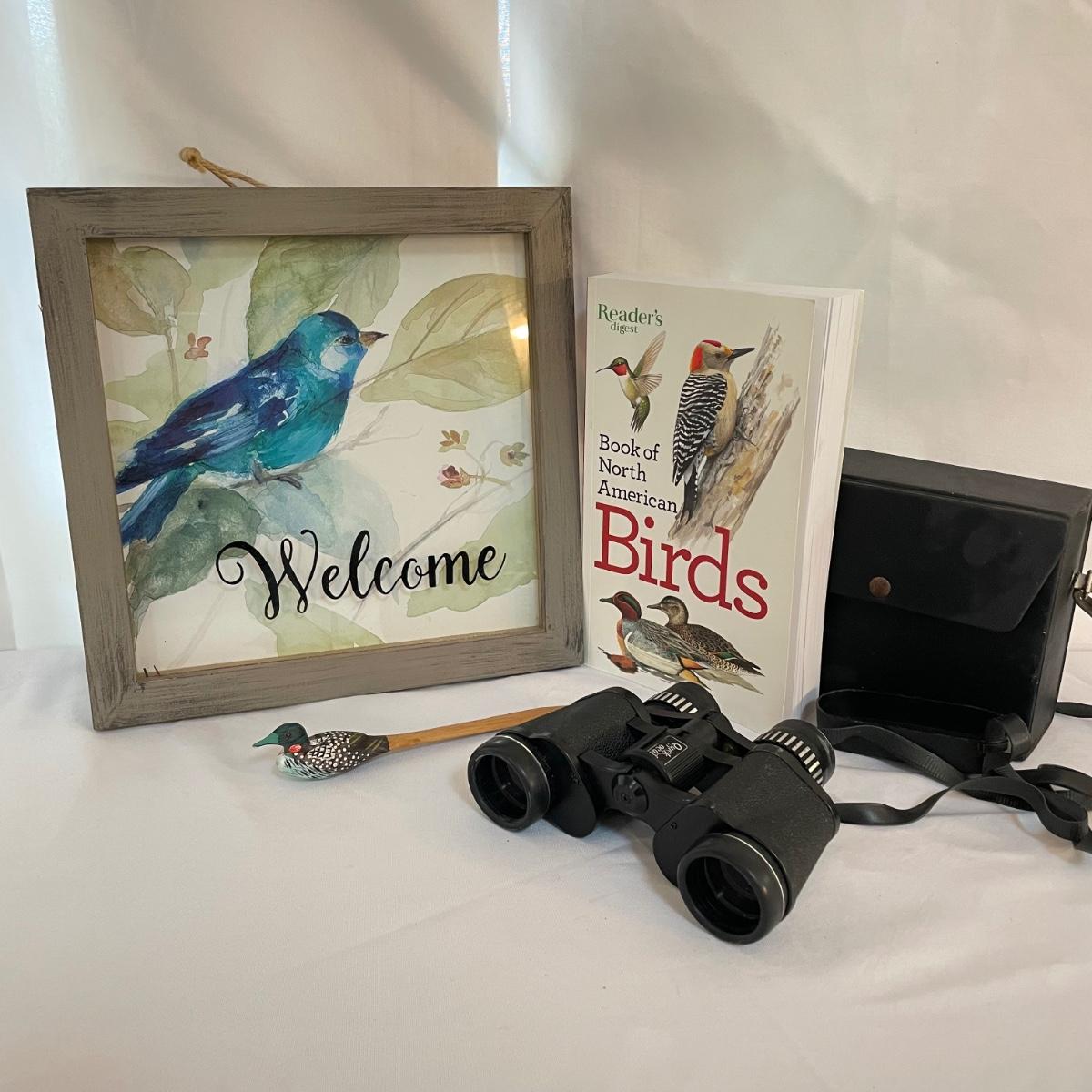 The perfect lot for a beginning birder! Lot includes graphic art hallmarked Lannie Loreth courtesy of Sundance Graphics that measures 11.75”SQ. An older model Sears binoculars and case, the Reader’s Digest Book of North American Birds and a carved wooden mallard letter opener/bookmark. See images. Shipping available.