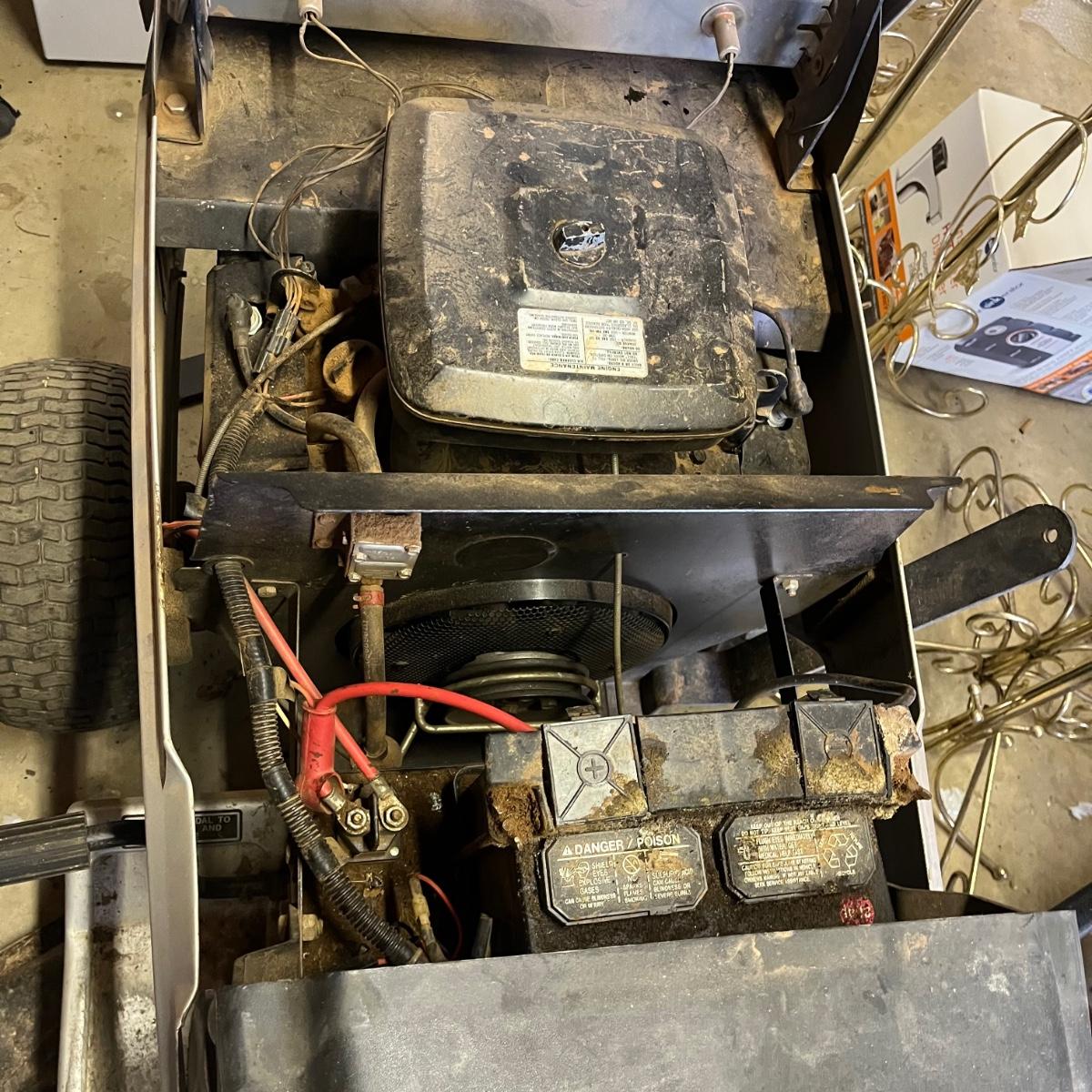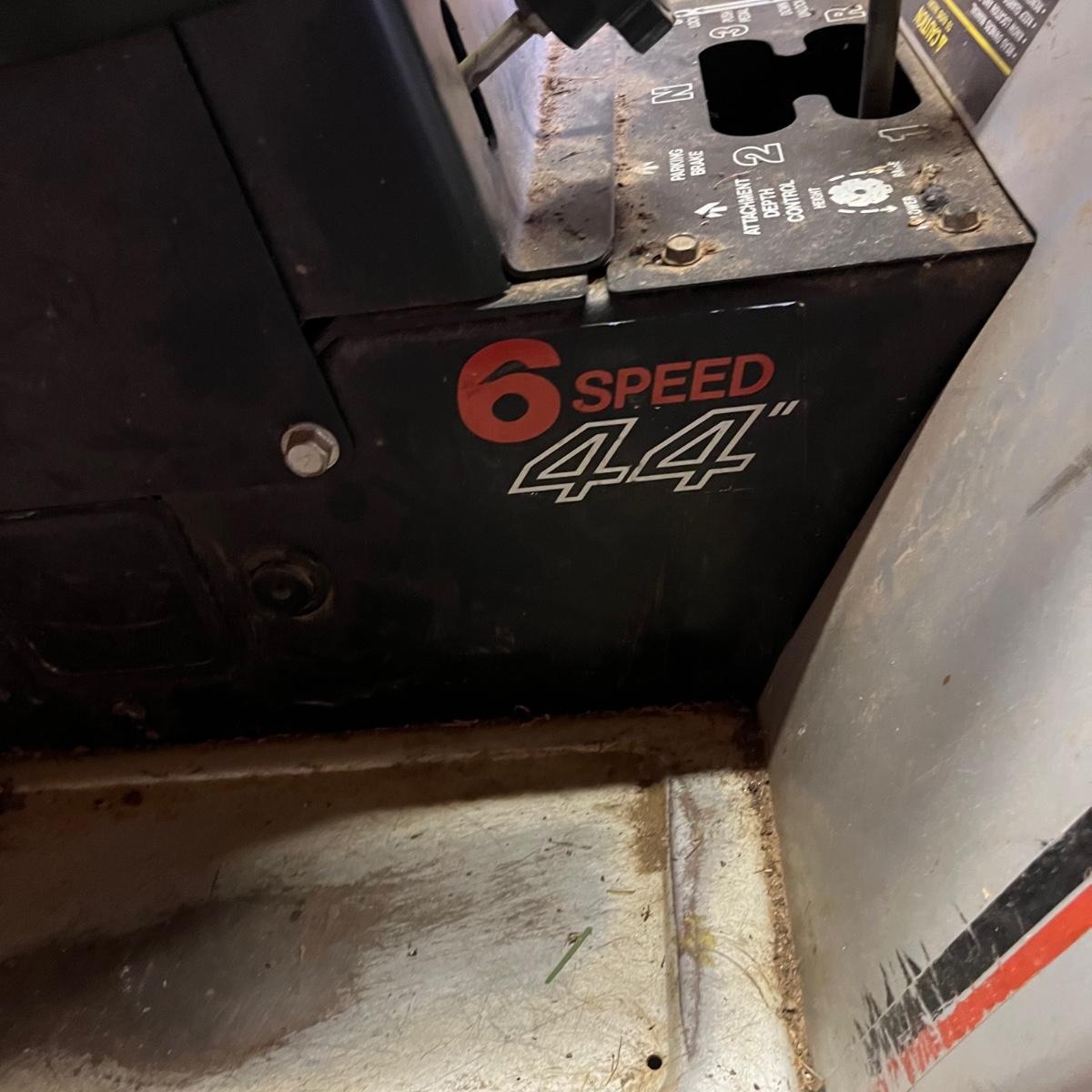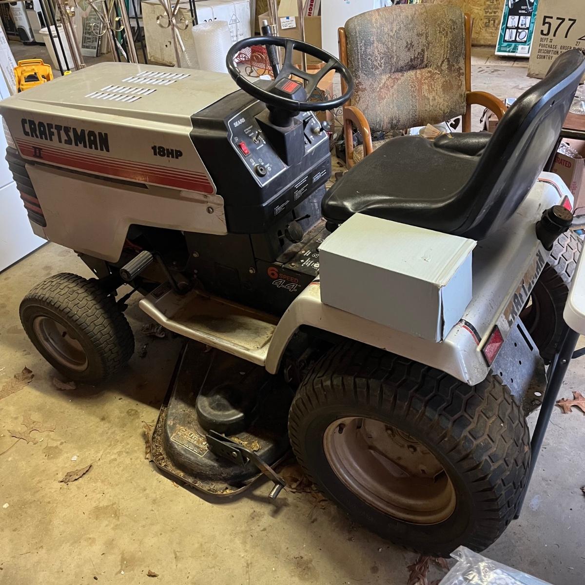 Lot includes a Sears Craftsman riding mower with a 44” cut and a 18HP motor and six speed transmission. Mower will need work, battery is dead, no key and seat has rip. Winning bidder must bring assistance to help move and load this item due to its weight and/or size. Also includes a starter.