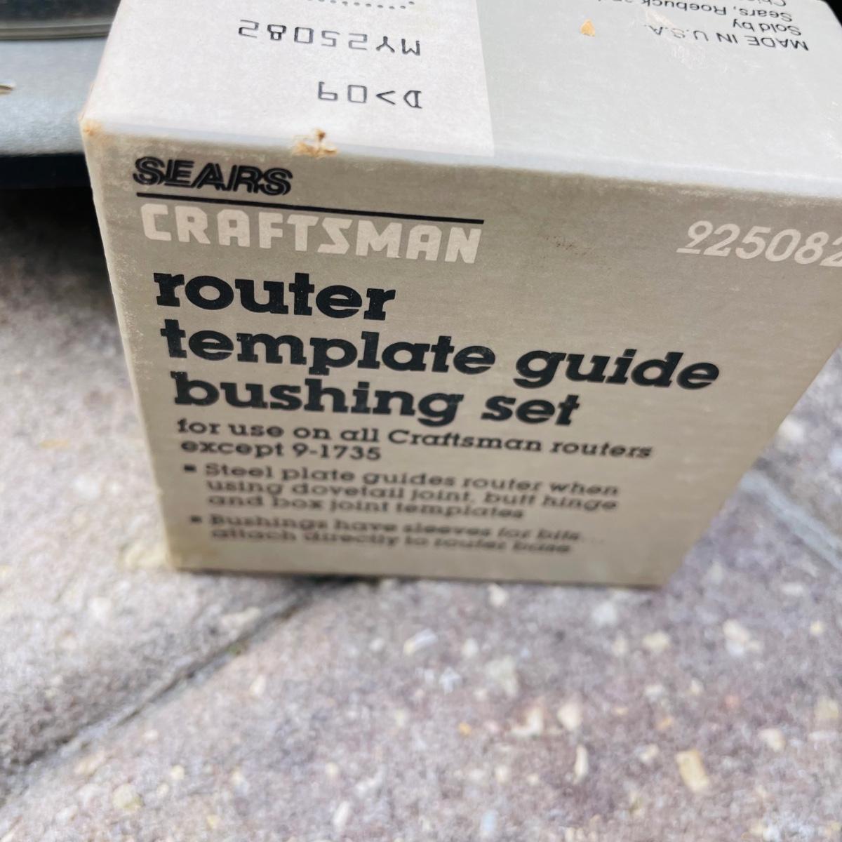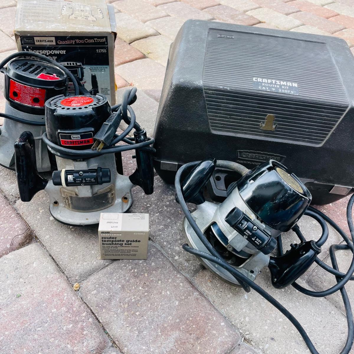 A bundle of Craftsman Routers! 3 Craftsman power routers. One includes original case with saw attachment. One also with original box. All 3 have been powered on. Bundle includes a router template guide bushing set.