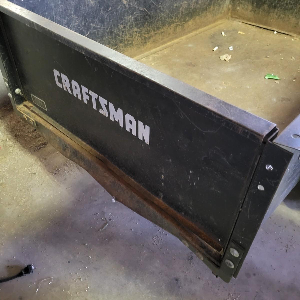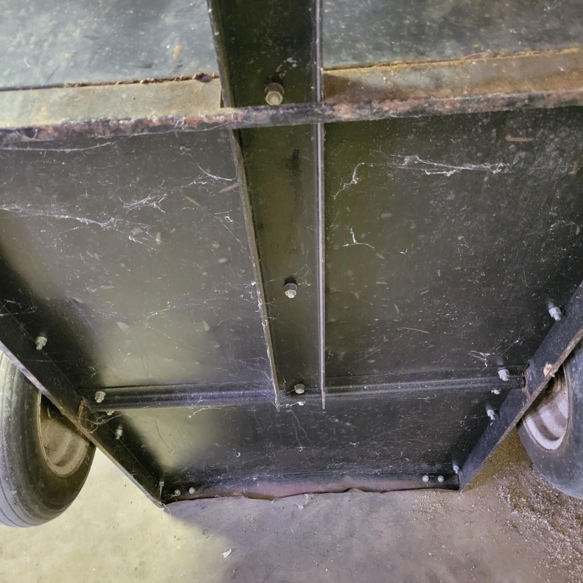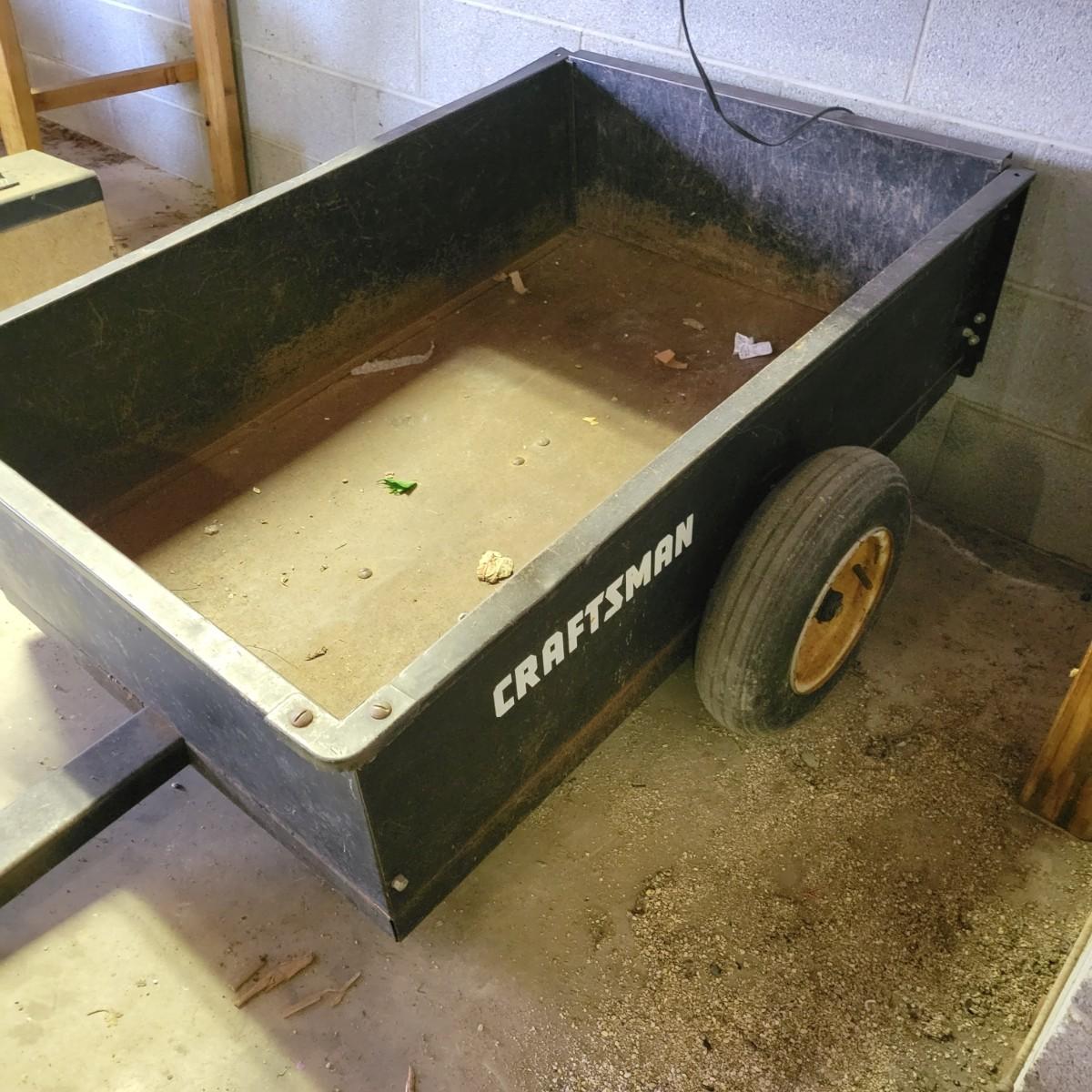 A Sears Craftsman garden cart designed to be towed behind a mower. Made of steel and the tires need to be inflated, but aren't dry rotted. Measures approximately 41" x 69" x 20"H. Local pickup only