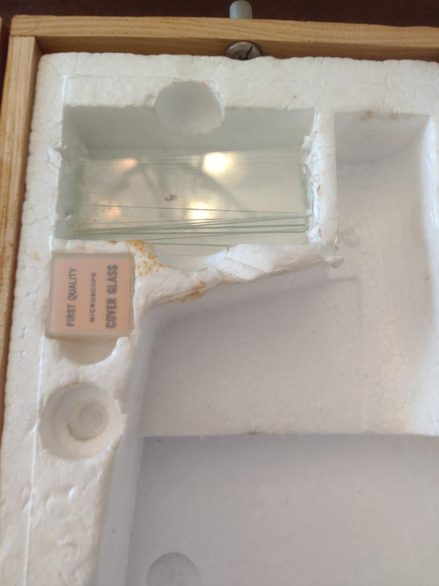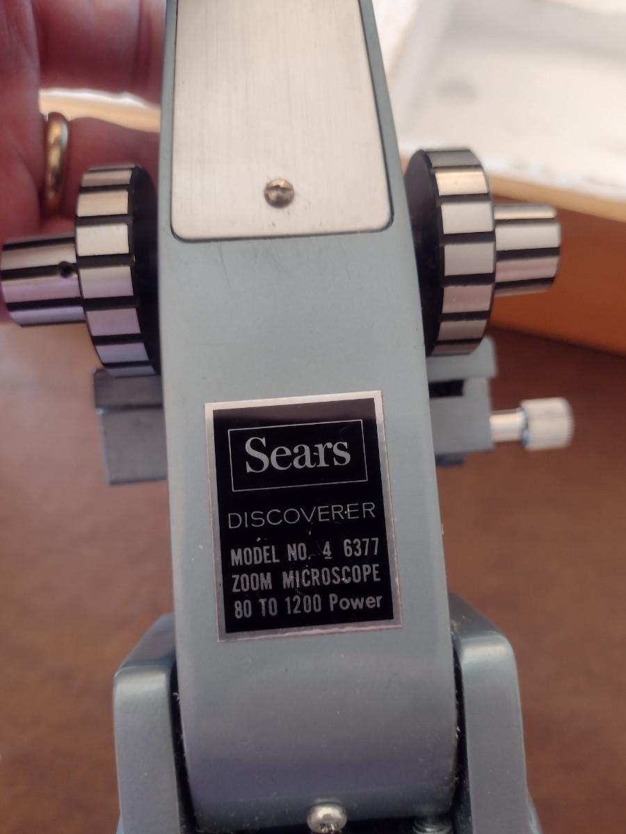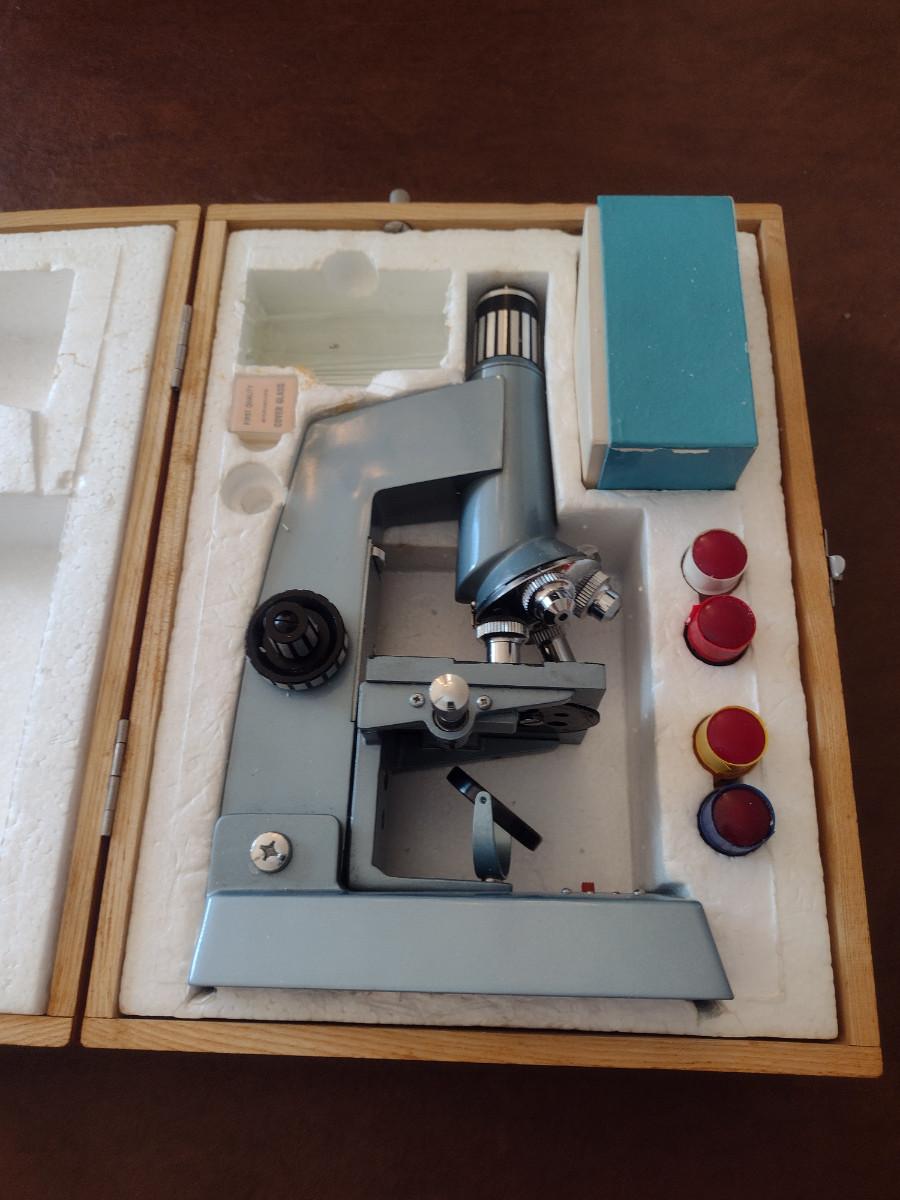 Sears Discoverer Zoom Microscope with Wooden Case- Model 4 6377. Carry handle on case is broken.
