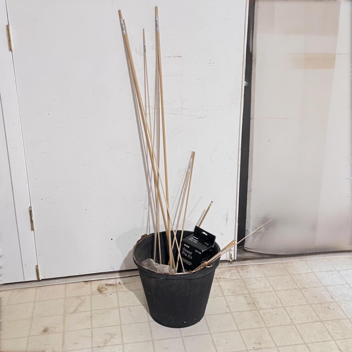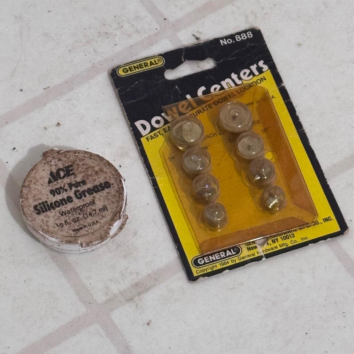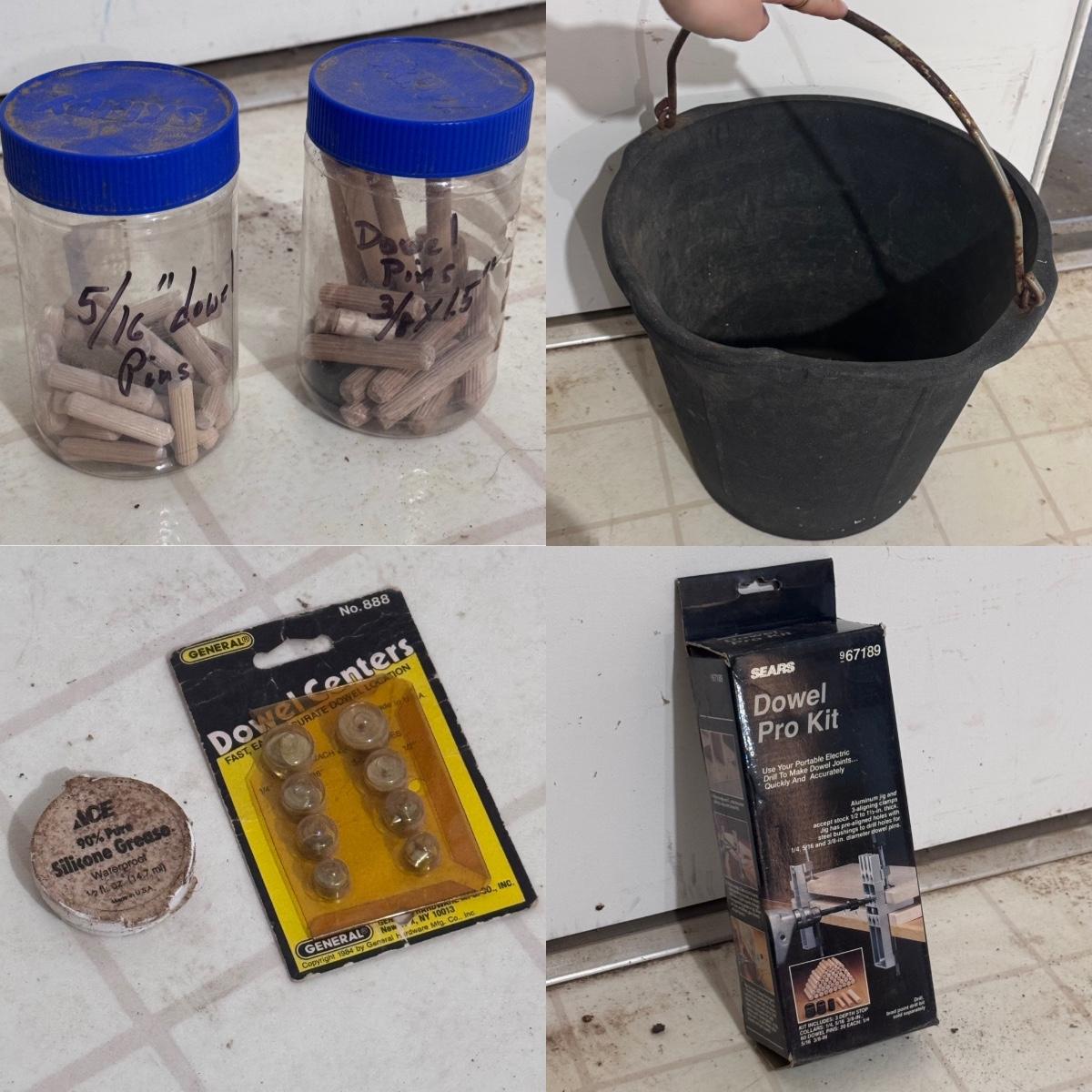 This lot includes one Sears Dowel pro kit, 90% pure silicone grease from Ace Hardware, pack of dowel centers, wooden dowel pins, and a bucket made of recycled car tires. It measures 14” x 11”H. See photos for item details. Local pickup only.