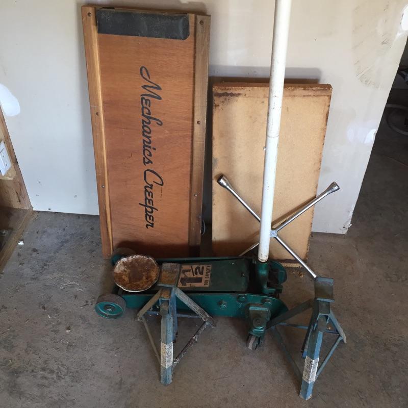 Sears one and a half ton floor jack , pair of three ton jack stands , Mechanics creeper and more. Great tools to have in your garage.