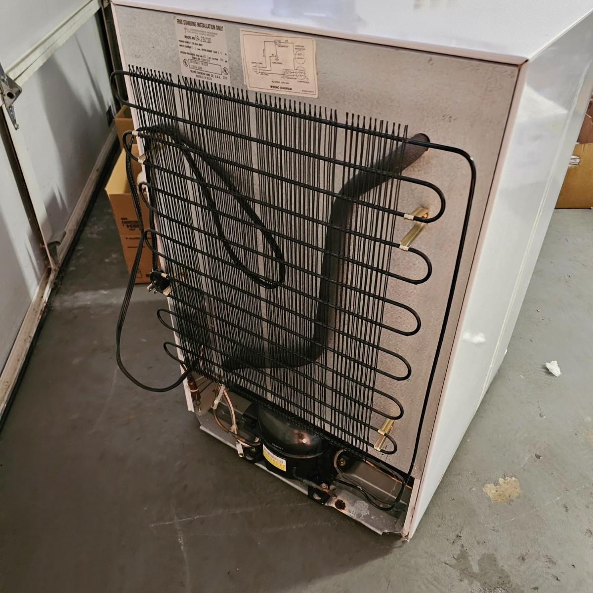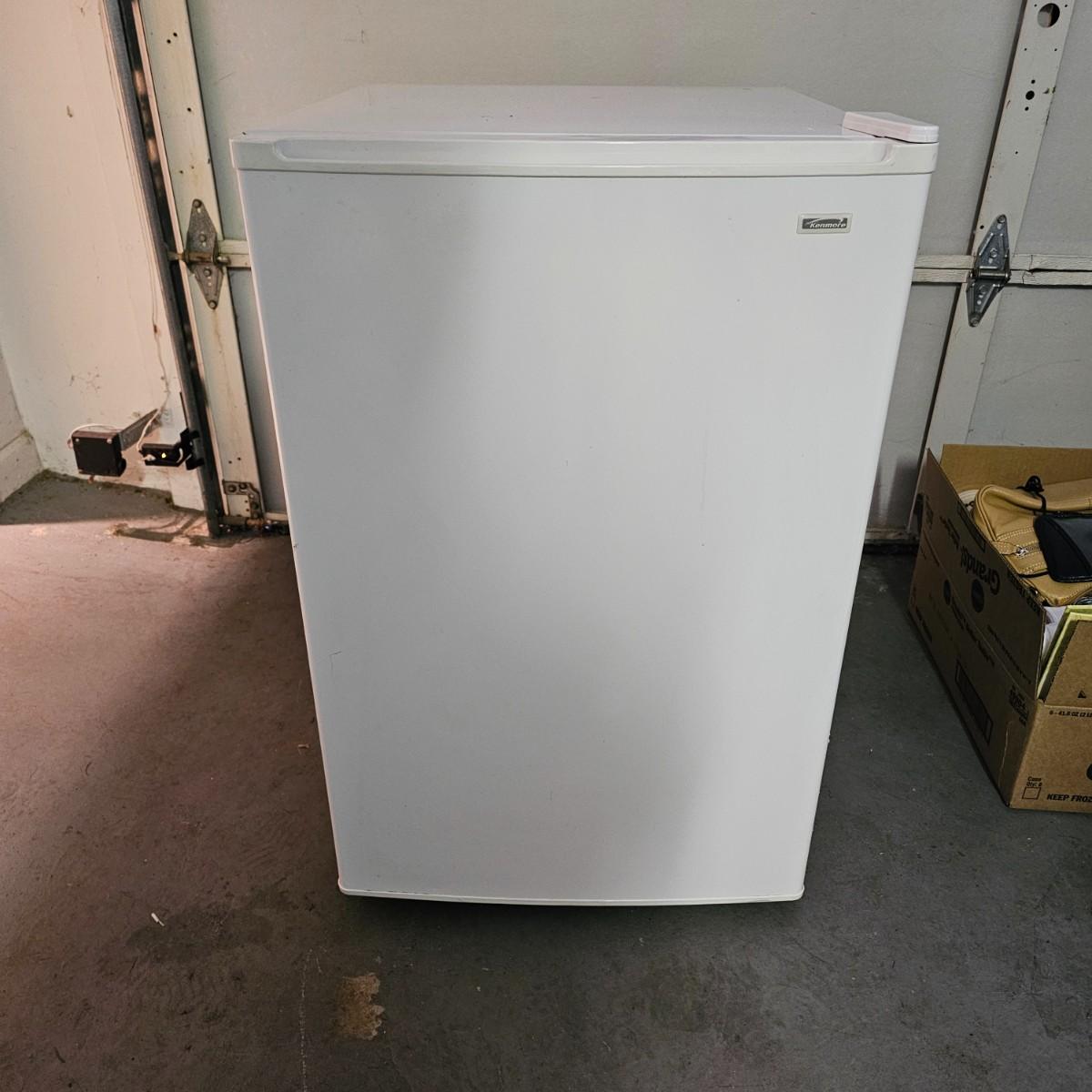 Small compact freezer by Kenmore. Unit has two shelves, temperature control and drip tray at bottom. Measures 21.5" x 26" x 33"H. Unit powered on when plugged in. See photos for details. Local pickup only.