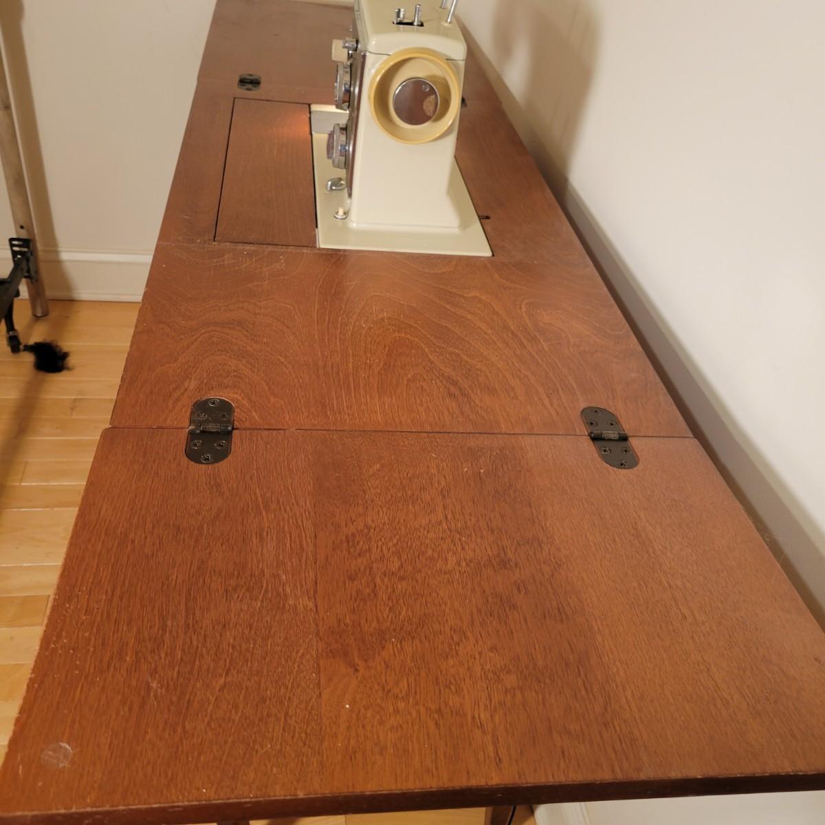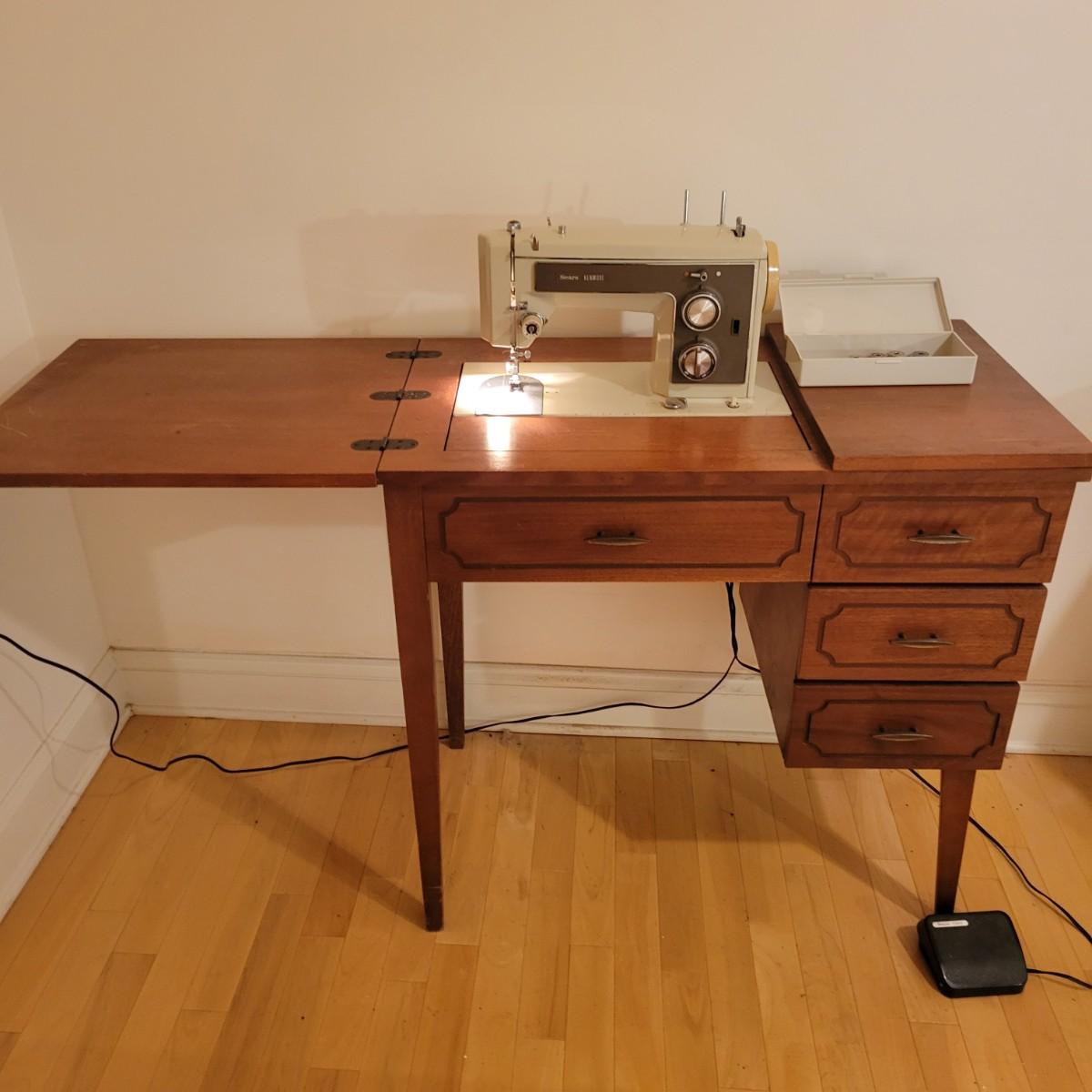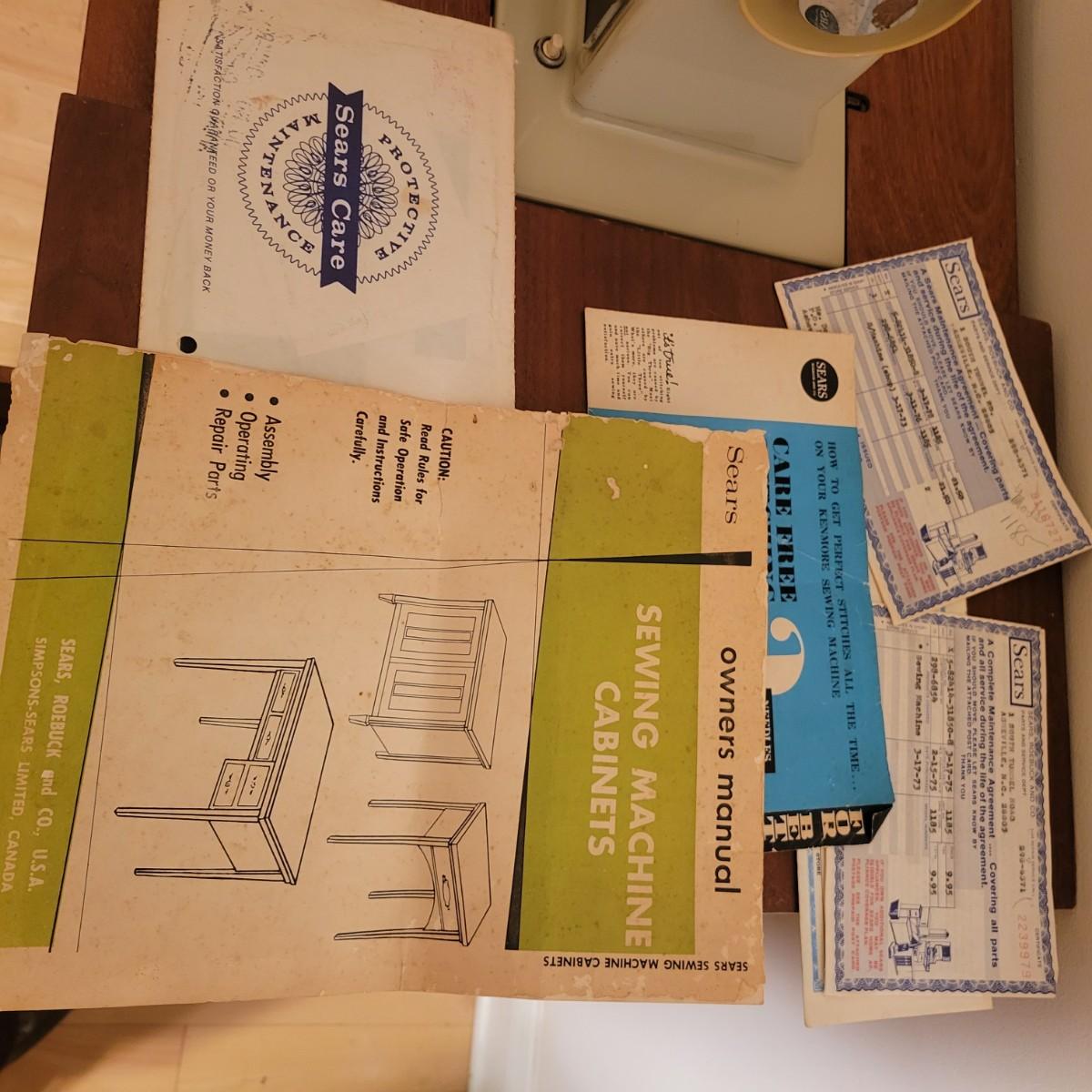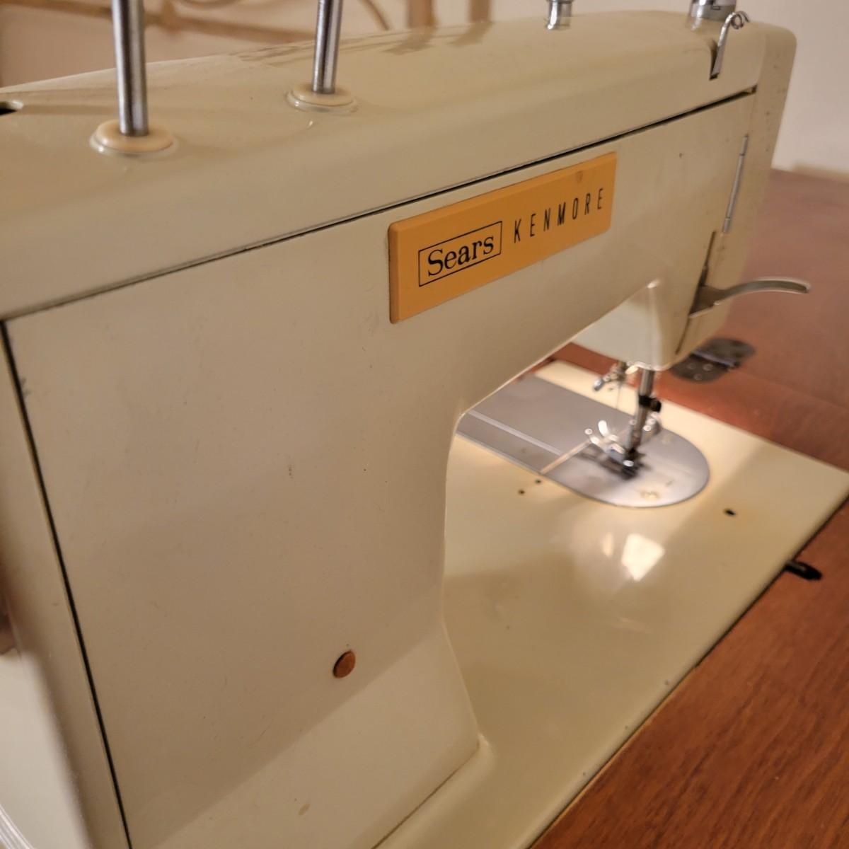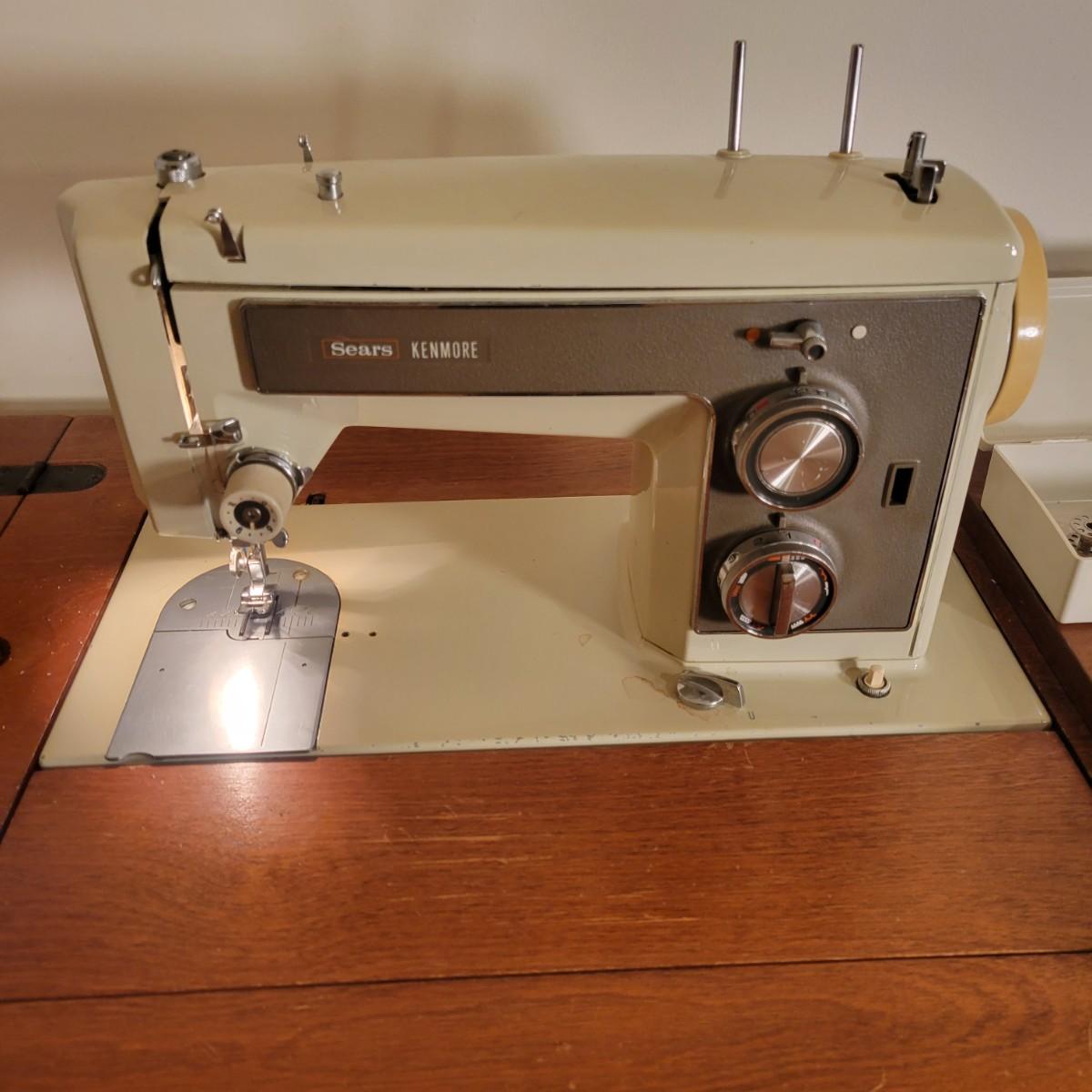 A Sears Kenmore sewing machine and cabinet in good condition. Cabinet does have a loose leg and some minor scratches and blemishes. Sewing machine was tested and works. Includes a handful of thread spools cabinet measures approximately 31" x 18" x 31" with the leaves folded in. Local pickup only