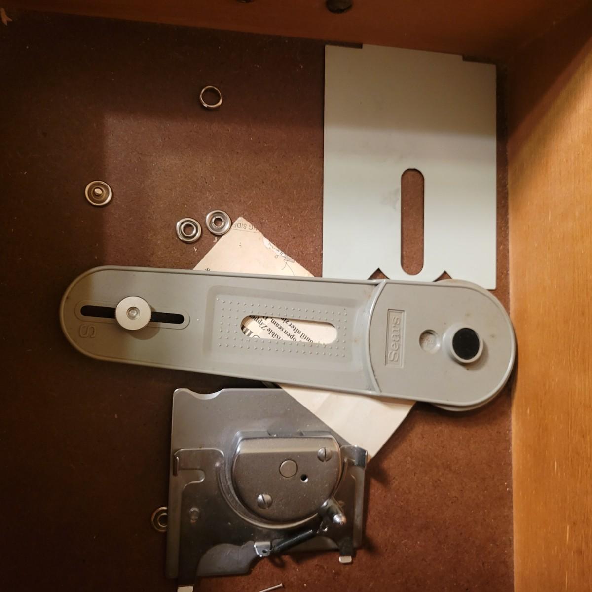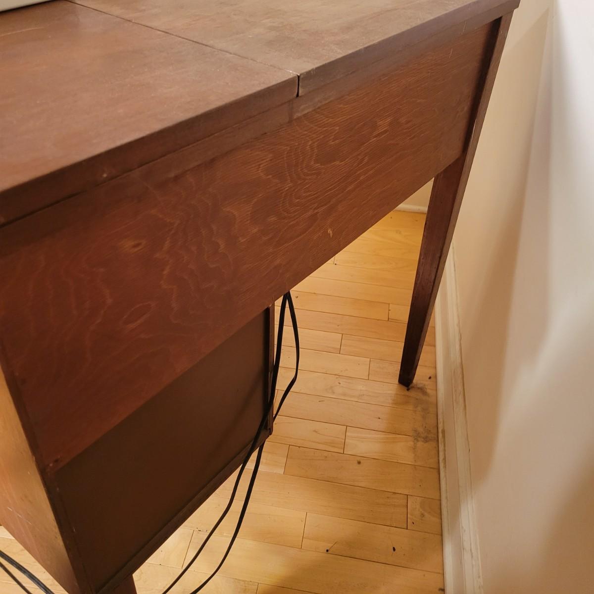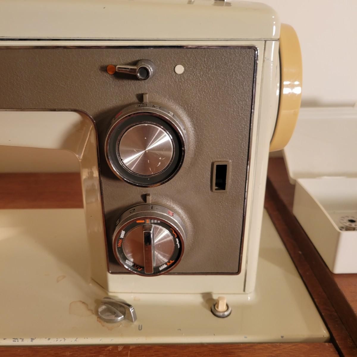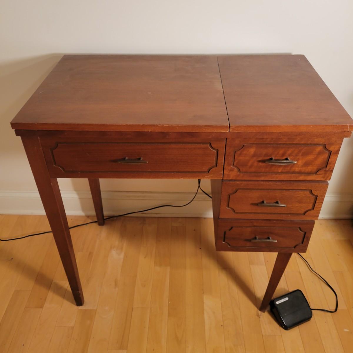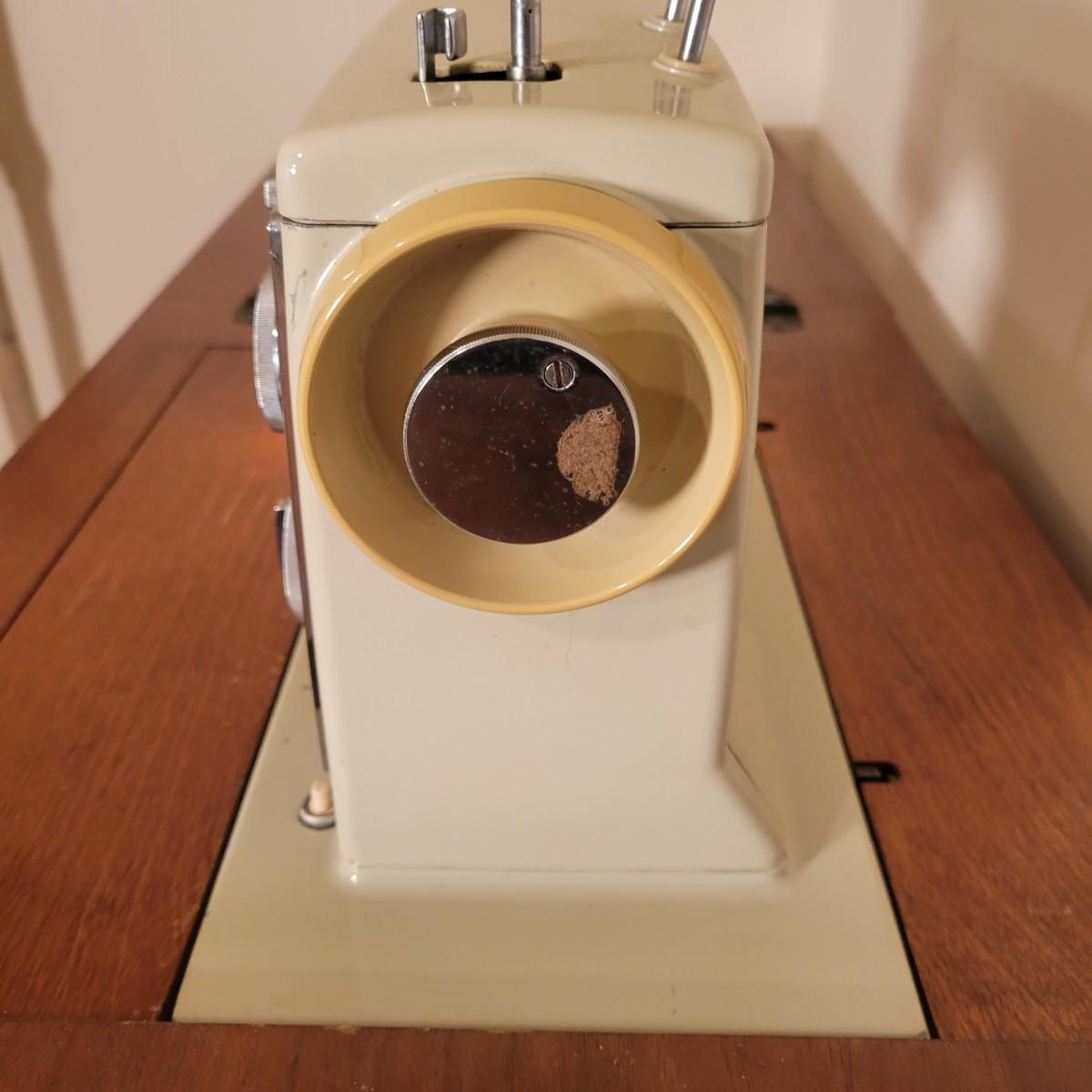A Sears Kenmore sewing machine and cabinet in good condition. Cabinet does have a loose leg and some minor scratches and blemishes. Sewing machine was tested and works. Includes a handful of thread spools cabinet measures approximately 31" x 18" x 31" with the leaves folded in. Local pickup only
