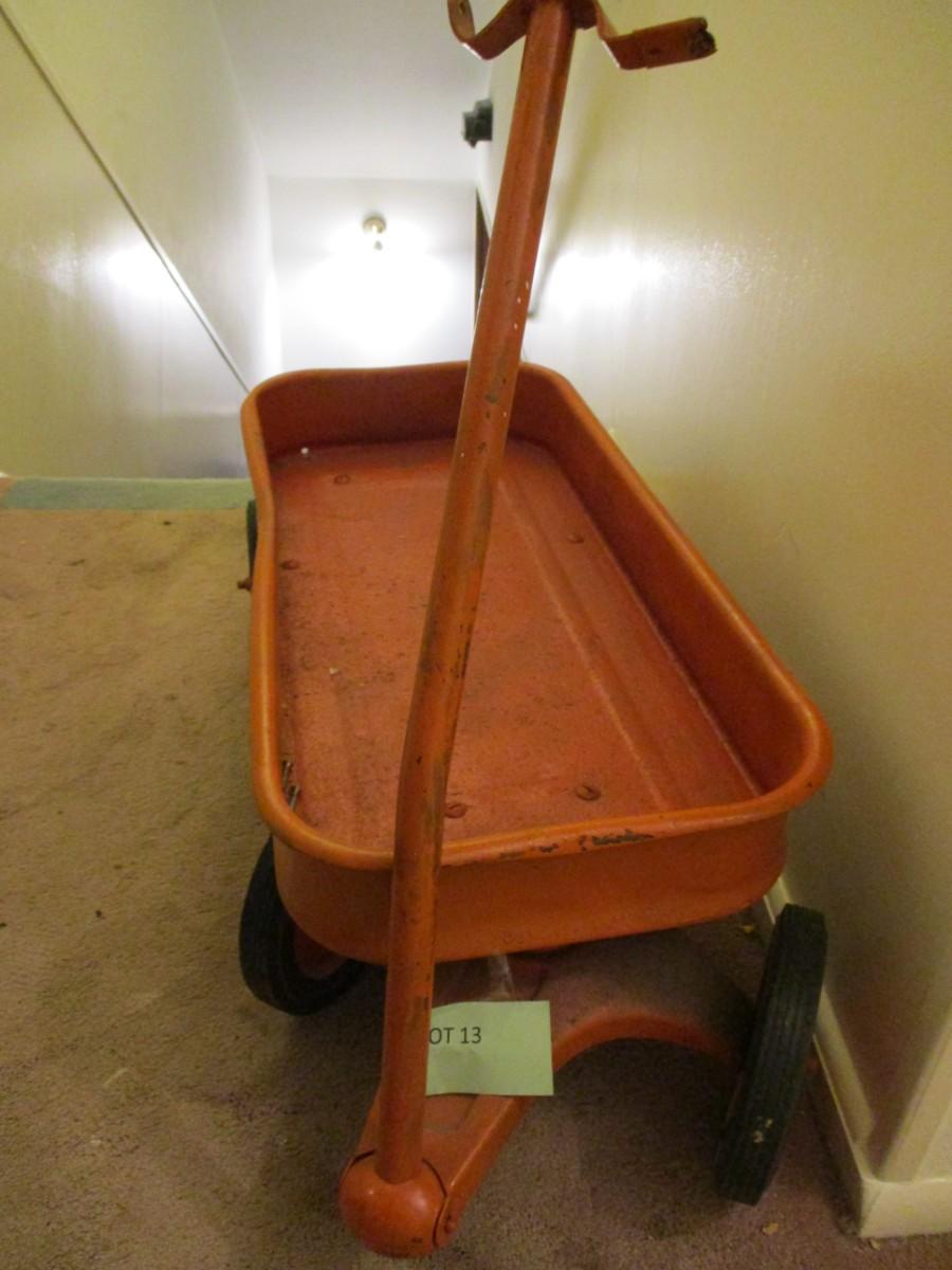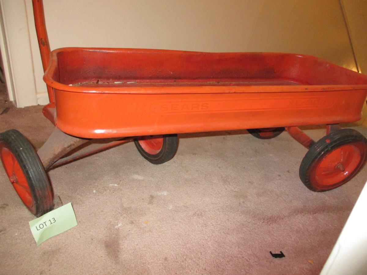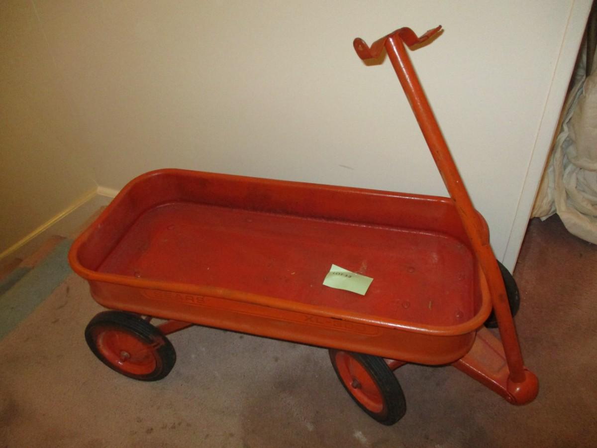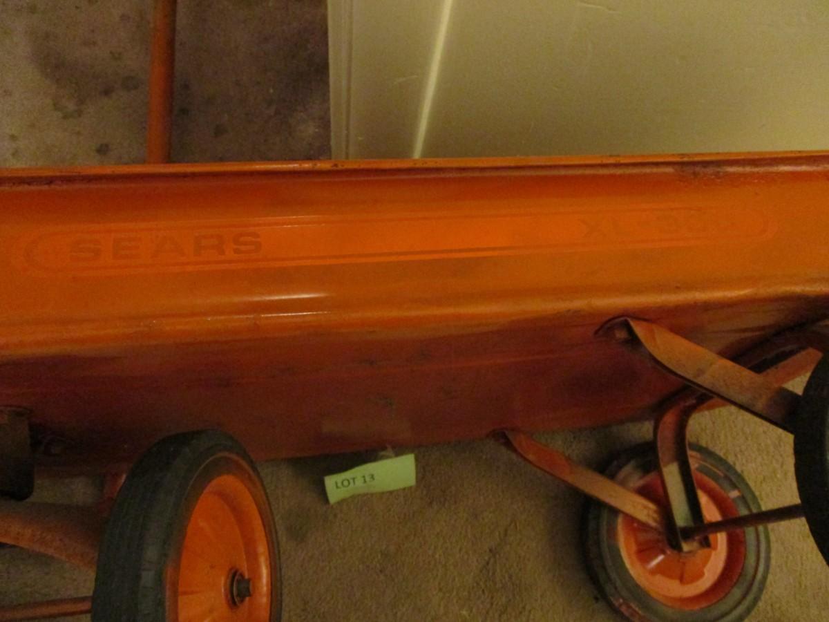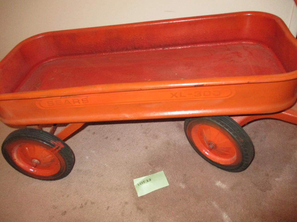 Sears XL-300 toy metal wagon. Painted orange. Wheels wobbly. Dented around rim. Normal wear.
