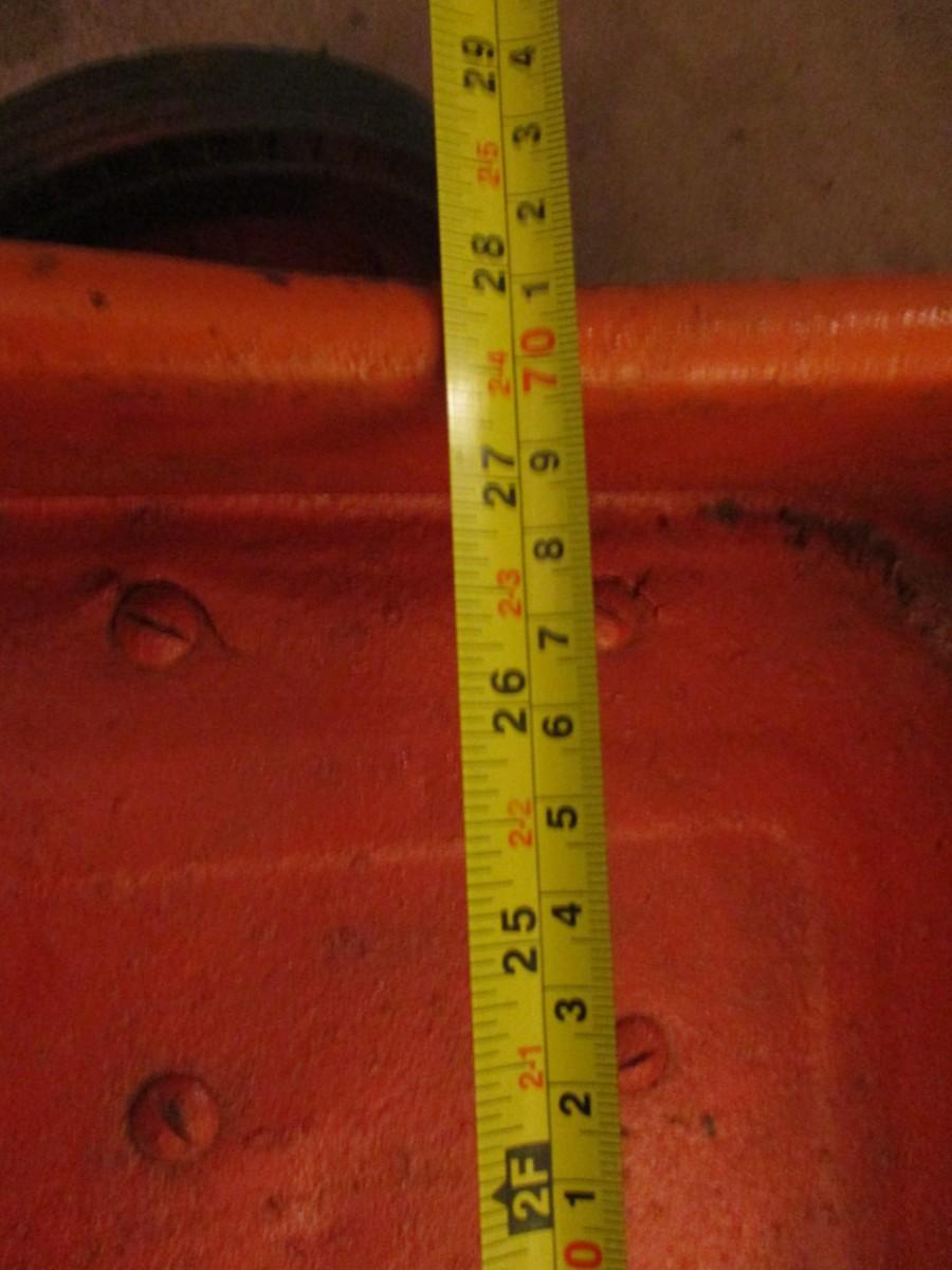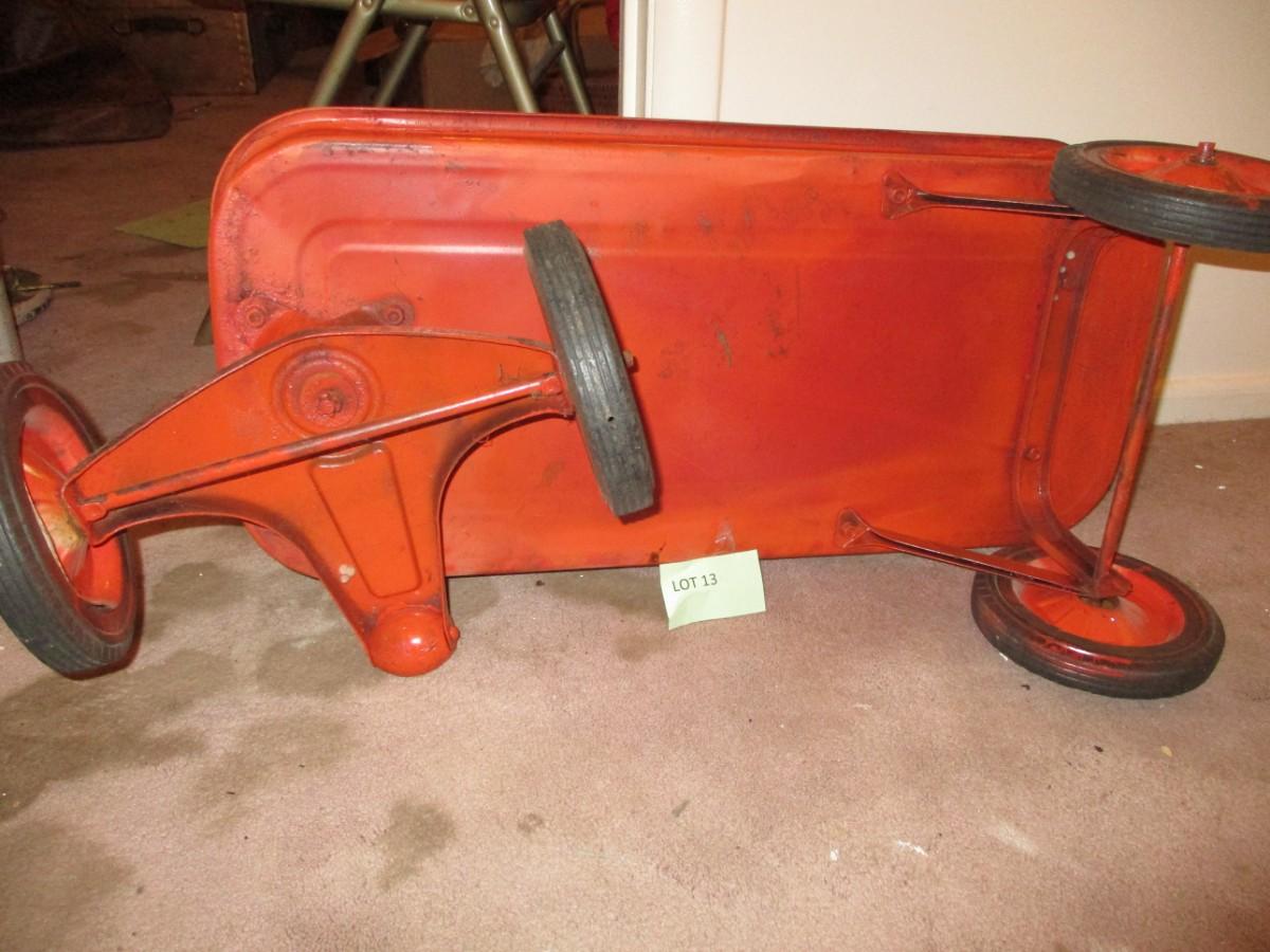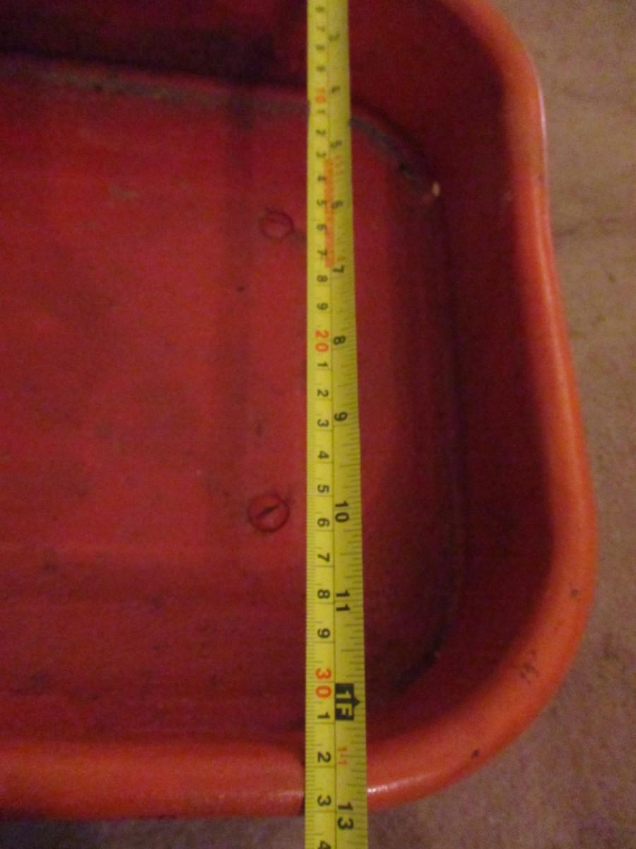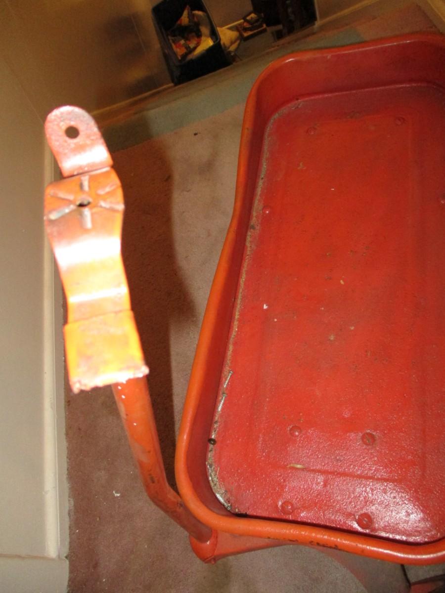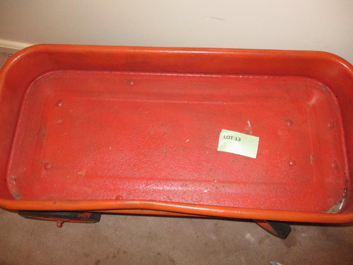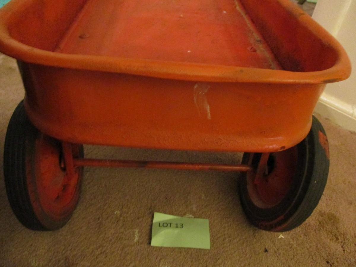 Sears XL-300 toy metal wagon. Painted orange. Wheels wobbly. Dented around rim. Normal wear.