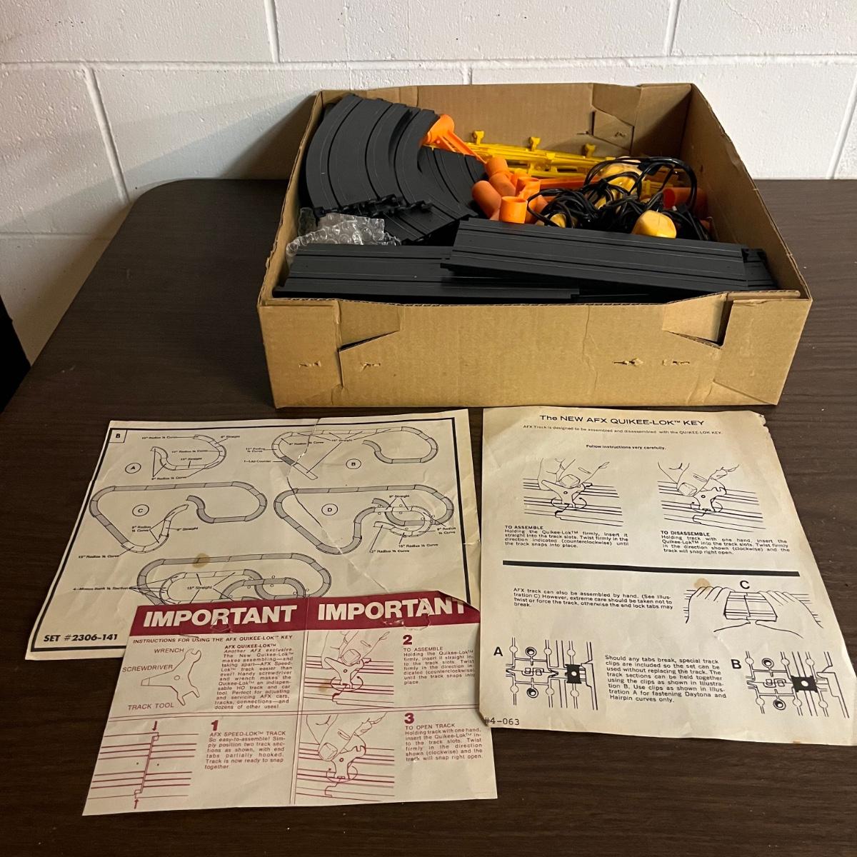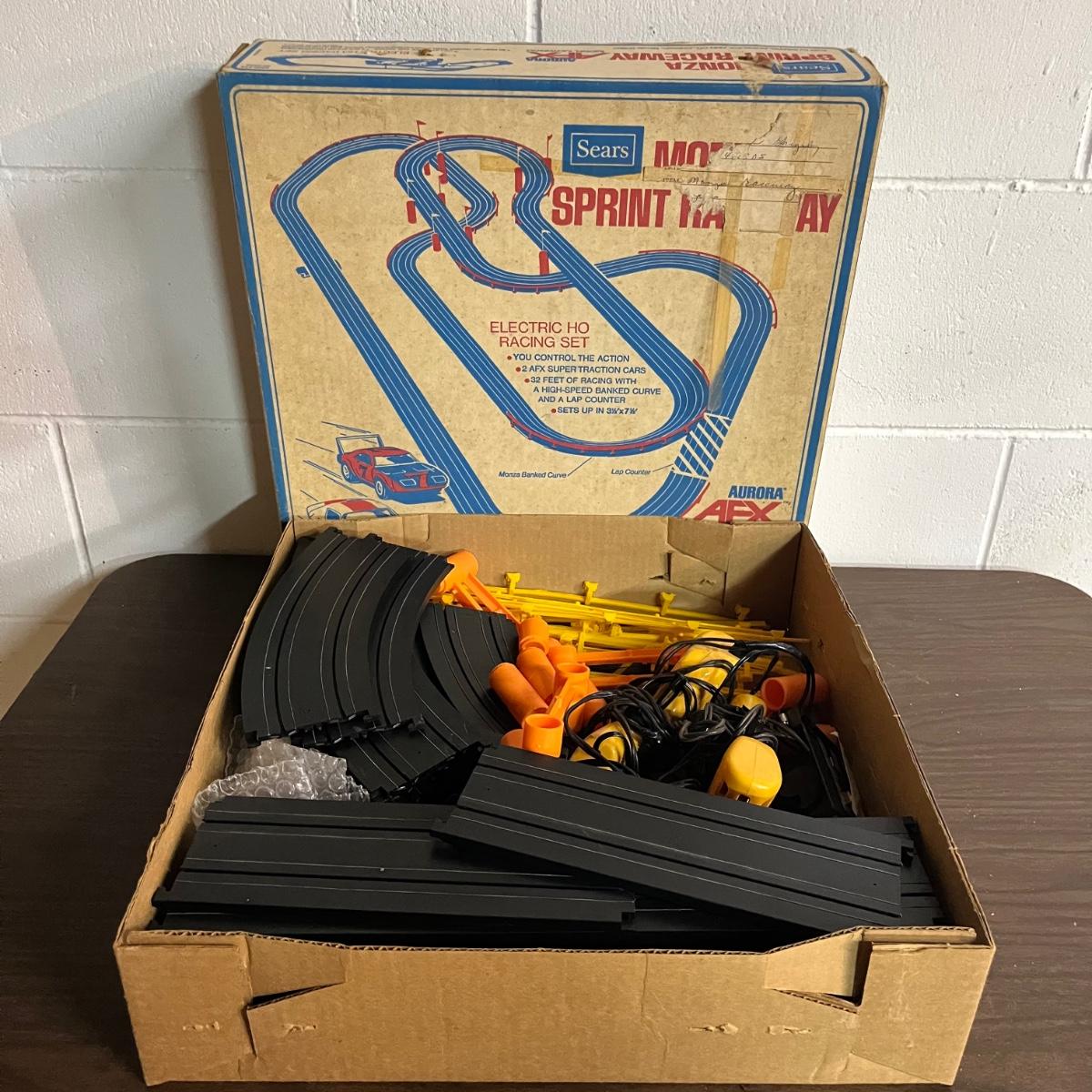 Lot includes a Sears Monza Sprint Raceway Aurora AFX model motoring track with original box.