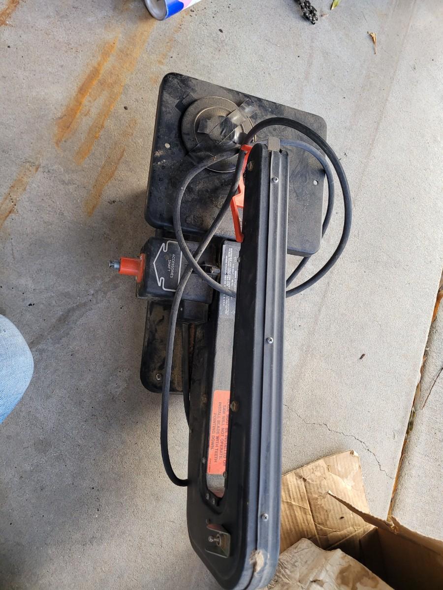 Includes original owner's manual and replacement blades, The round thing taped to it is the sanding disk.