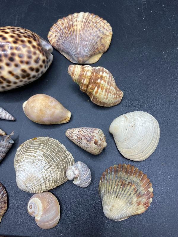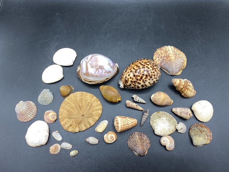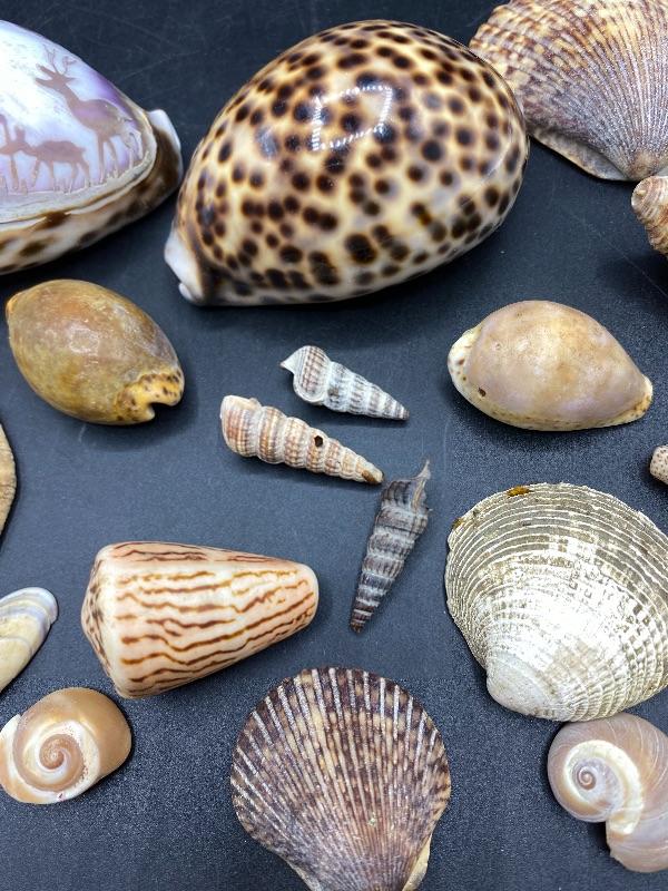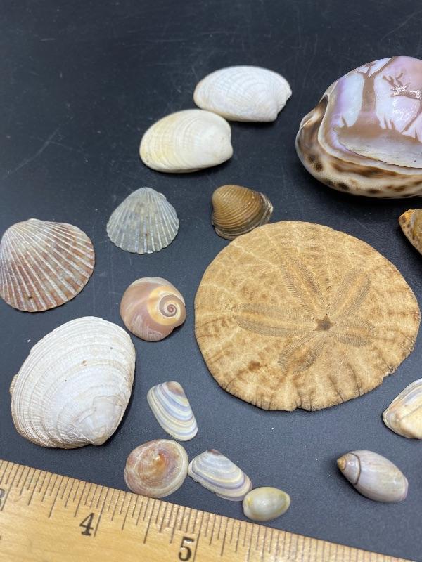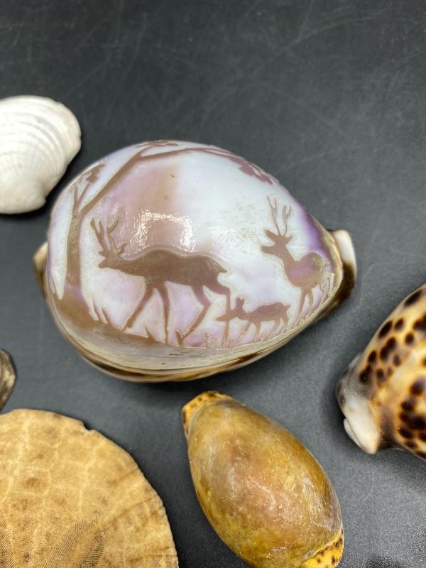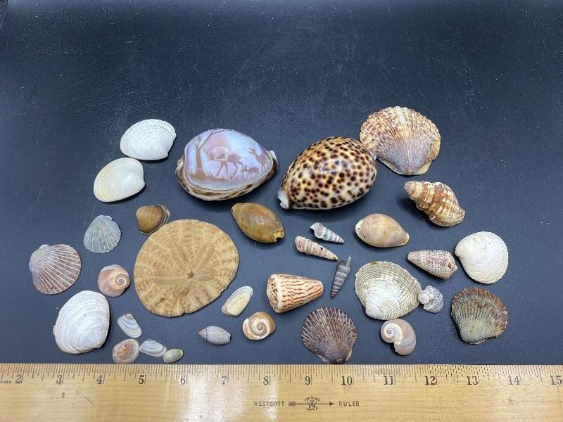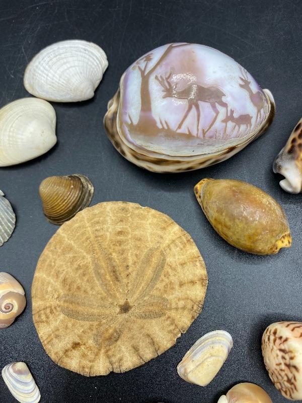 Lot of Seashells. Nice collection, includes a sand dollar and a scene carved shell.
