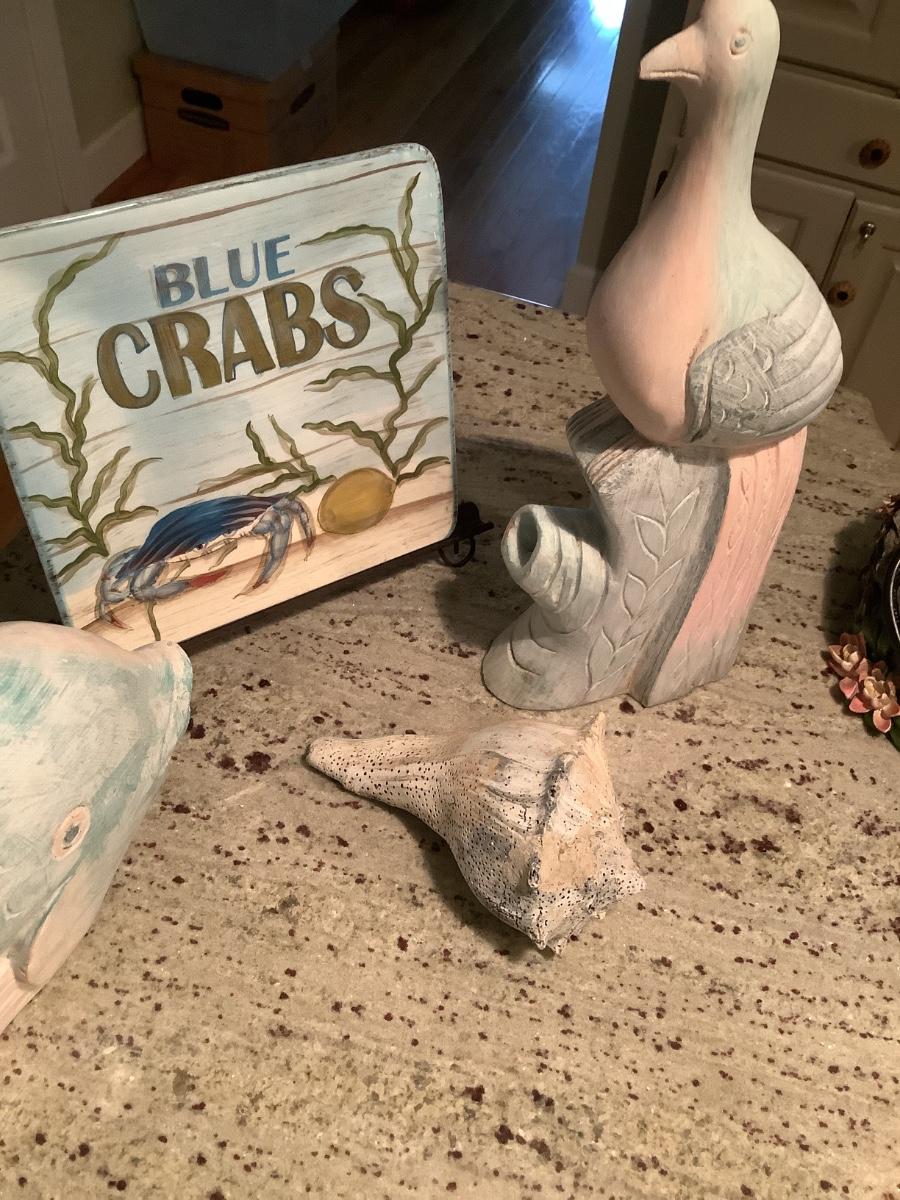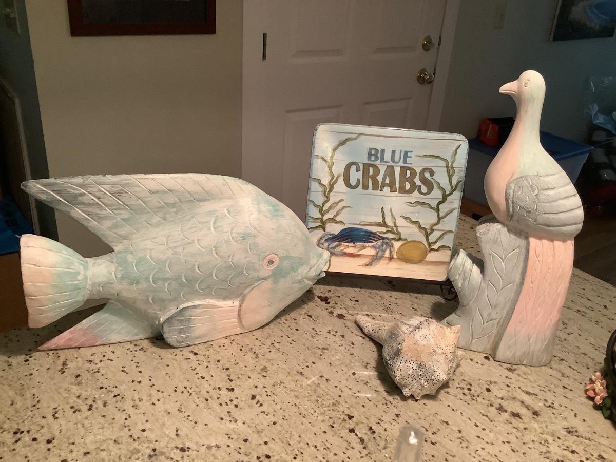 Seashells by the seashore lot- blue crabs plate & stand, fish, bird