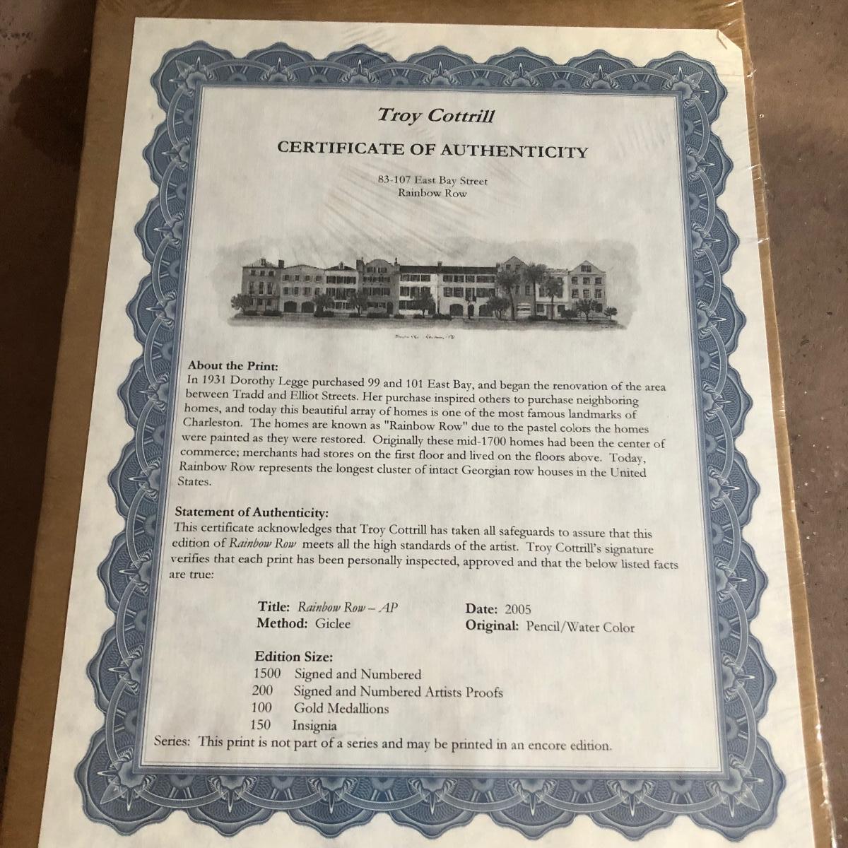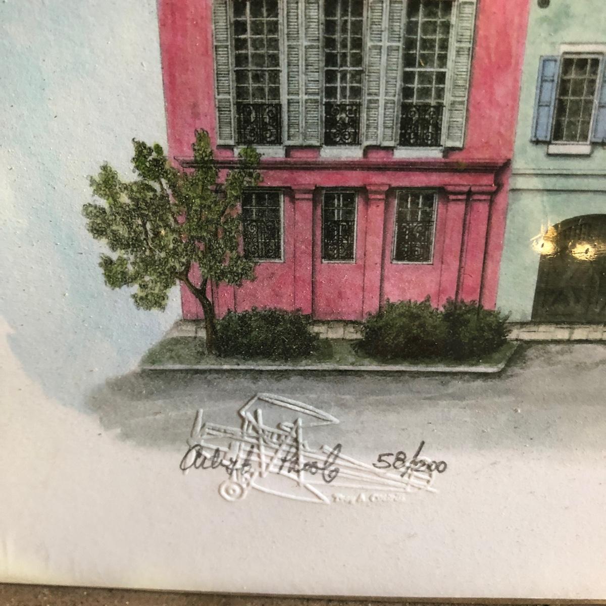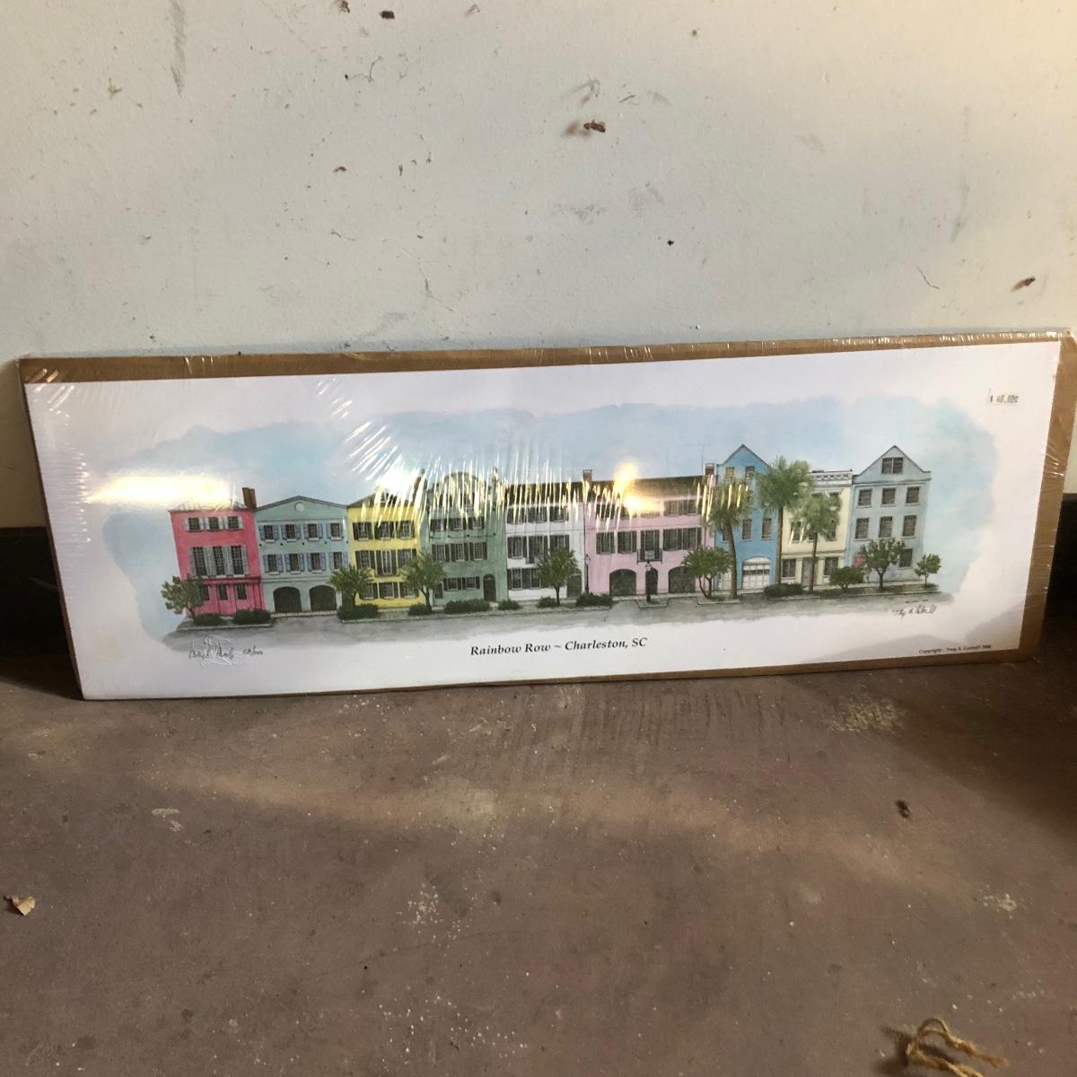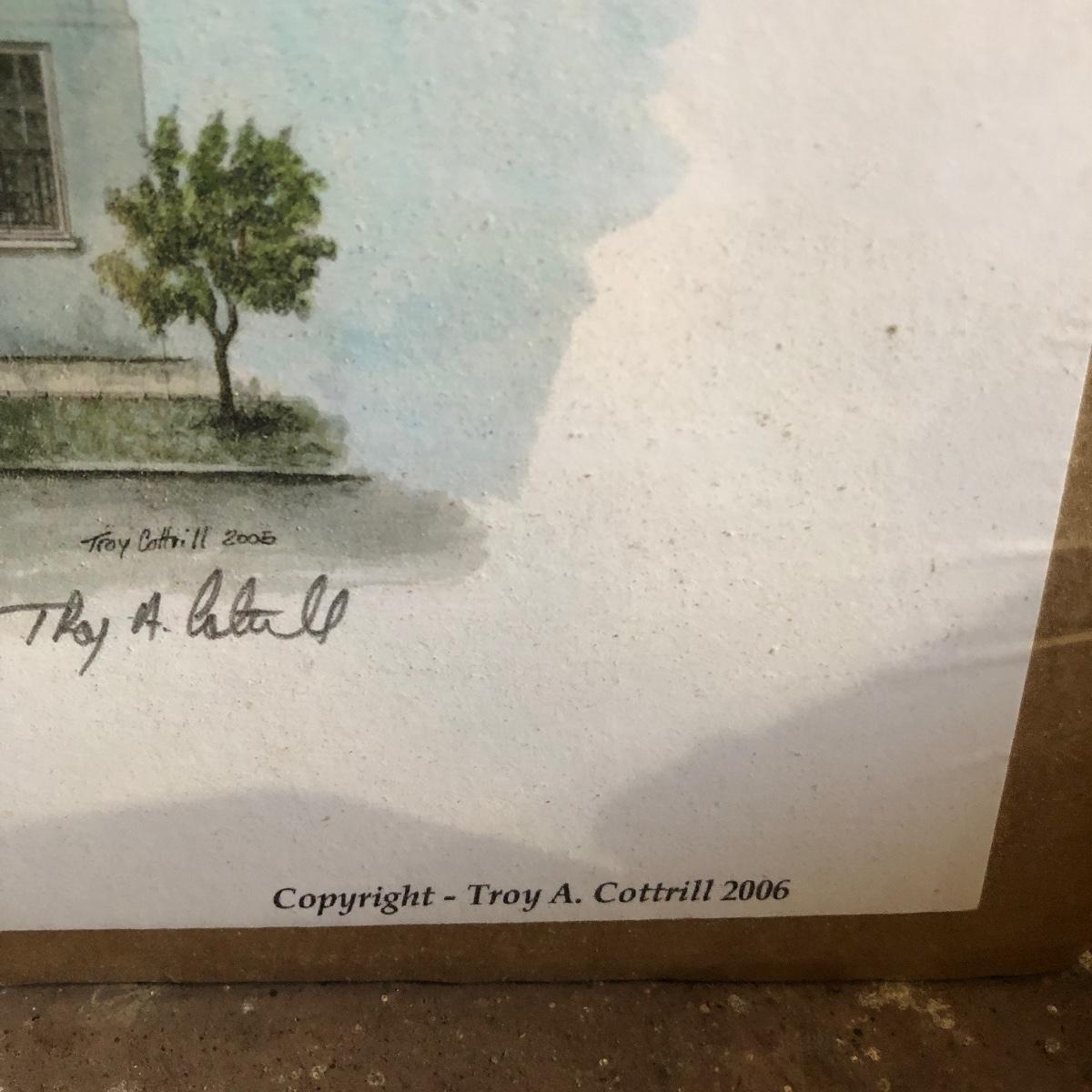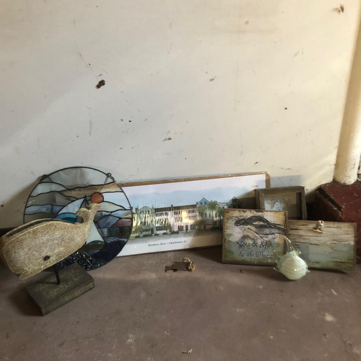 Lot includes Troy Cottrill pencil signed and numbered print, with COA, titled “ Rainbow Row - Charleston SC”. Also a glass fish, stained glass, a metal fish ornament, a resin whale figurine, a shadow box, and a Primitives by Kathy wooden artwork. Stained glass has crack and glass is a little loose at top, see pictures. Stained glass measures 12”D.