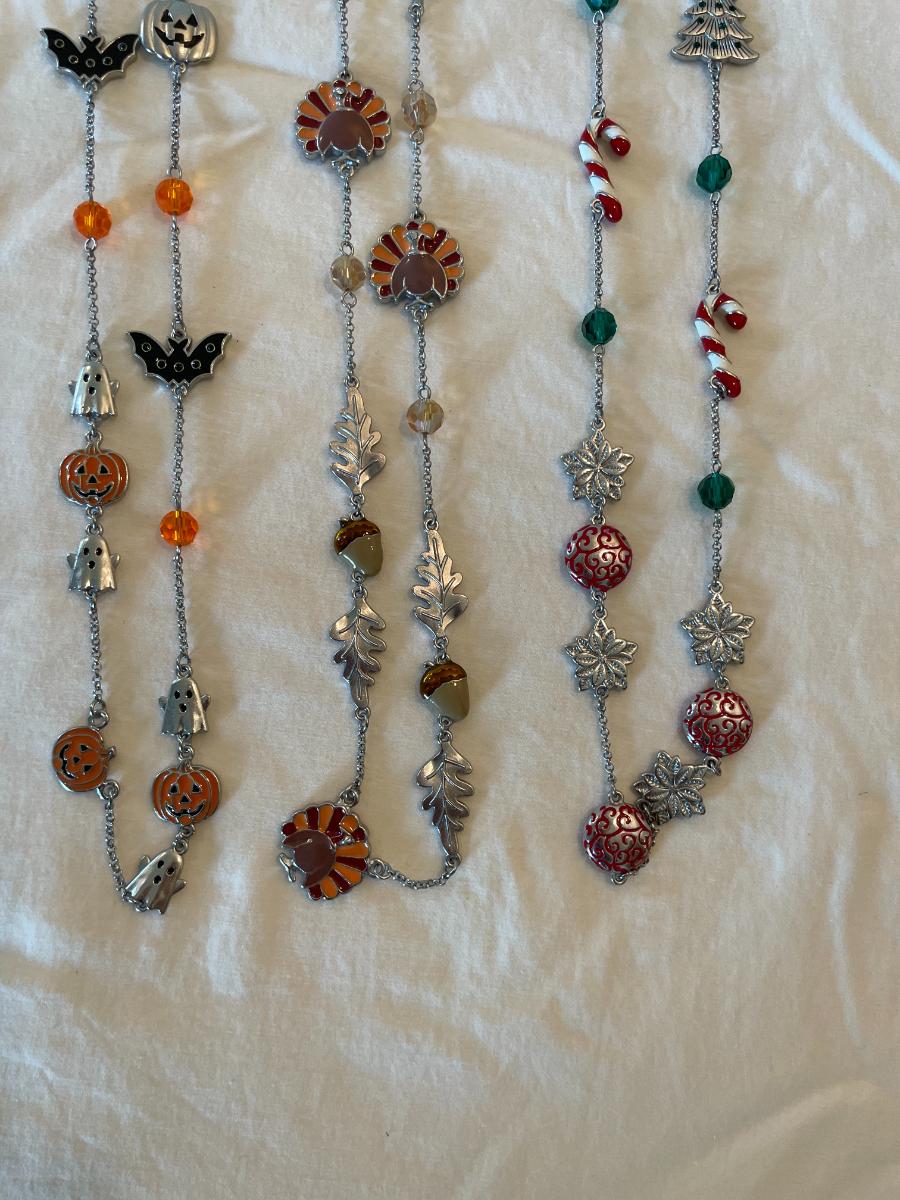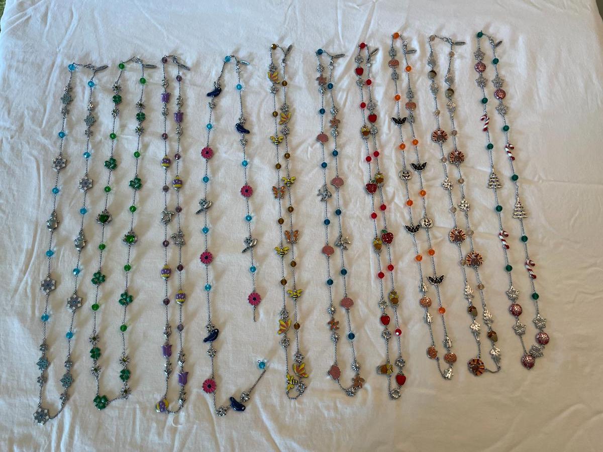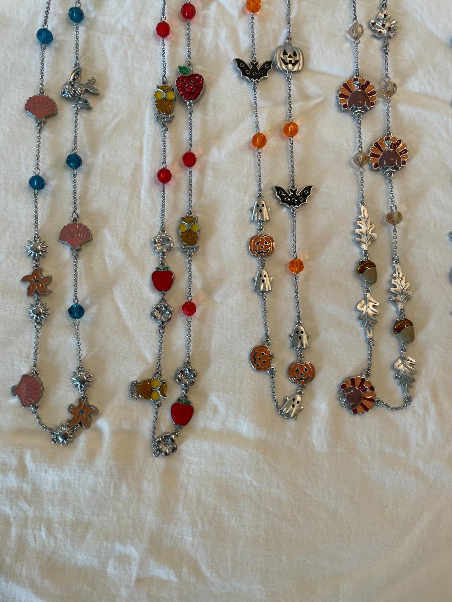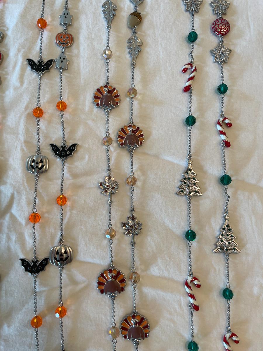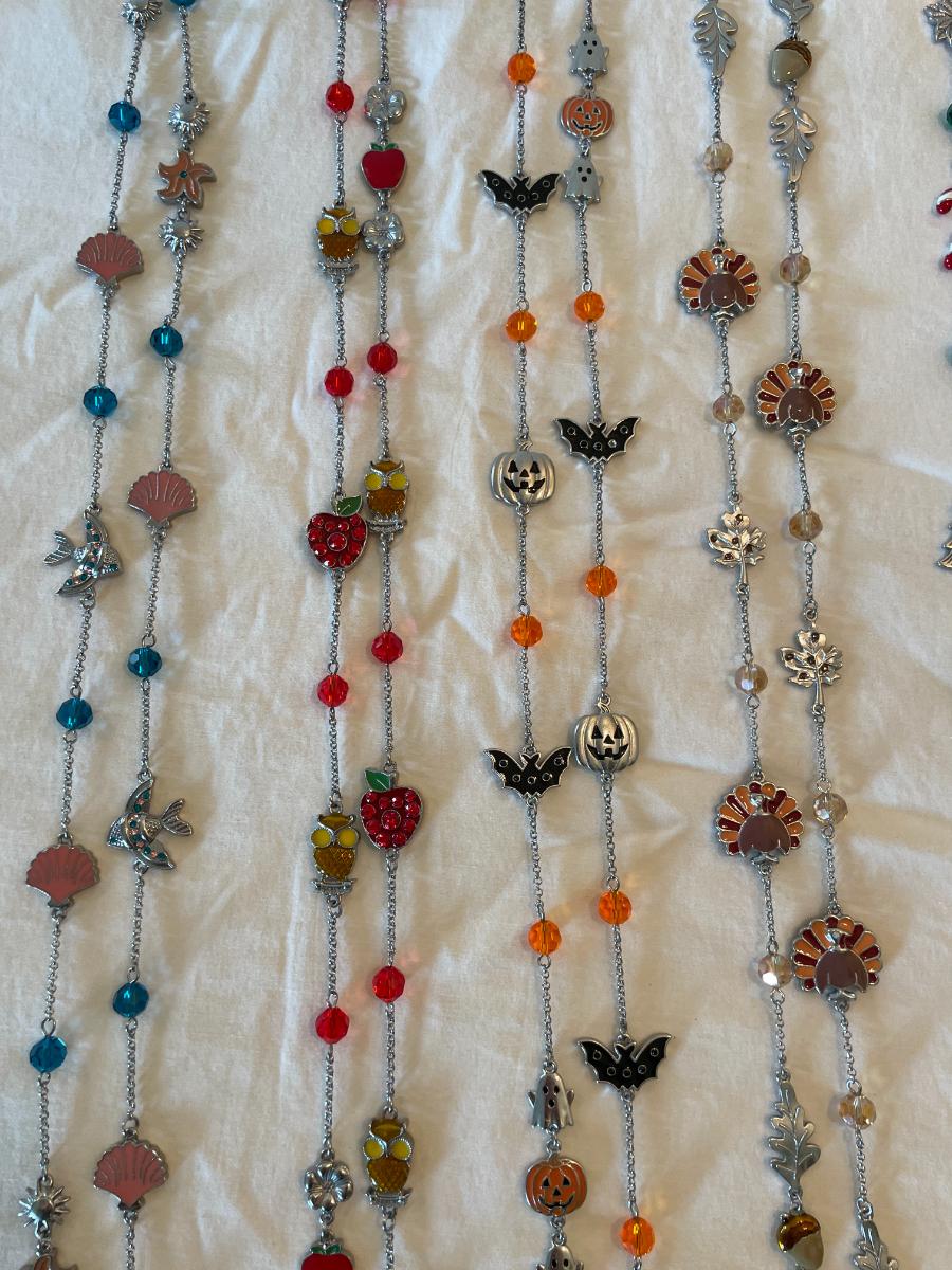 A diverse collection of themed and seasonal necklace chains featuring a variety of charms and beads. Themes include seasonal elements such as Halloween, Christmas, and springtime, with charms such as pumpkins, bats, Christmas trees, candy canes, flowers, butterflies, and more. The chains are accented with decorative beads in various colors and metallic charm elements. Each necklace includes a clasp with a small charm tag, indicating its month. The lot includes several unique pieces, perfect for festive or thematic wear. One shows a broken chain link.