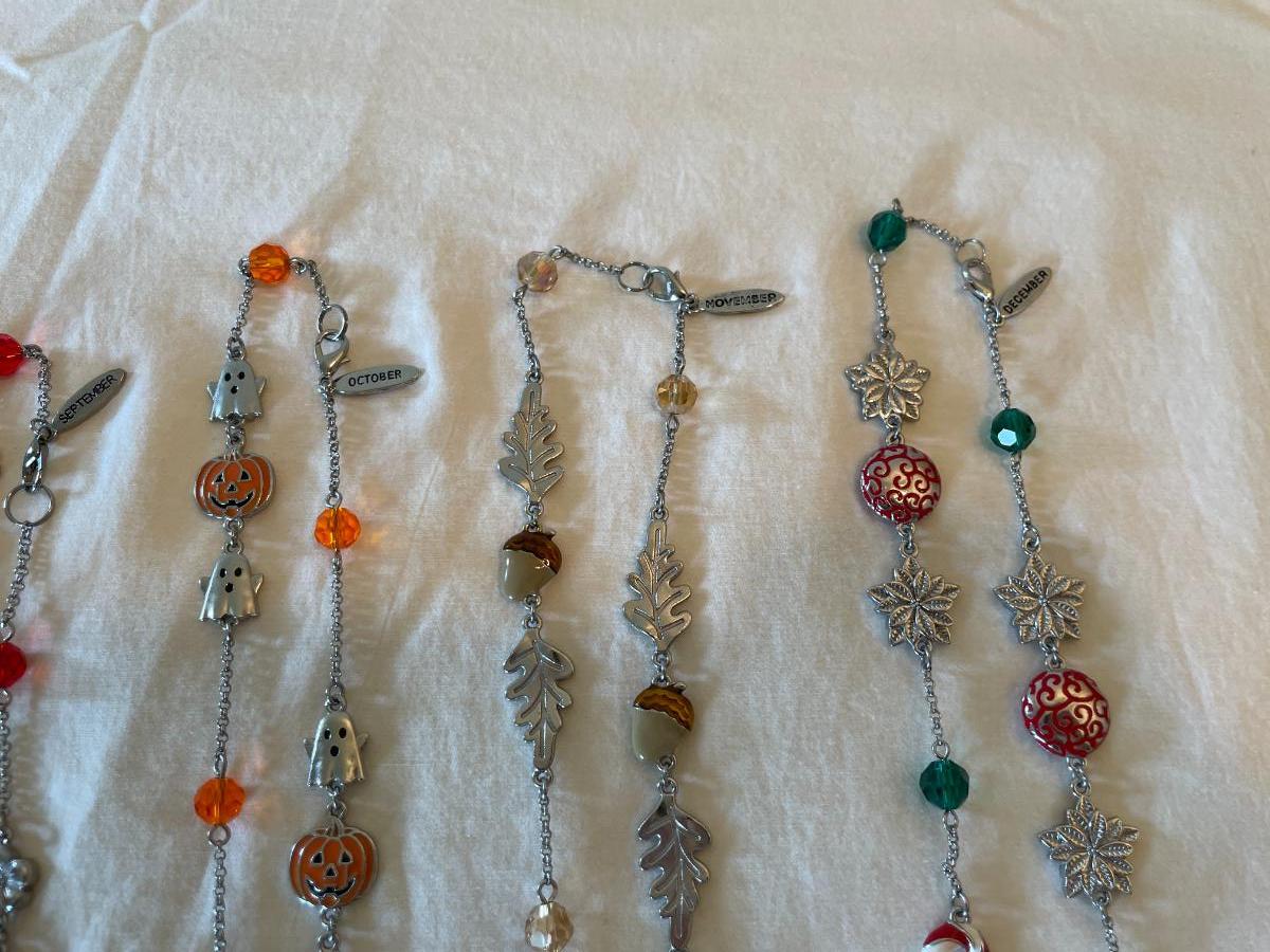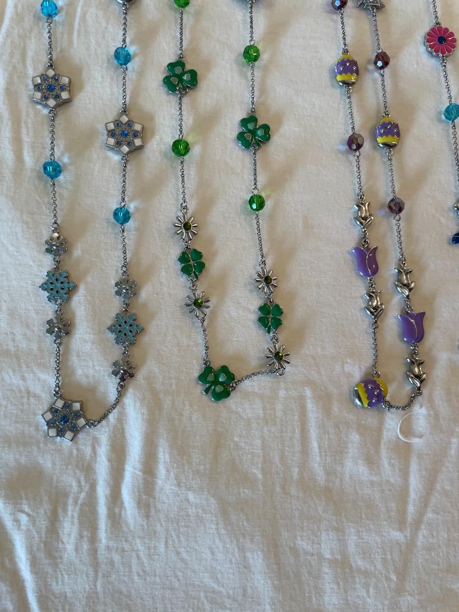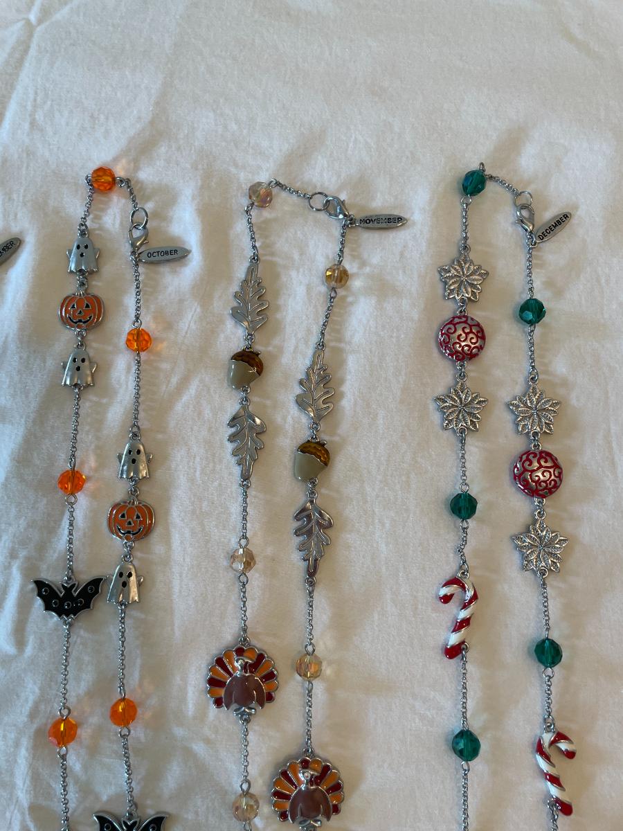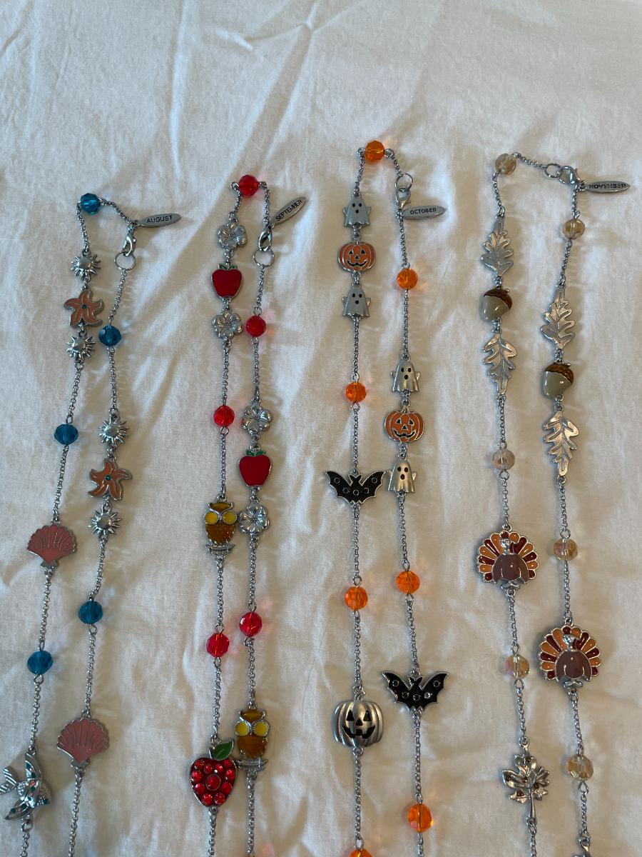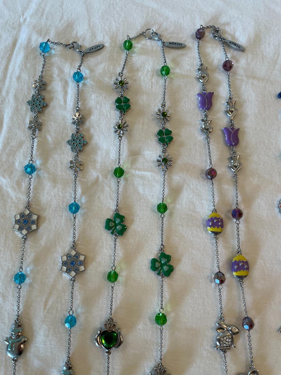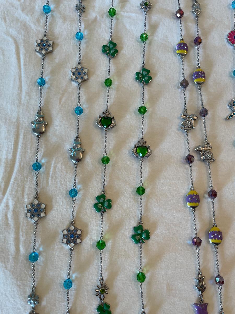 A diverse collection of themed and seasonal necklace chains featuring a variety of charms and beads. Themes include seasonal elements such as Halloween, Christmas, and springtime, with charms such as pumpkins, bats, Christmas trees, candy canes, flowers, butterflies, and more. The chains are accented with decorative beads in various colors and metallic charm elements. Each necklace includes a clasp with a small charm tag, indicating its month. The lot includes several unique pieces, perfect for festive or thematic wear. One shows a broken chain link.
