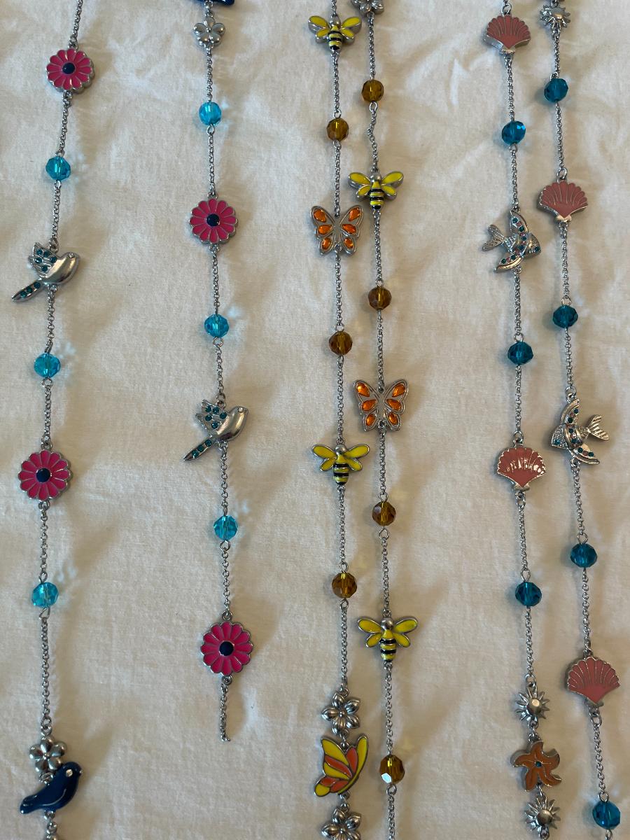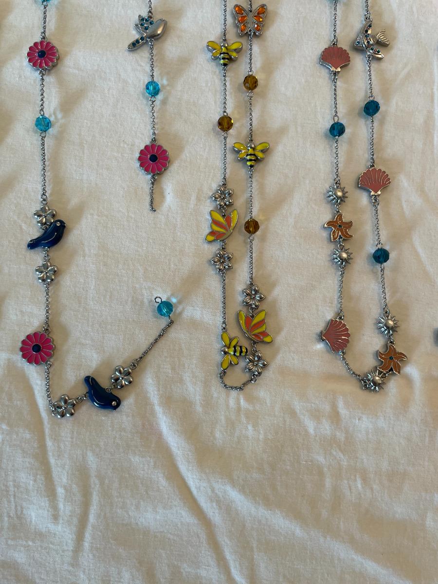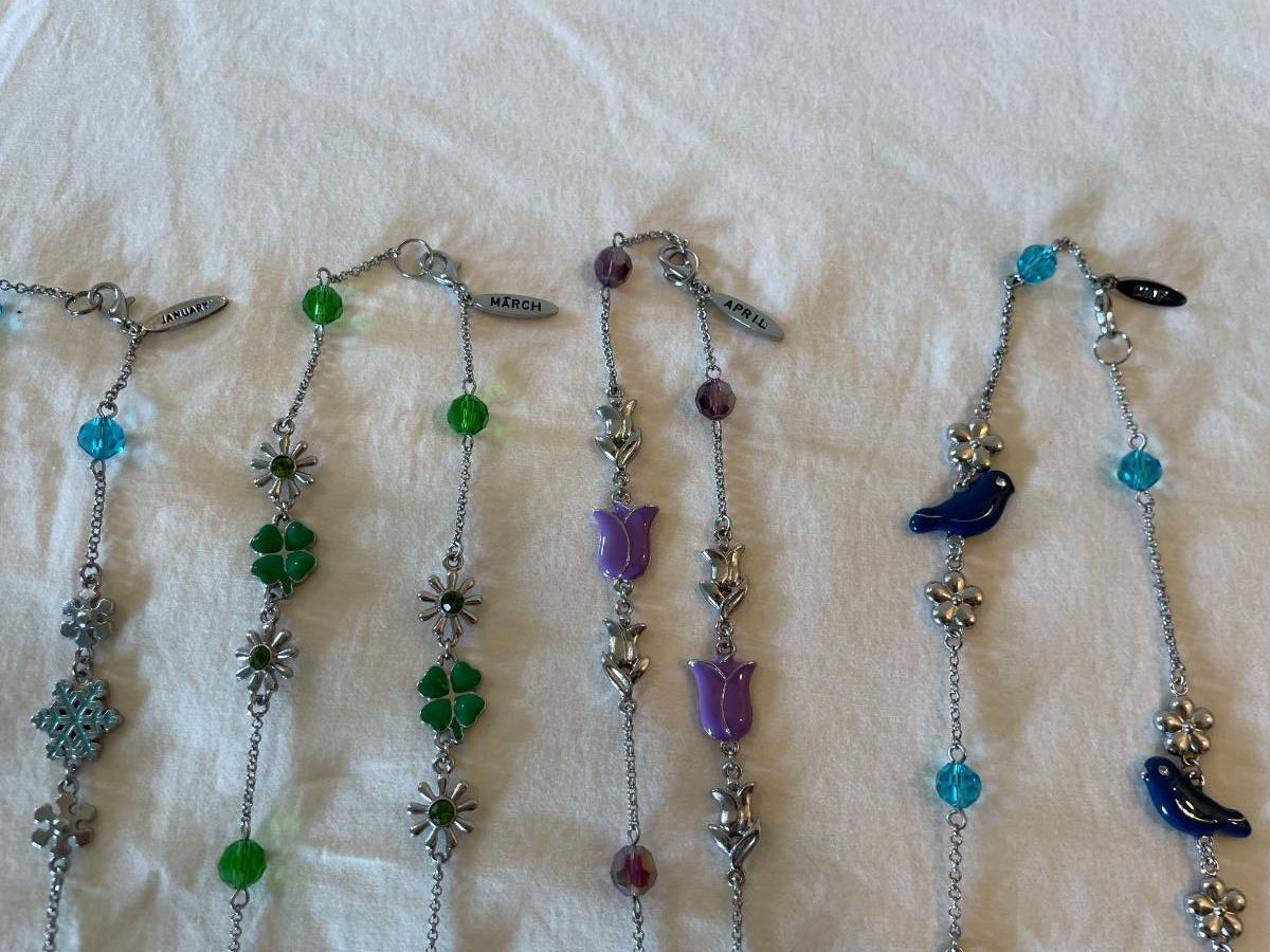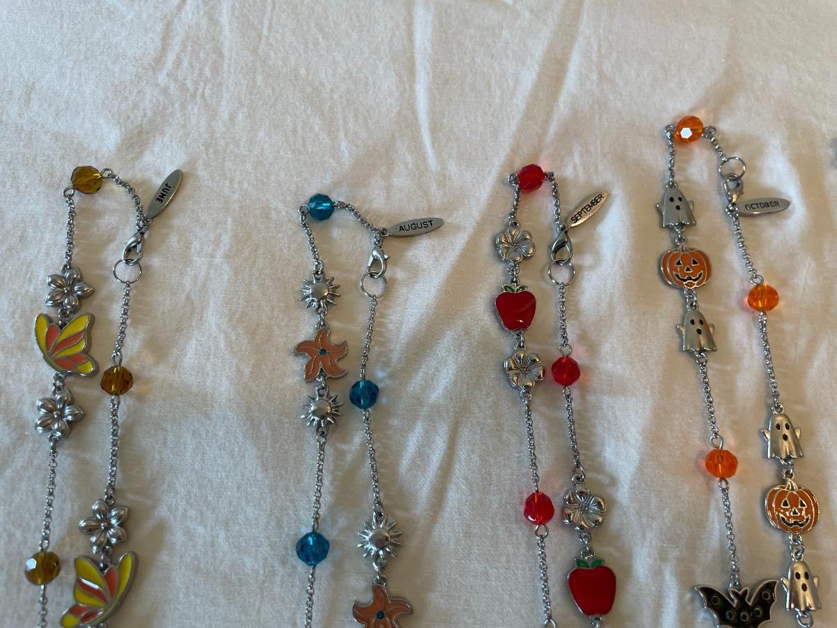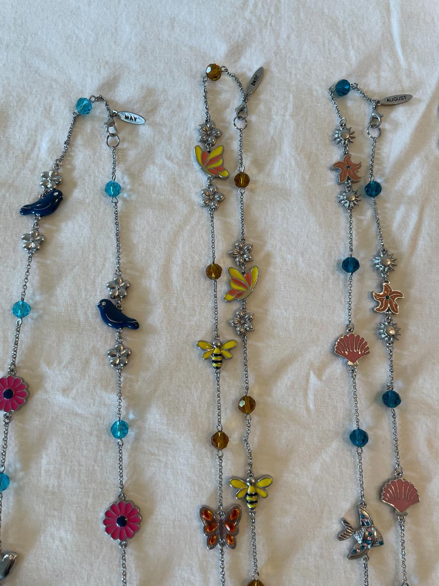A diverse collection of themed and seasonal necklace chains featuring a variety of charms and beads. Themes include seasonal elements such as Halloween, Christmas, and springtime, with charms such as pumpkins, bats, Christmas trees, candy canes, flowers, butterflies, and more. The chains are accented with decorative beads in various colors and metallic charm elements. Each necklace includes a clasp with a small charm tag, indicating its month. The lot includes several unique pieces, perfect for festive or thematic wear. One shows a broken chain link.