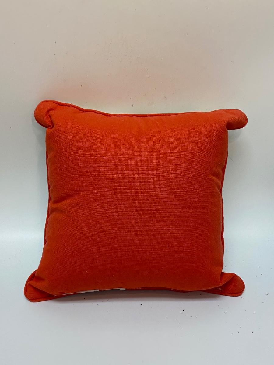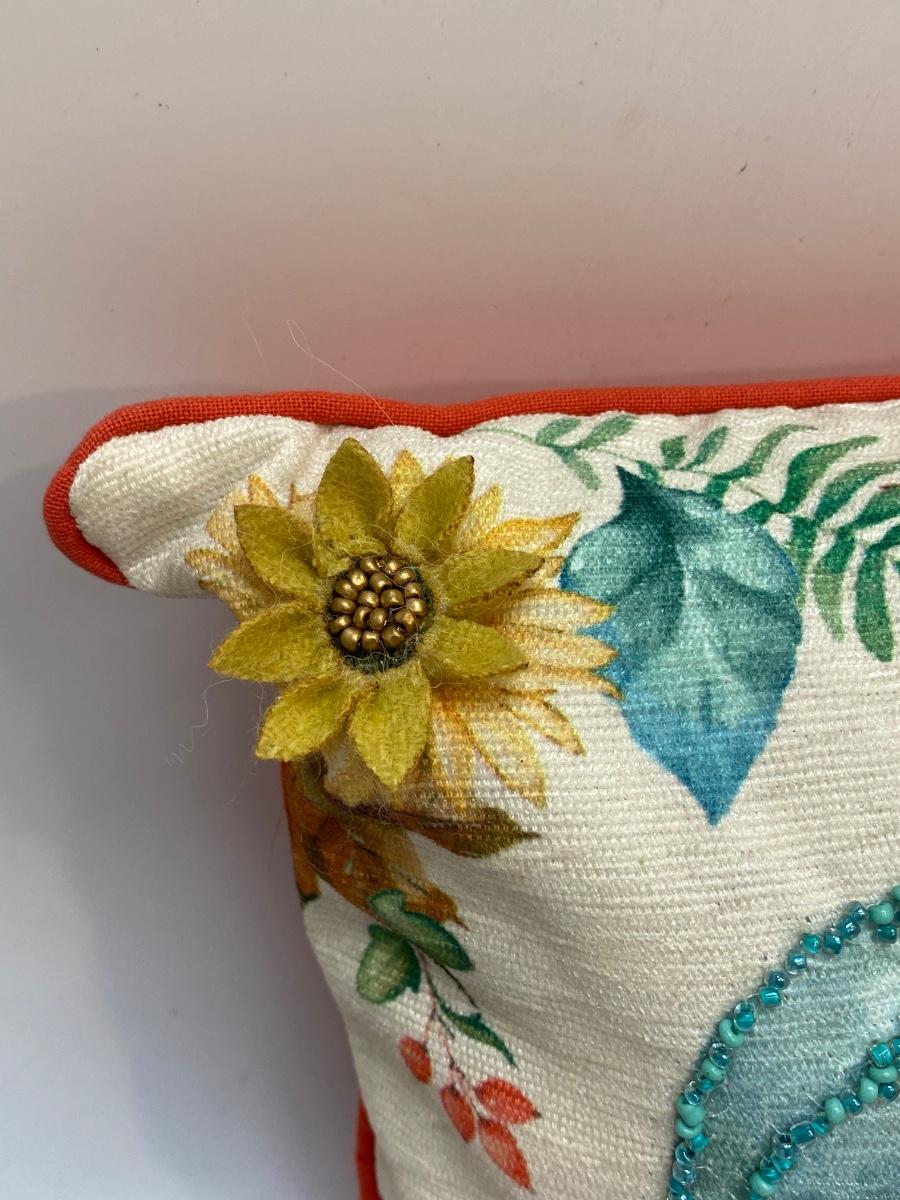 Seasonal beaded pumpkin accent throw pillow. Beaded details and a leather flower at the corner. Good condition.