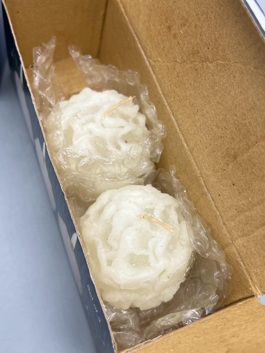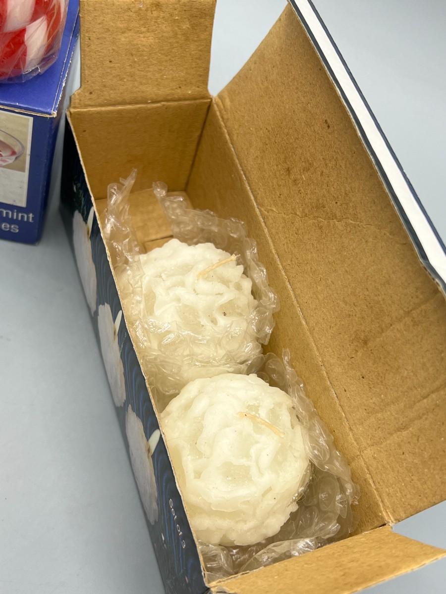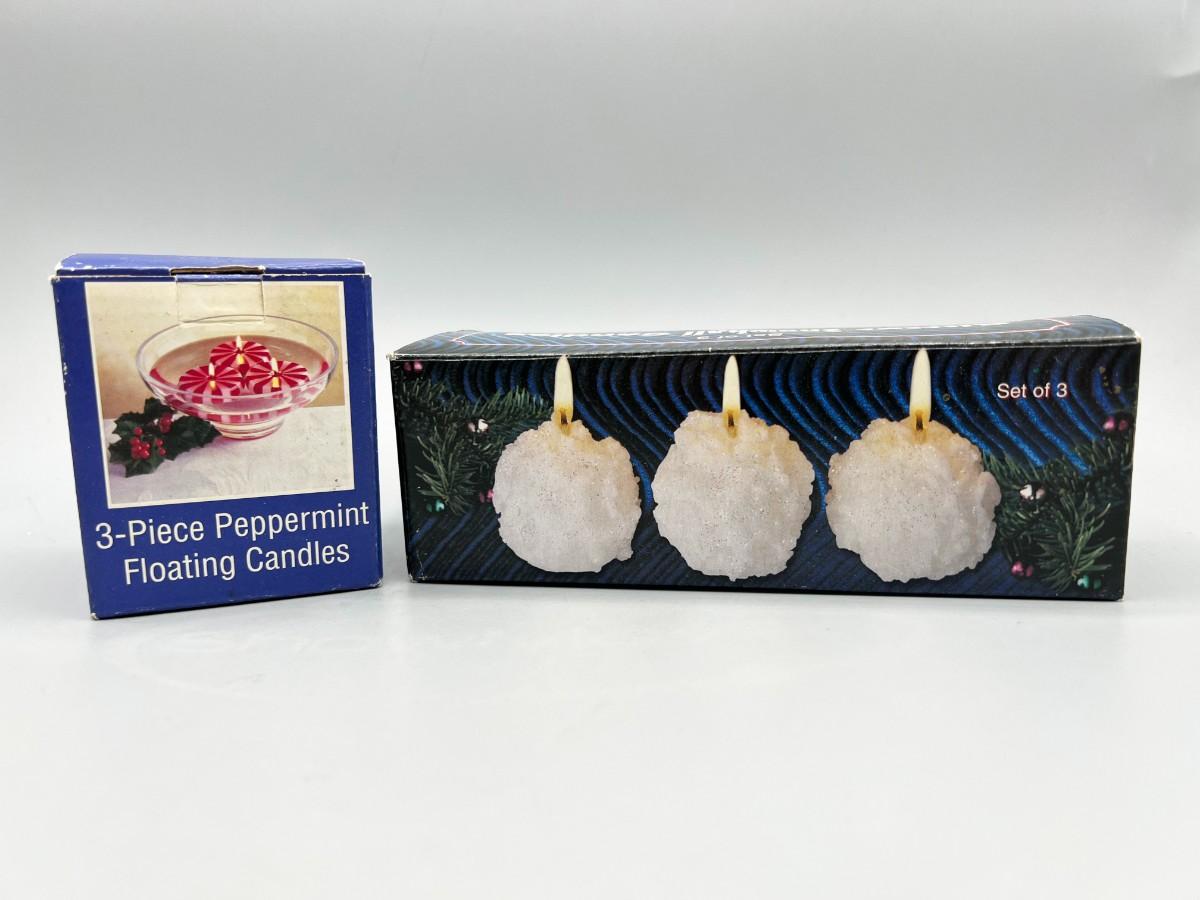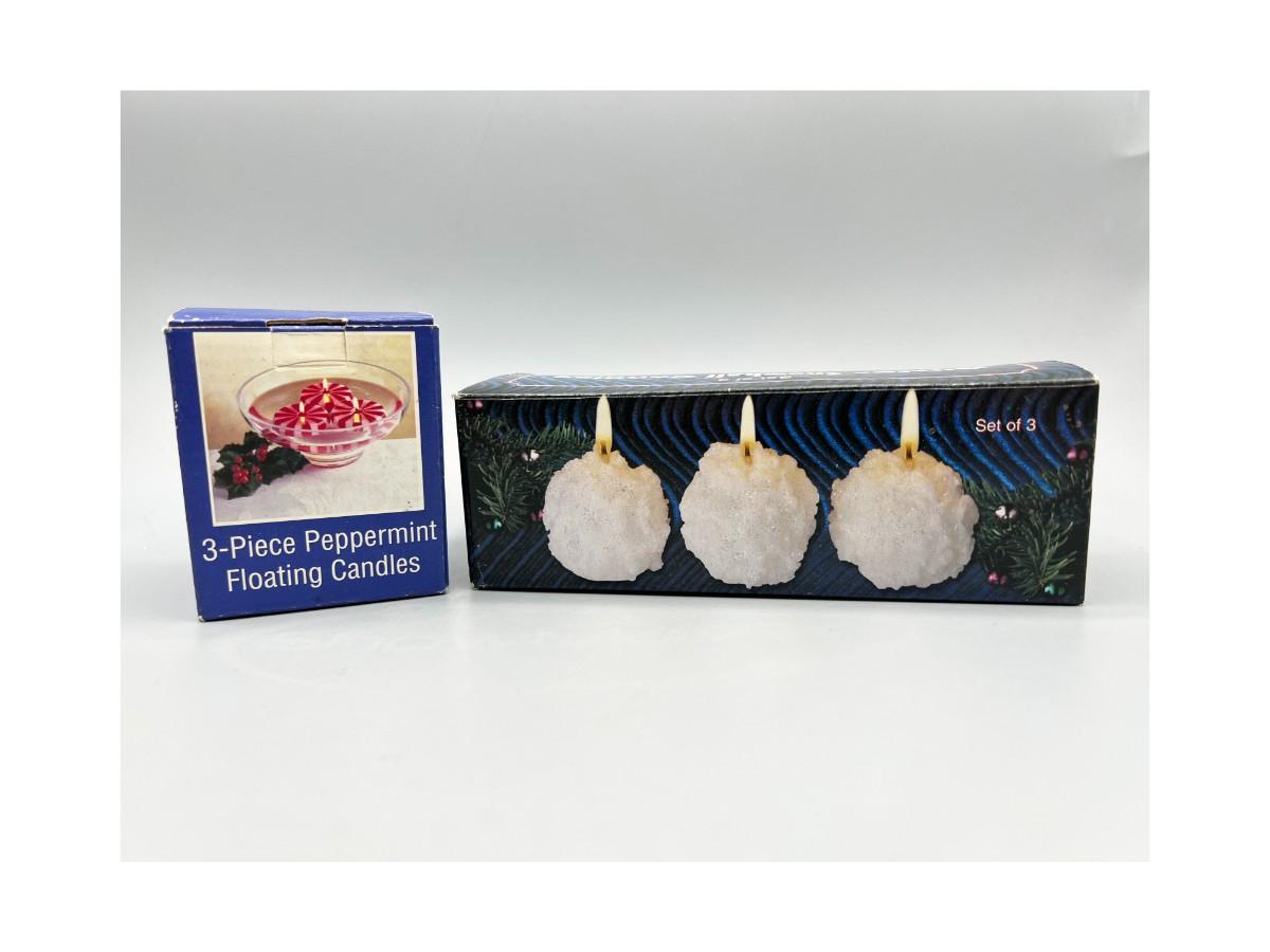 Seasonal Winter Christmas Holiday Candle Lot Peppermints and Snowballs. Snowball set is missing one. Fair aged conditions.