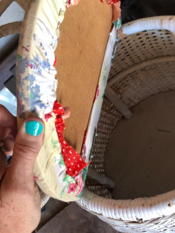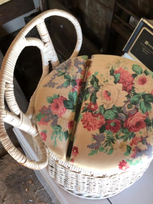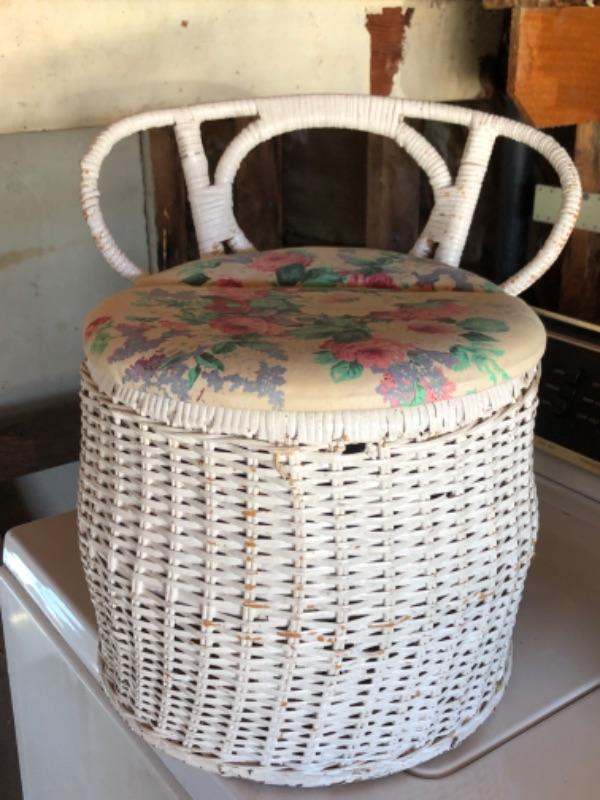 Wicker vanity stool. Seat is hinged for hidden storage. Needs a fresh coat of paint.