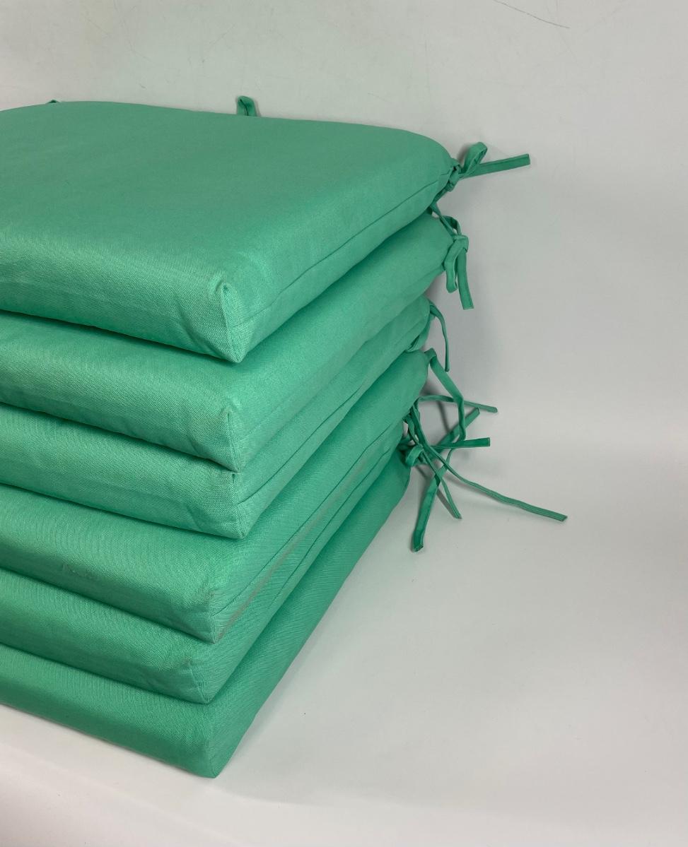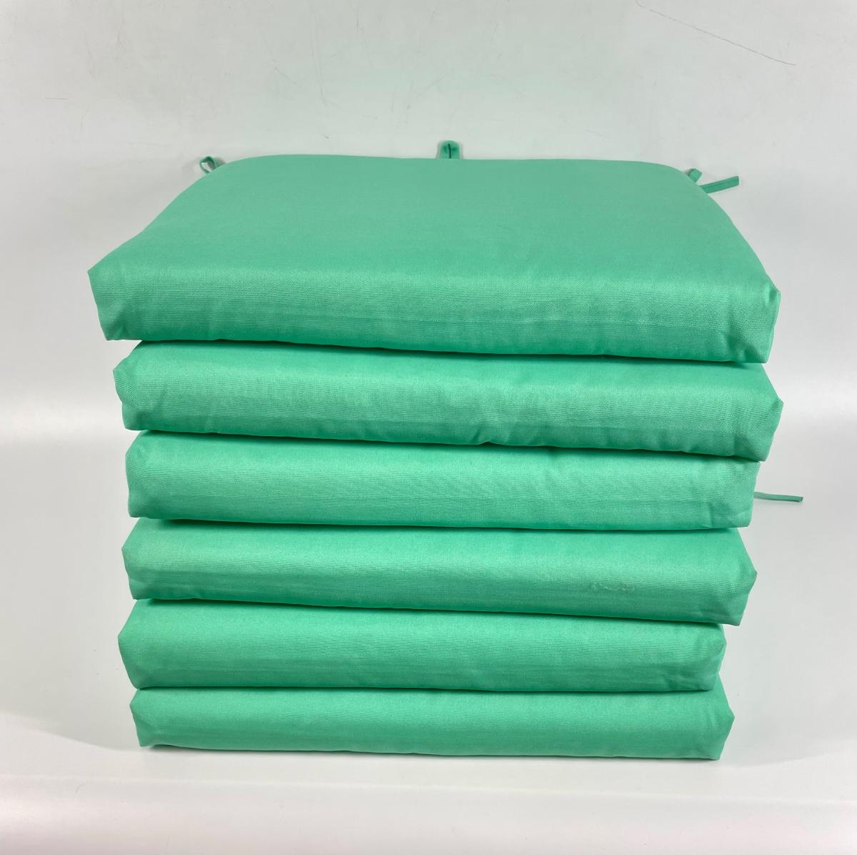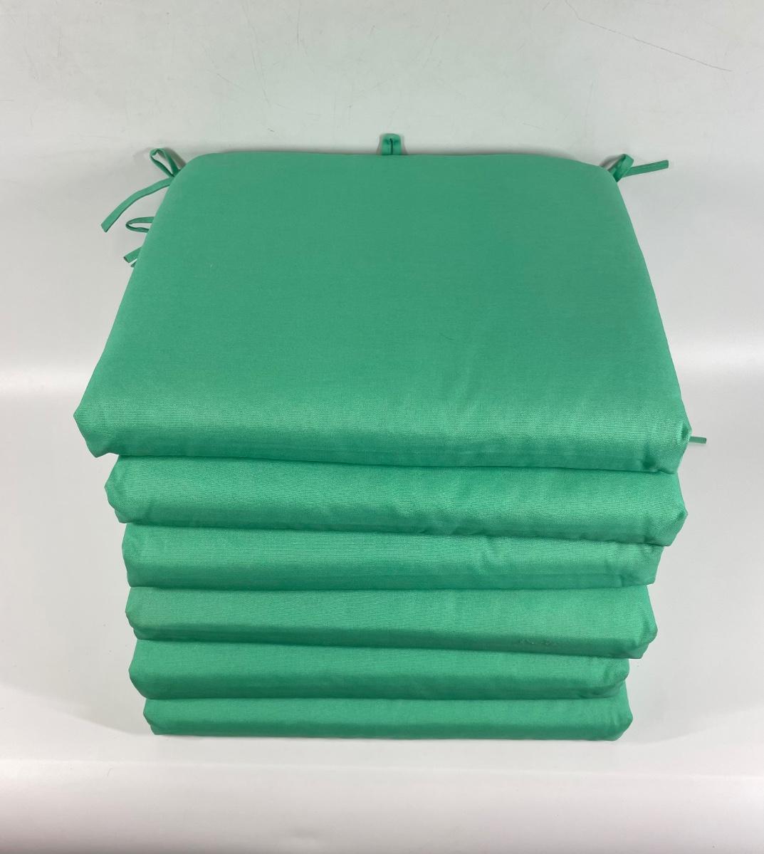 New set of 6 seat cushions for patio chairs. Green, has string ties on the back. Measures approx 16” deep, 18” wide and 2” thick.
