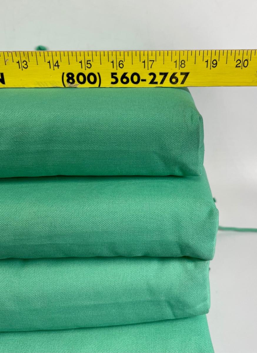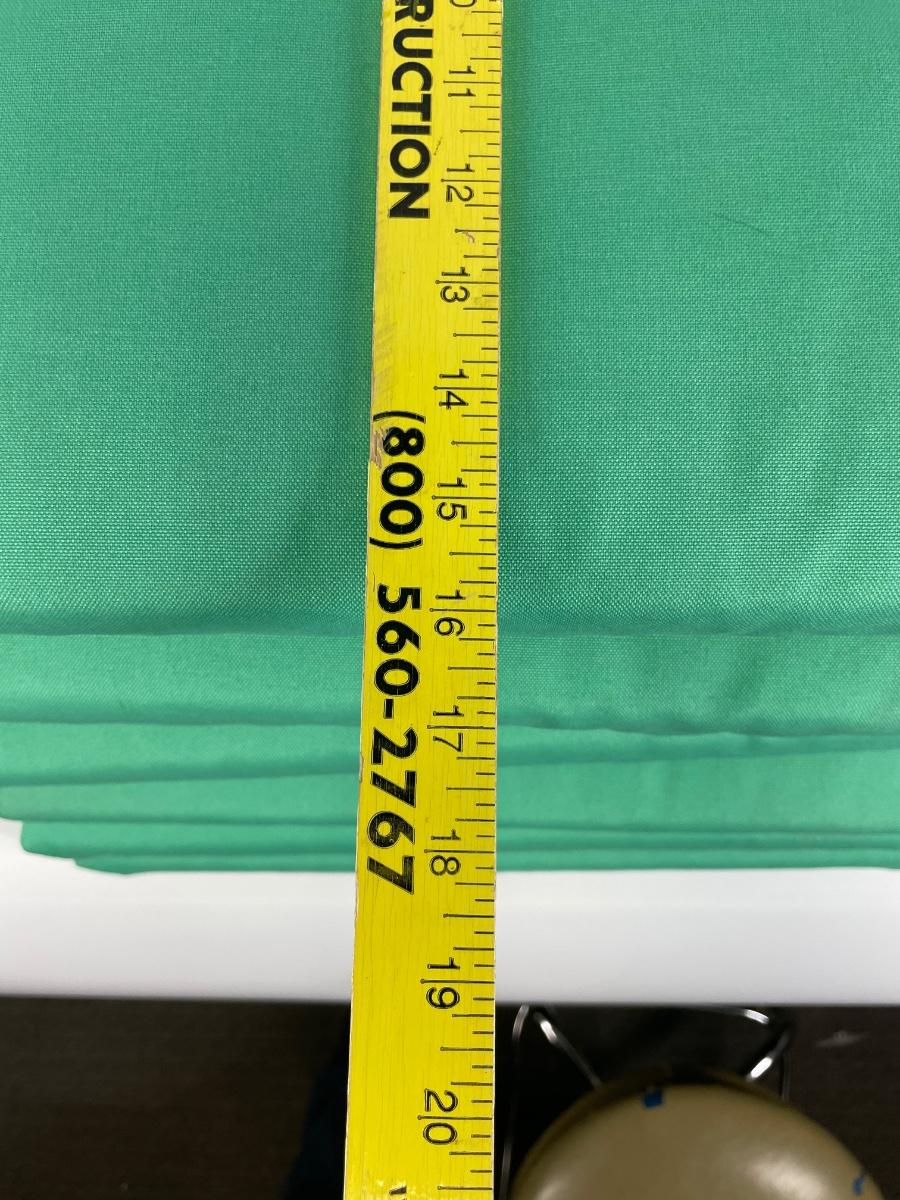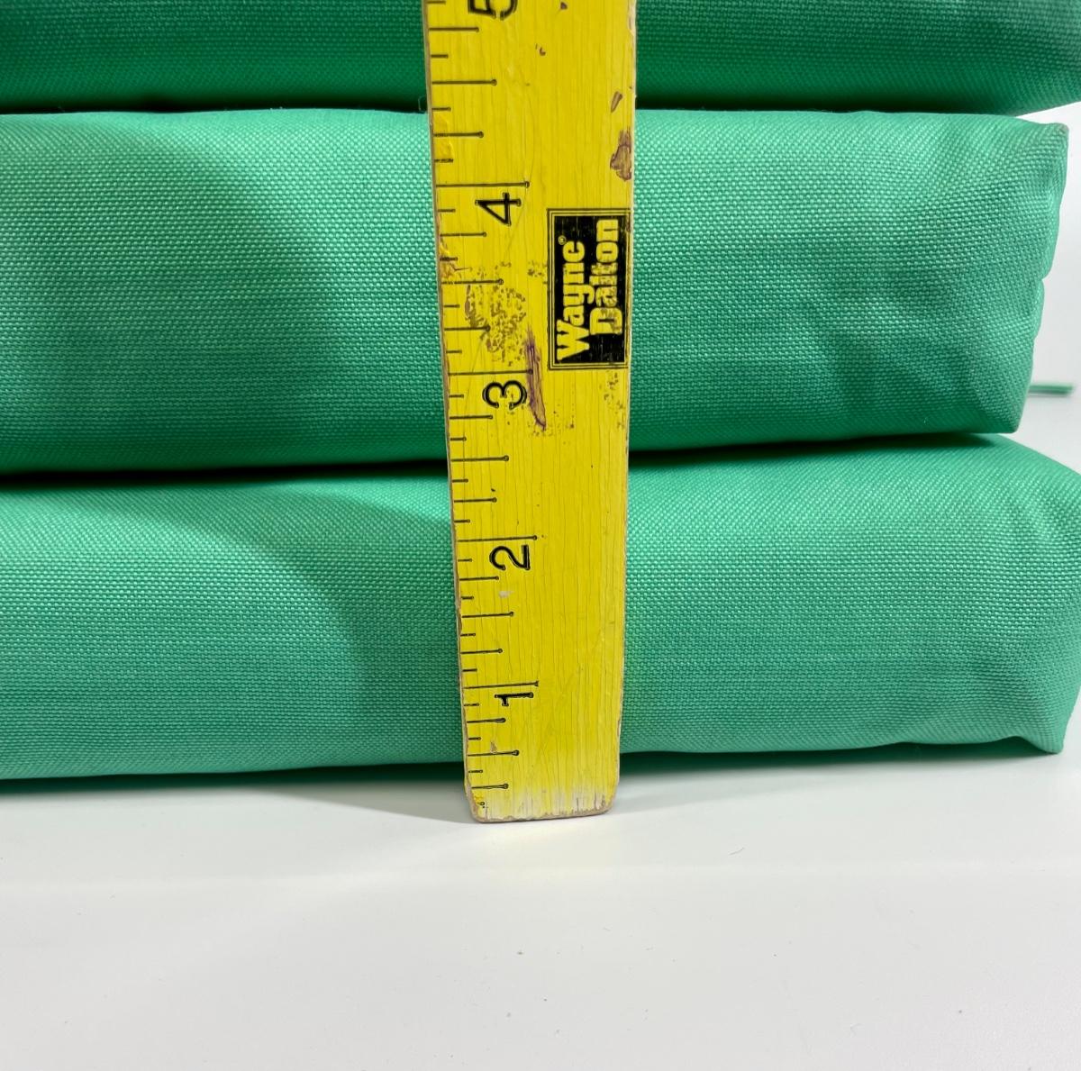 New set of 6 seat cushions for patio chairs. Green, has string ties on the back. Measures approx 16” deep, 18” wide and 2” thick.