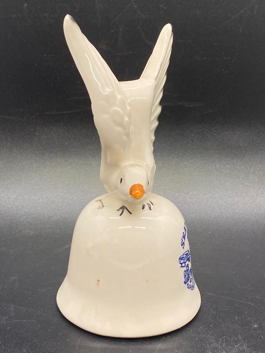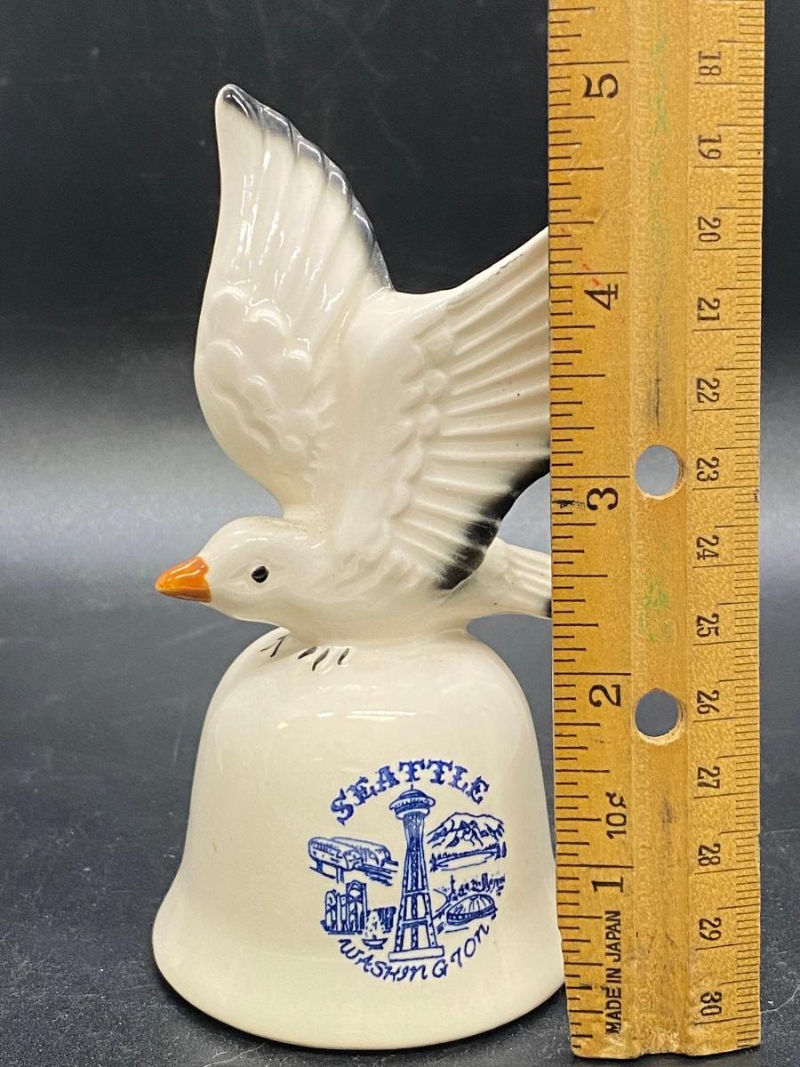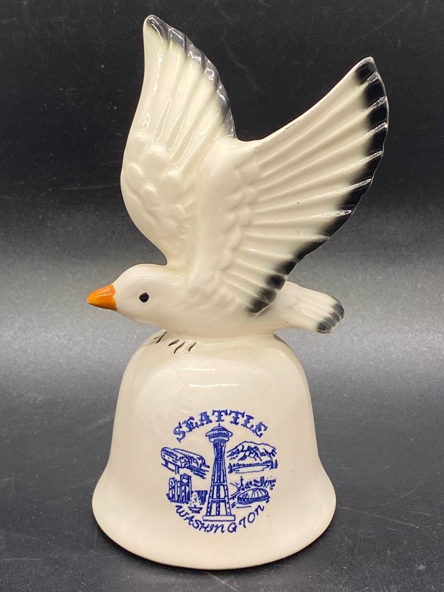 Seattle Washington souvenir ceramic bell. Seagull top with points of interest images on the bell. In good condition, no chips.