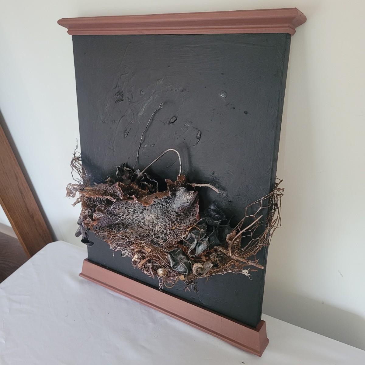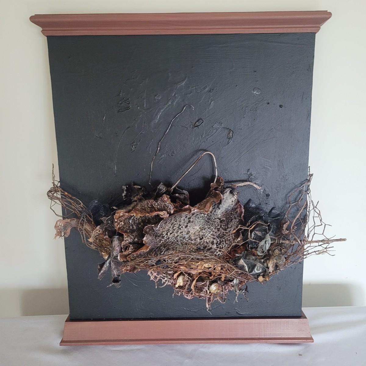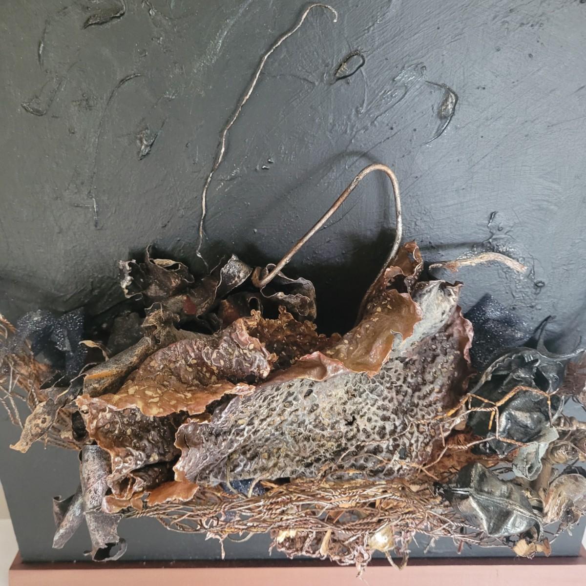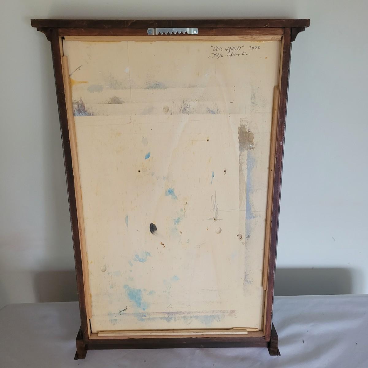 This lot includes two original pieces of wall art titled "Seaweed" by Asheville, NC local artist Joyce Blunk. The pieces are mixed media, containing elements of woodwork, sculpture, and other natural materials. They depict dried seaweed and other organic material mounted on wood. One of the pieces is signed, titled, and dated by the artist on the backside. The larger one measures 17" x 22"H.